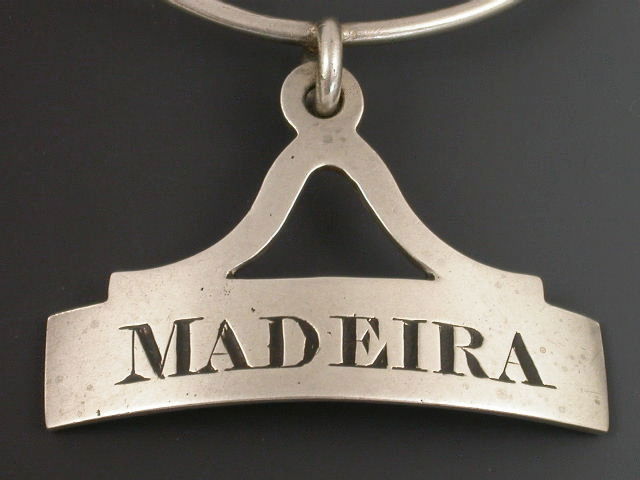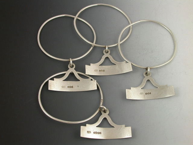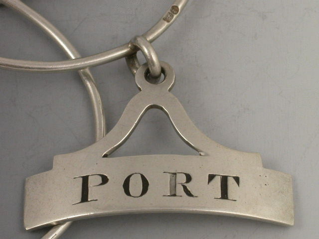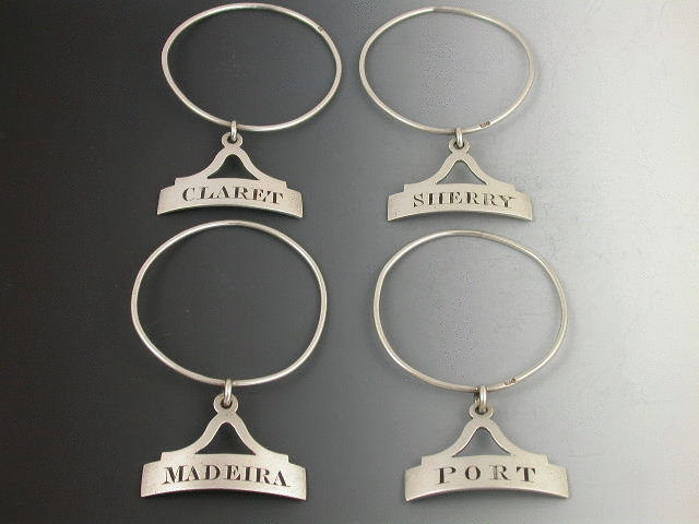 A very fine set of four early Victorian heavy cast silver Wine Labels of neck ring form, the plain narrow rectangular labels with pierced domed surmounts and solid circular silver wire suspension rings, engraved and niello filled for PORT, SHERRY, MADEIRA and CLARET.