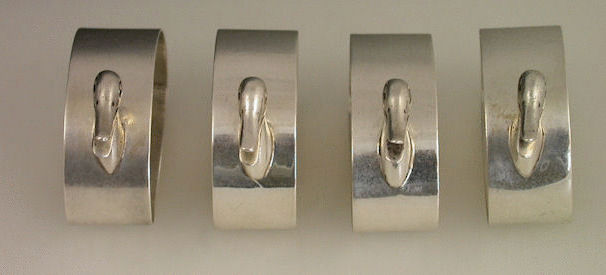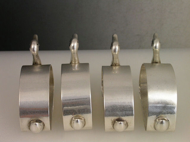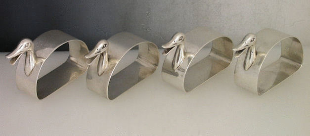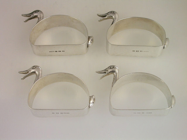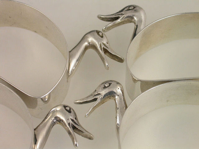 A rare set of 4 mid 20th century Novelty silver Napkin Rings, stylistically modelled as quacking Ducks.