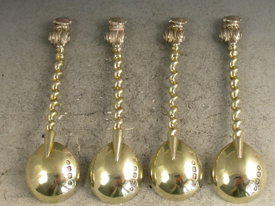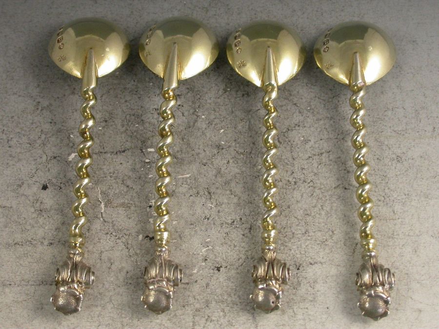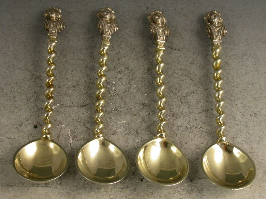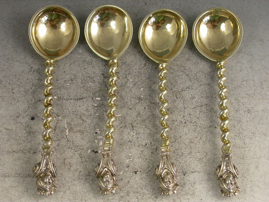 A set of four fine quality Victorian silver gilt Salt Spoons with oval bowls and barely twist stems, the cast finials depicting Courtiers.