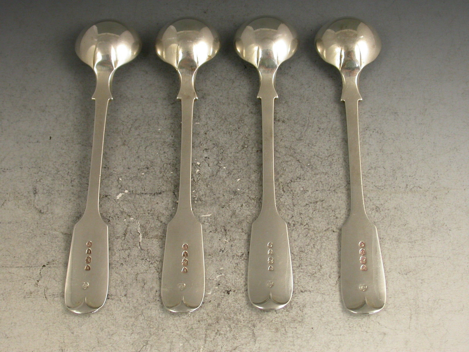 A good set of four Victorian silver Salt Spoons of plain fiddle pattern with circular bowls, the handles engraved with The Crest of Smith, Viscount Hambleden of County Buckingham (A Cubit Arm erect habited Azure cuffed and charged with three Mascles in chevron Argent holding in the hand proper three Branches of Oak Vert fructed Or)