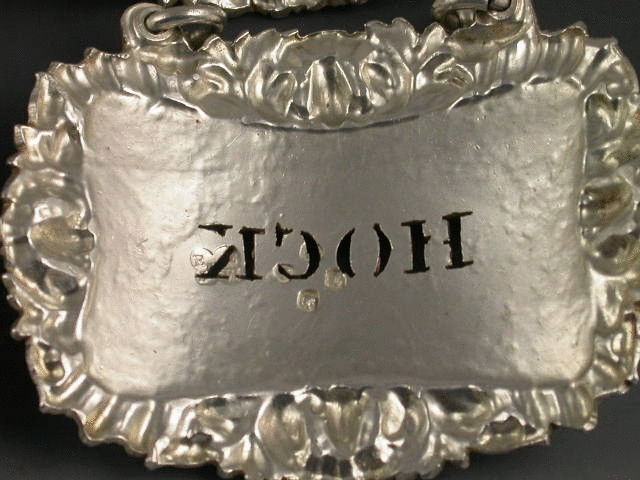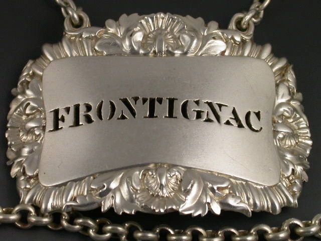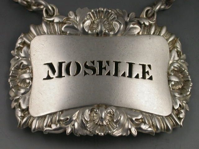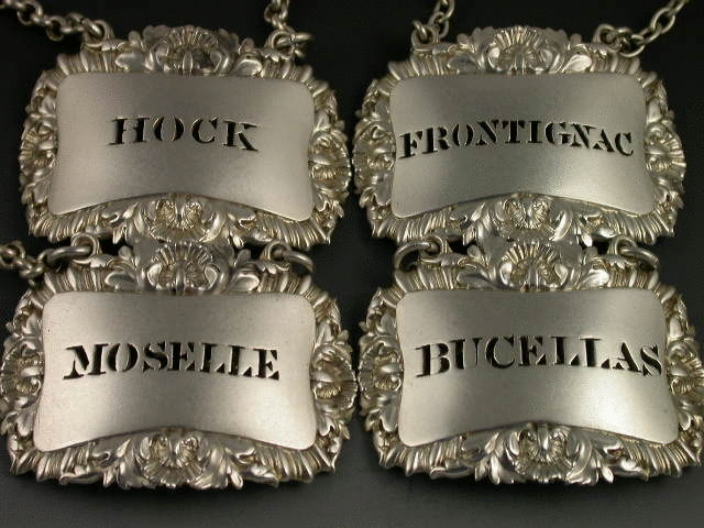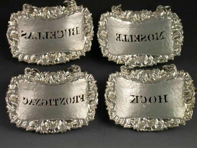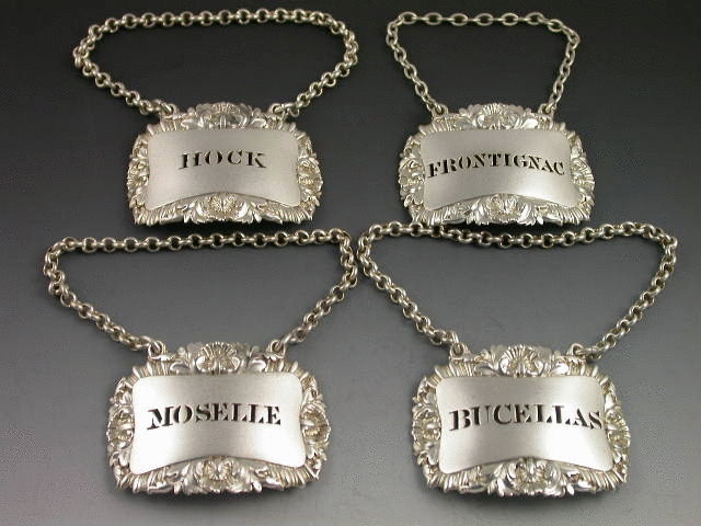 A good quality set of four early Victorian heavy die-stamped or possibly cast, silver Wine Labels, of curved shaped rectangular form with shell, acanthus leaf and gadrooned borders. Pierced for FRONTIGNAC, BUCELLAS, MOSELLE and HOCK. (Note the miss spelling of Frontiniac)