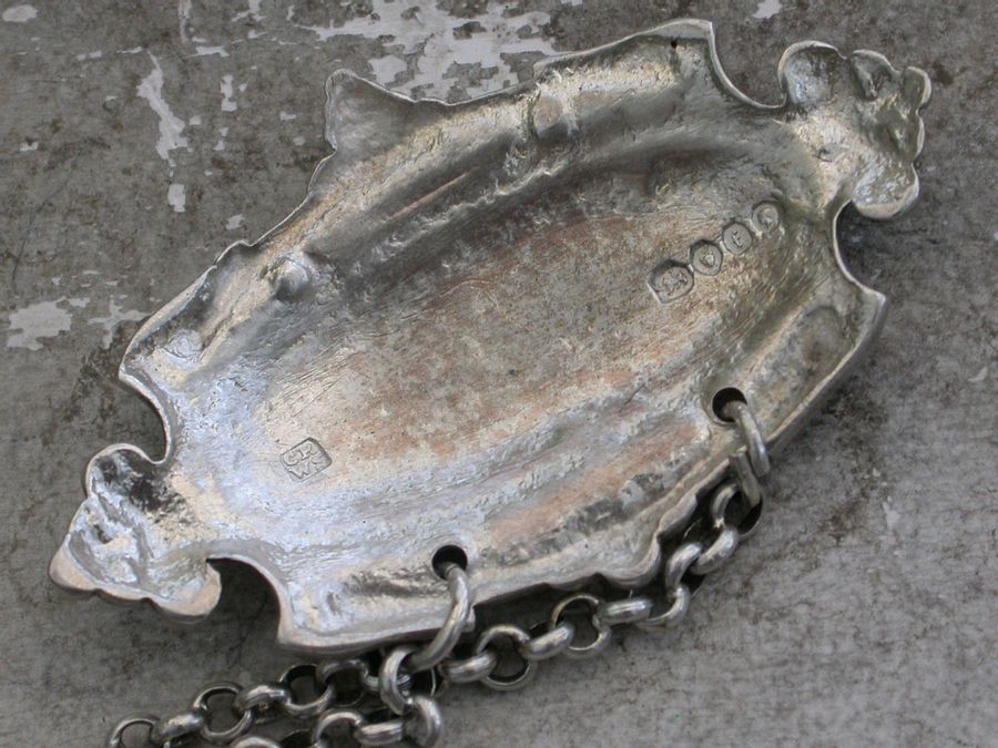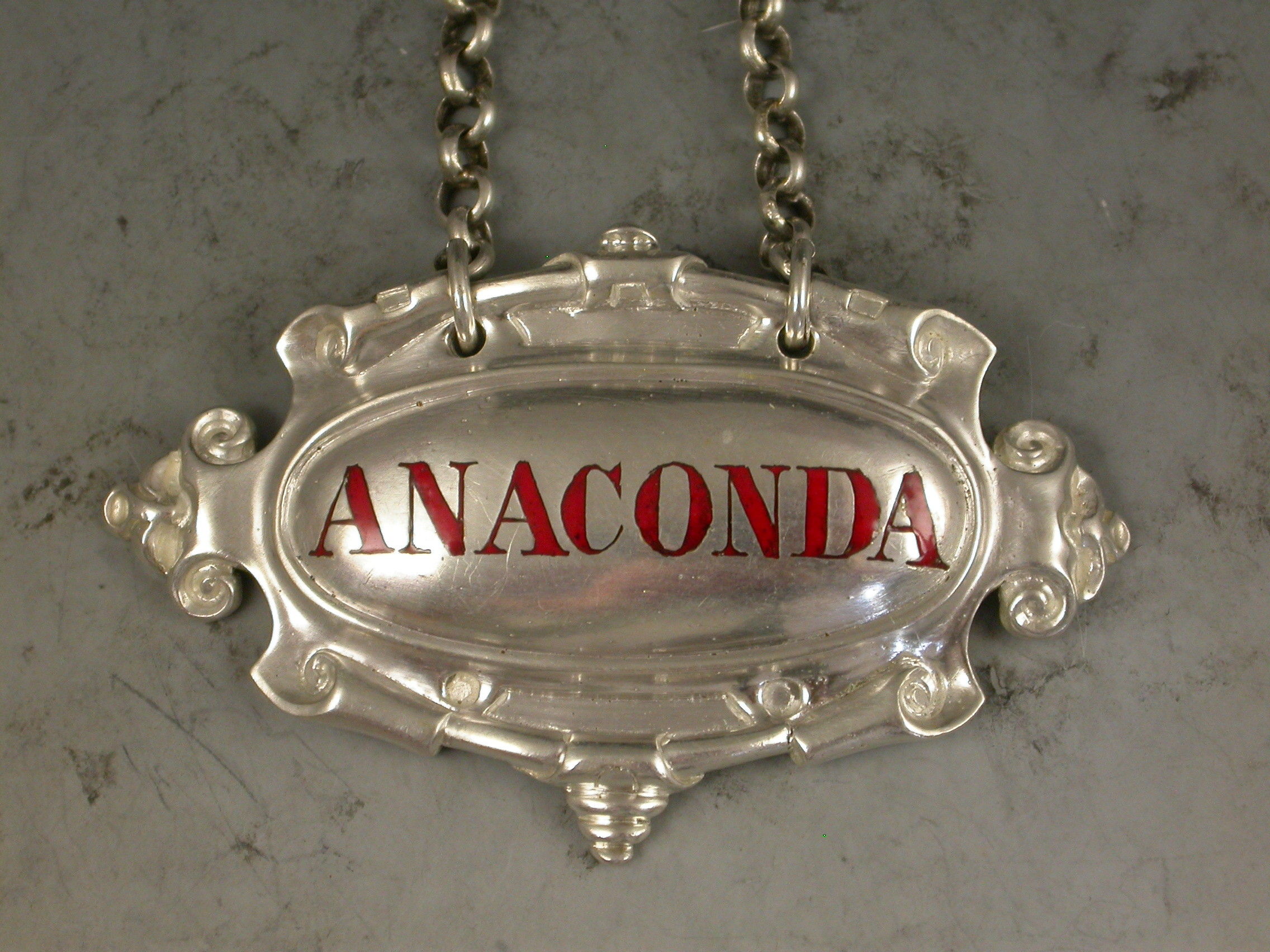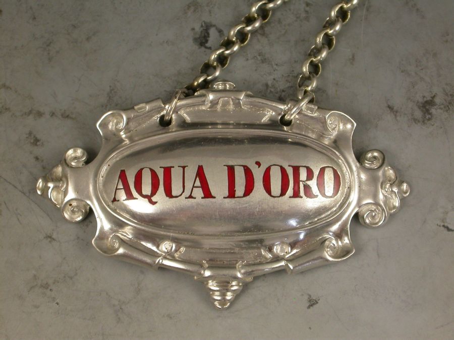 A fine quality and extremely rare set of five Victorian cast silver Liqueur Labels of architectural form, the scrolled border with volutes and a trefoil at either end, the incised titles for Noyeau * Maraschino * Anaconda * Aqua D'Oro * Curacoa highlighted in red enamel (most unusual).