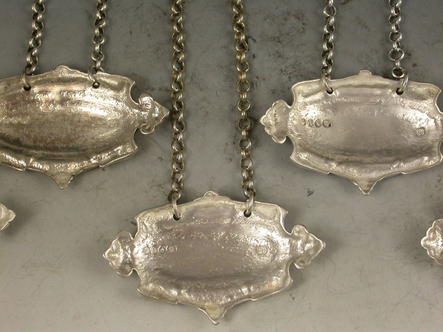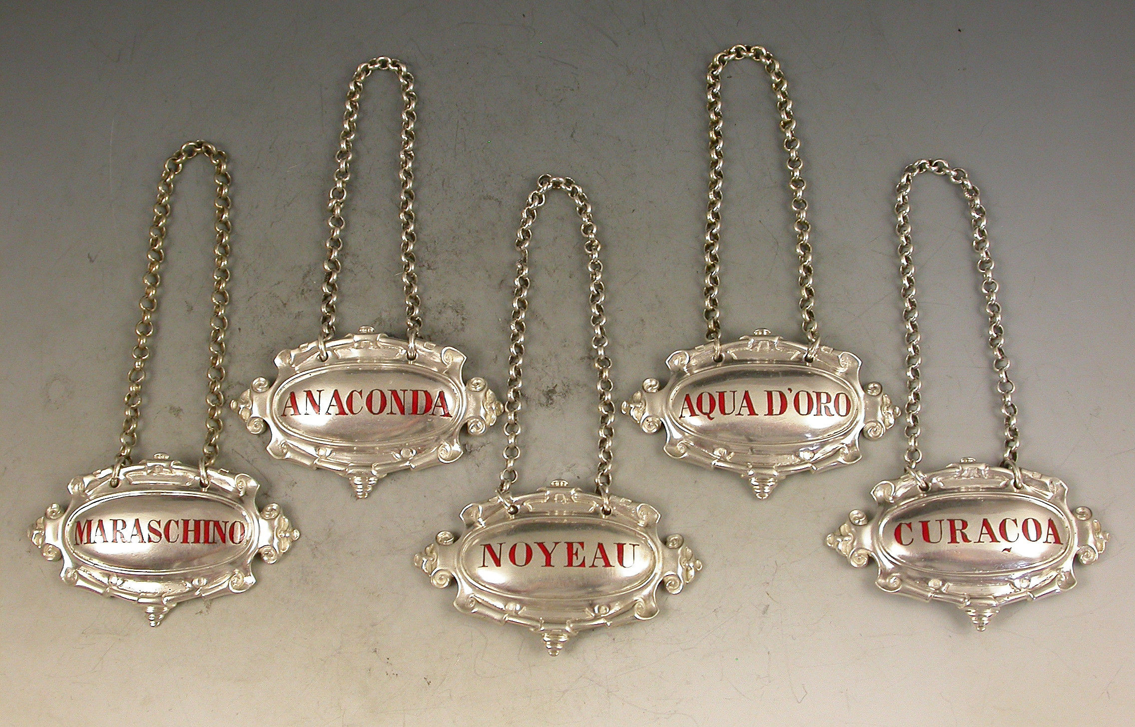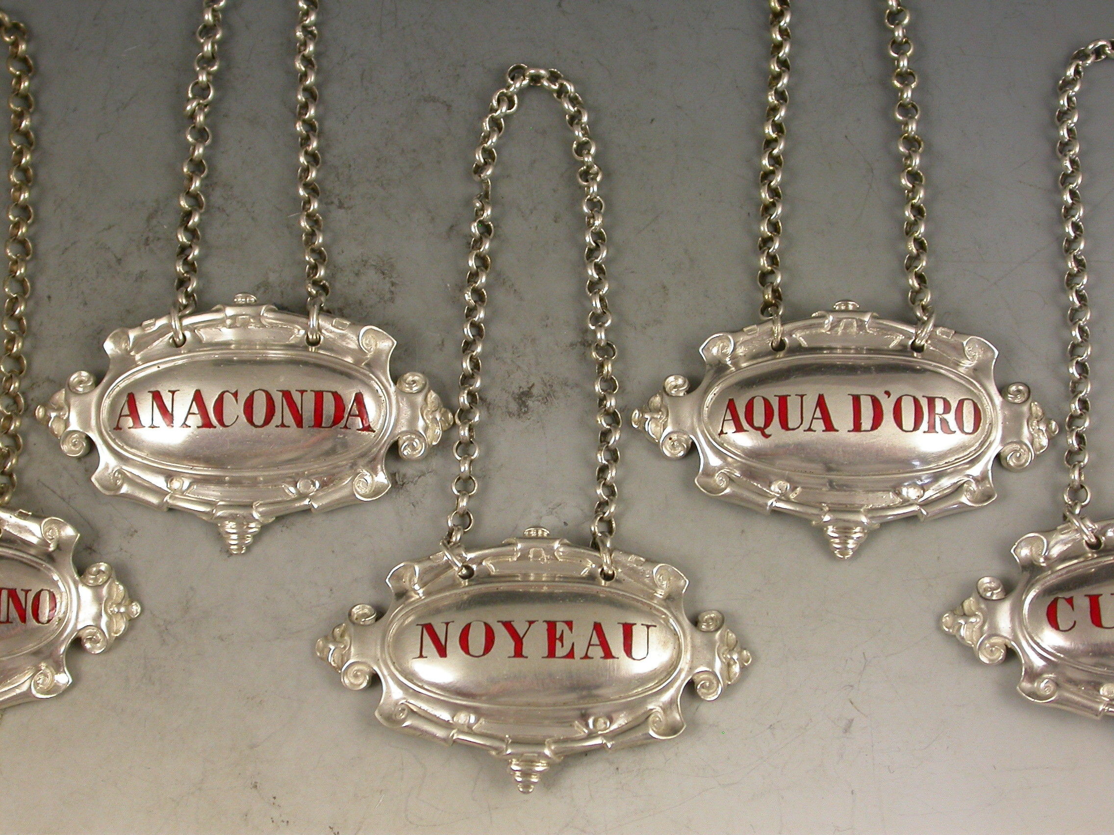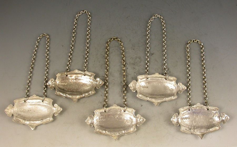 Set 5 Victorian Cast Silver Liqueur Labels Noyeau * Maraschino * Anaconda * Aqua D'Oro * Curacoa