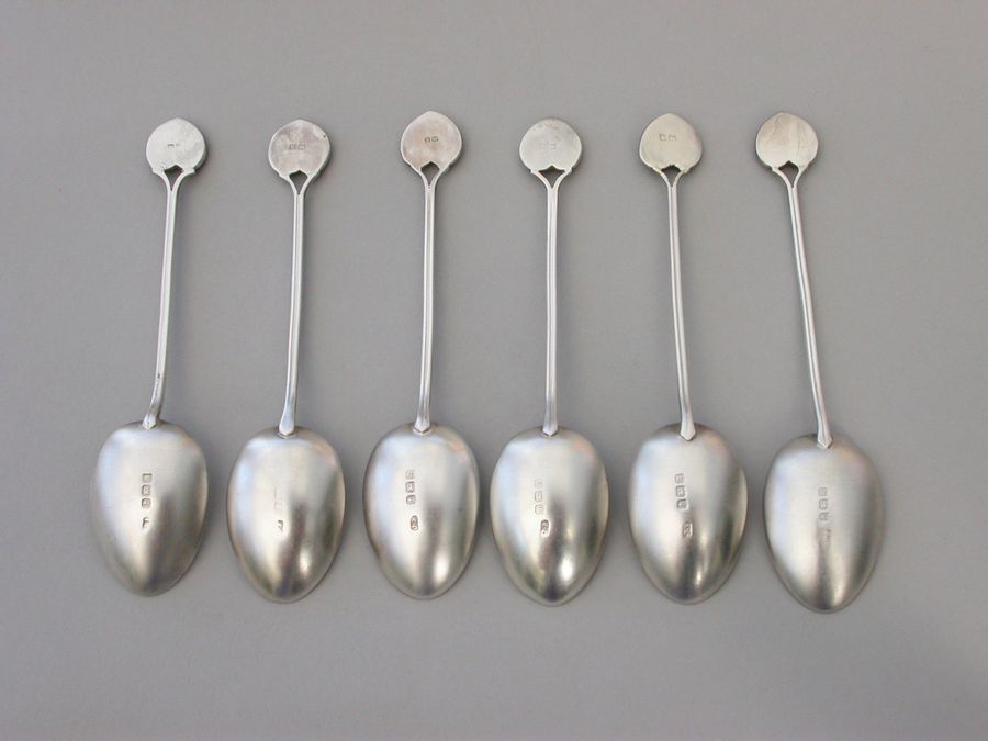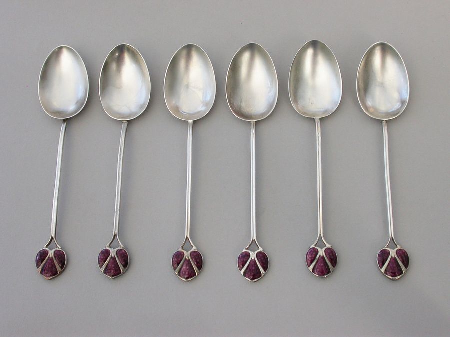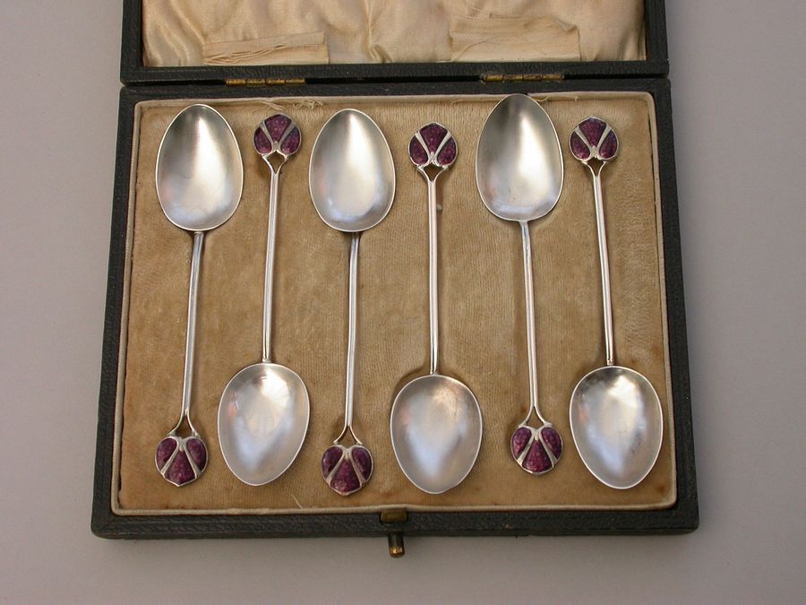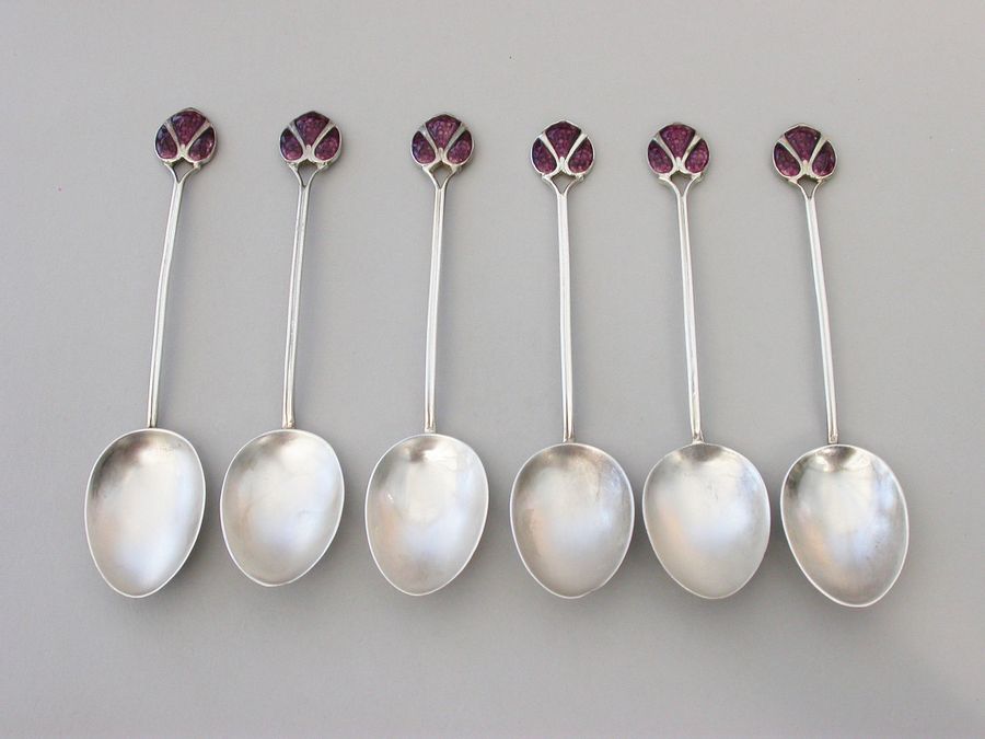 Set 6 Arts & Crafts Silver & Enamel Anthemion Teaspoons