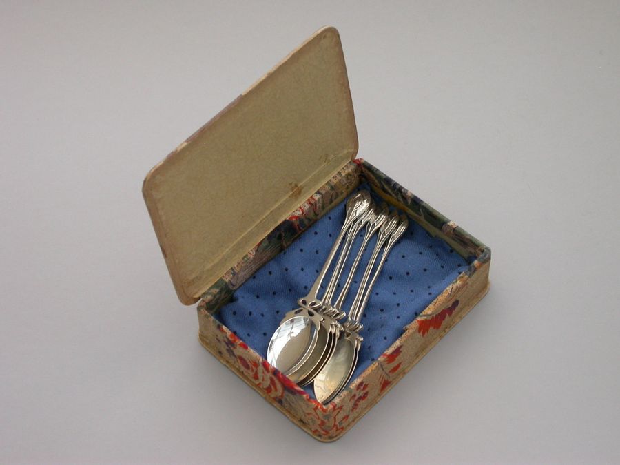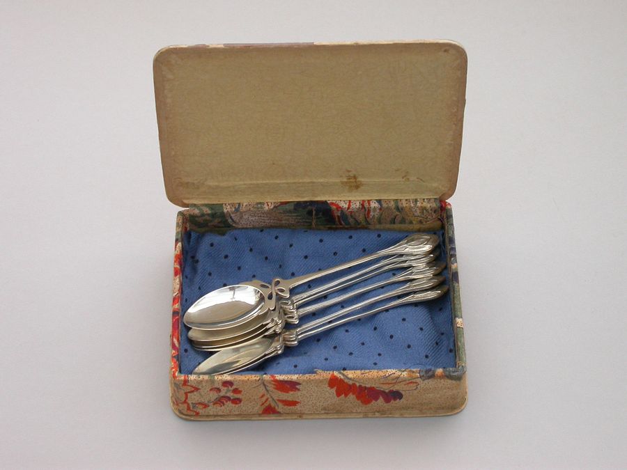 A rare set of six Liberty & Co silver Teaspoons in Crocus pattern, probably designed by Archibald Knox. Complete with a Liberty (style) painted paper and silk covered box.