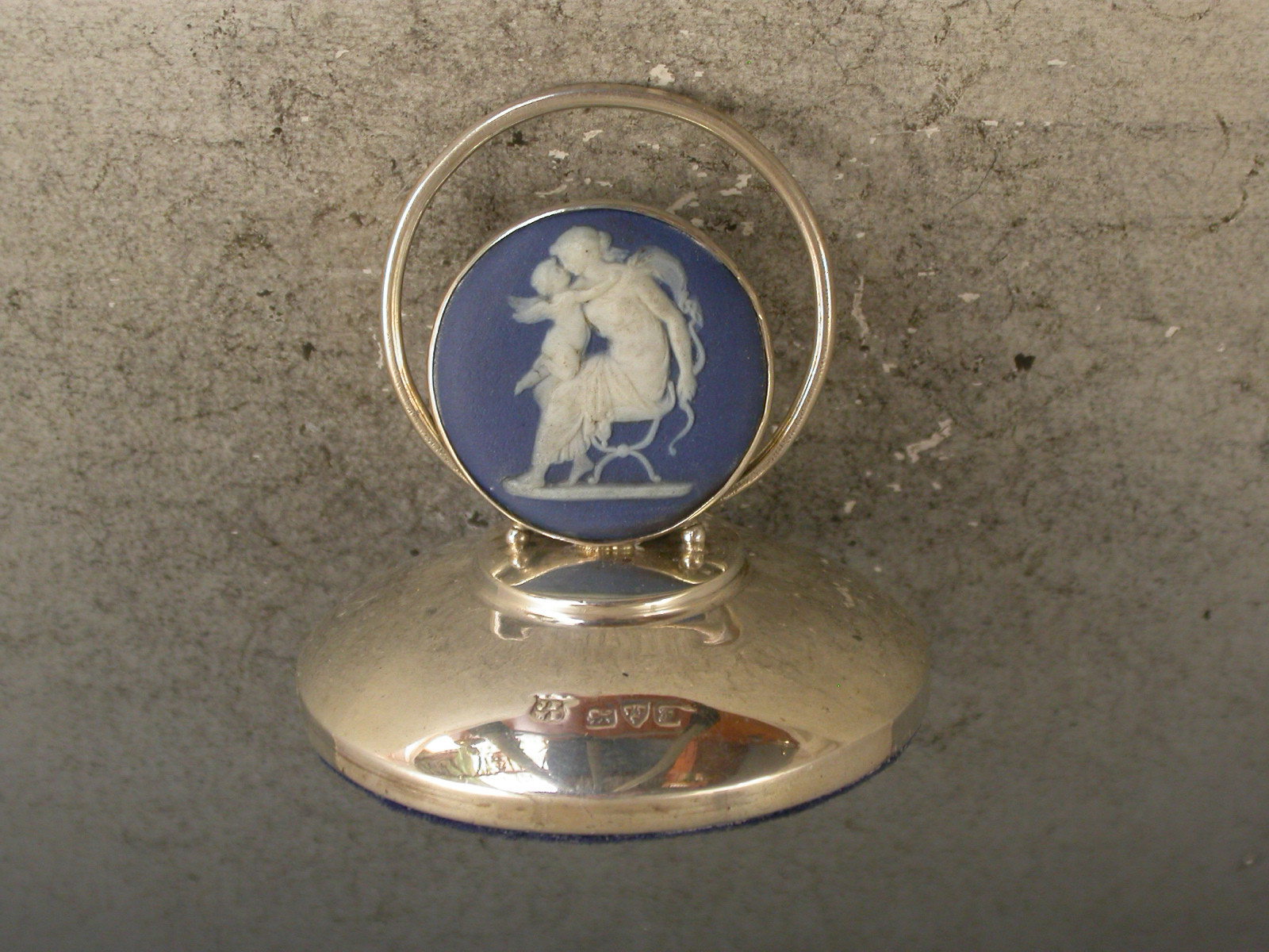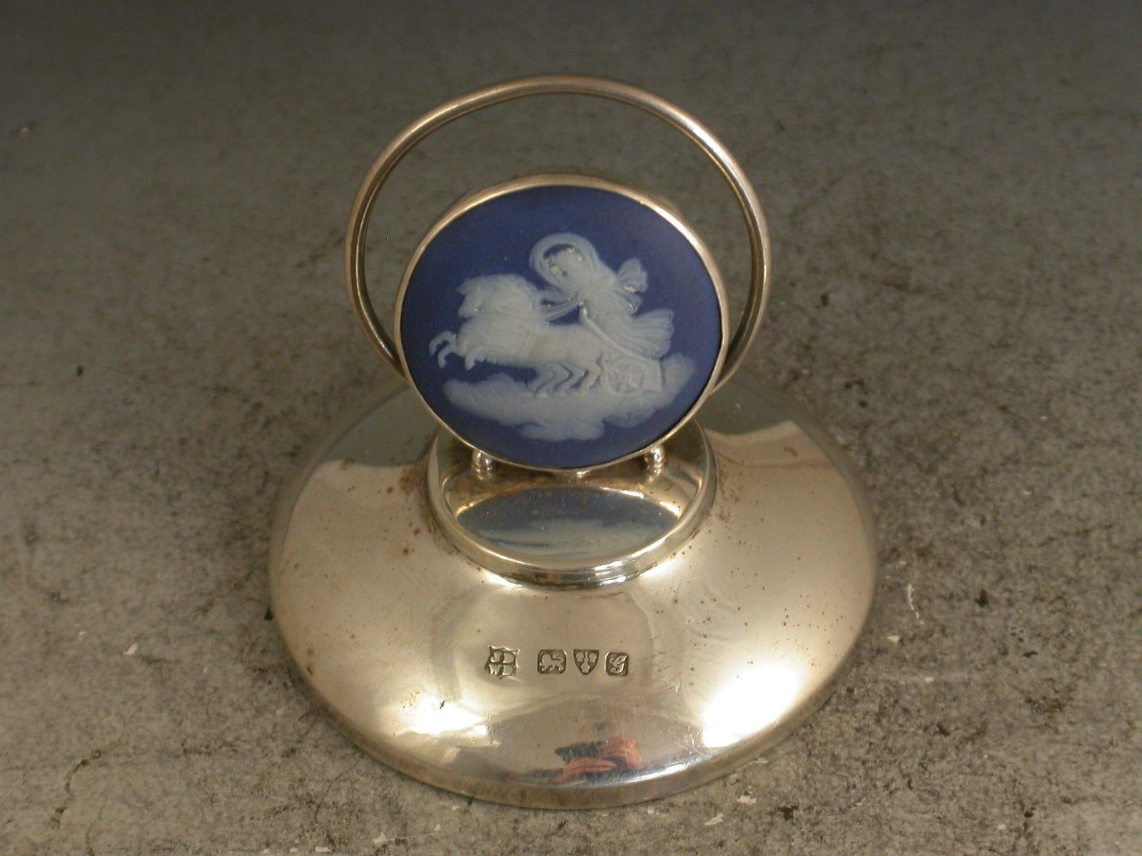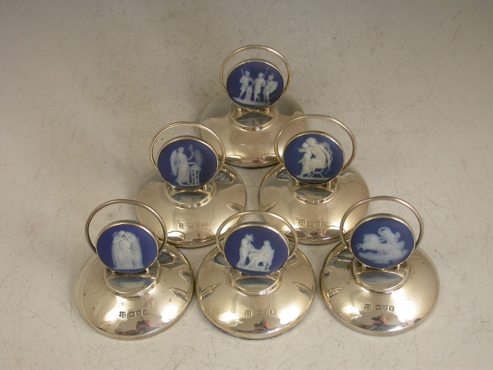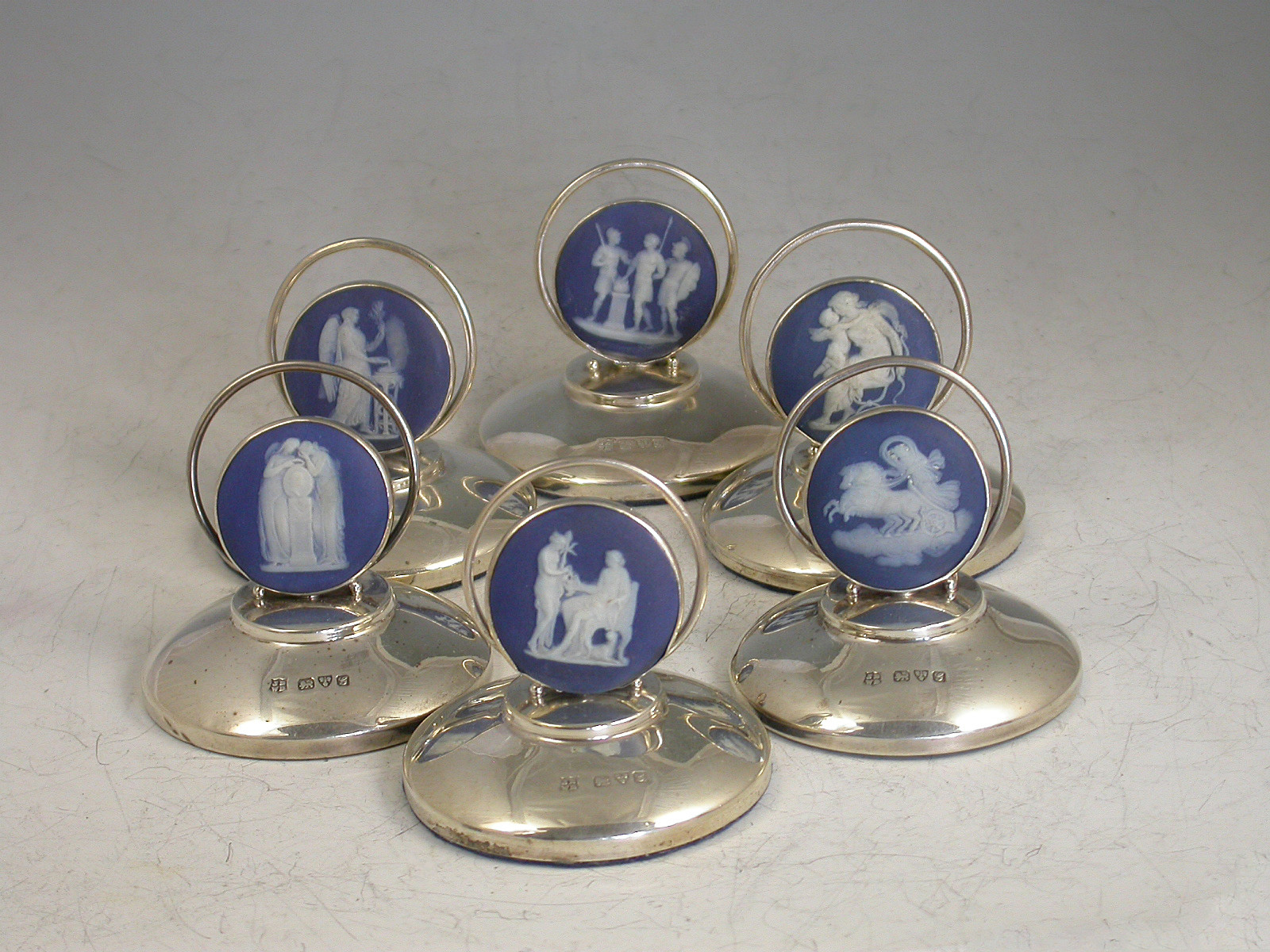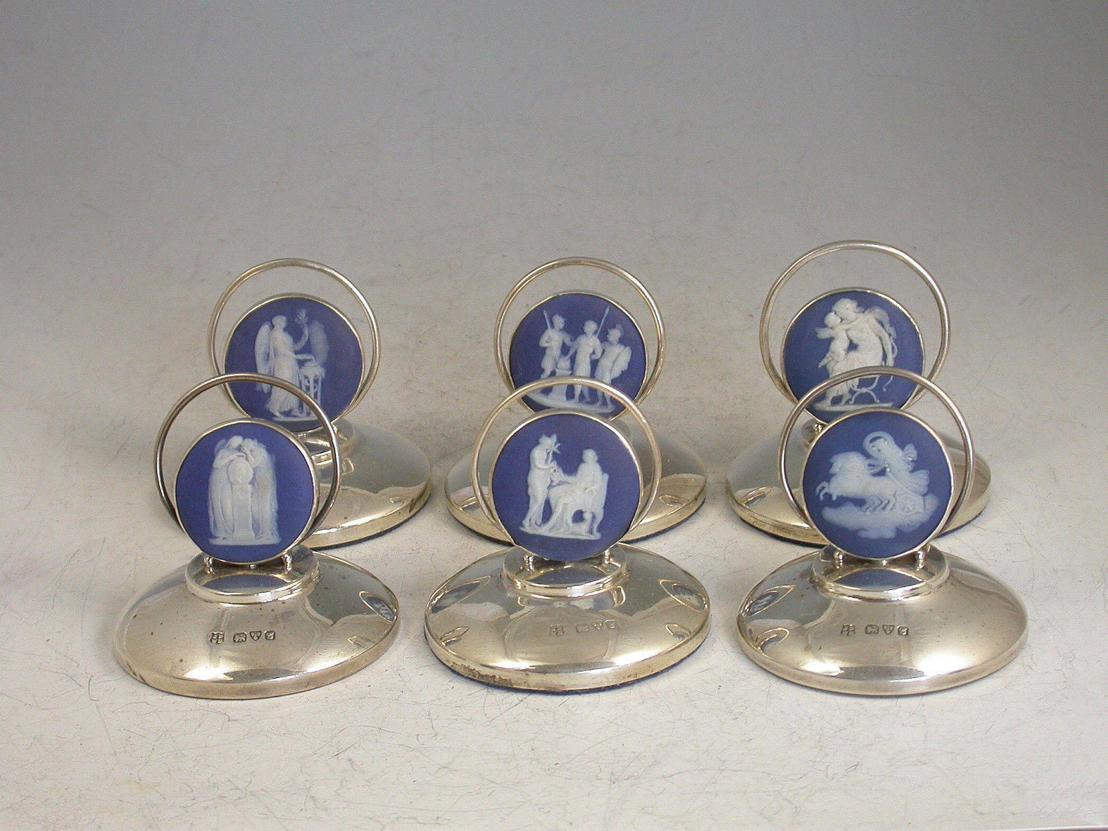 A good set of six Edwardian silver Menu Holders formed from Wedgwood blue Jasperware bosses decorated with classical scenes and set in circular silver mounts on weighted pedestal bases.