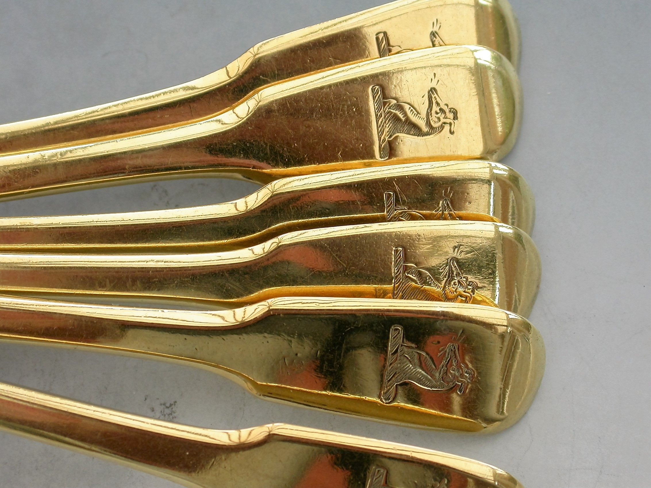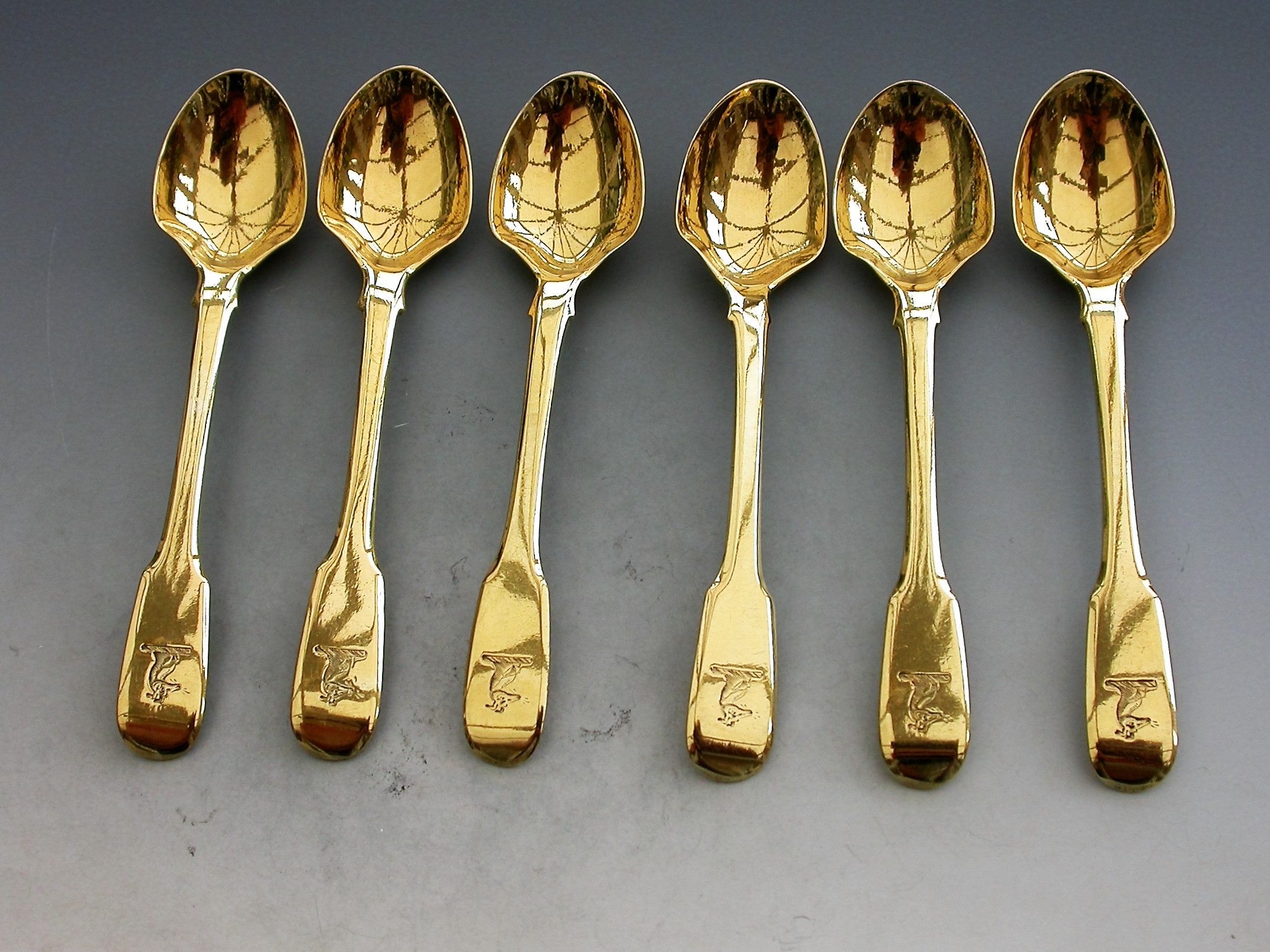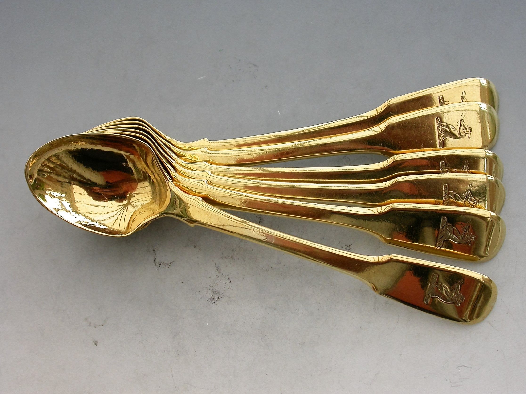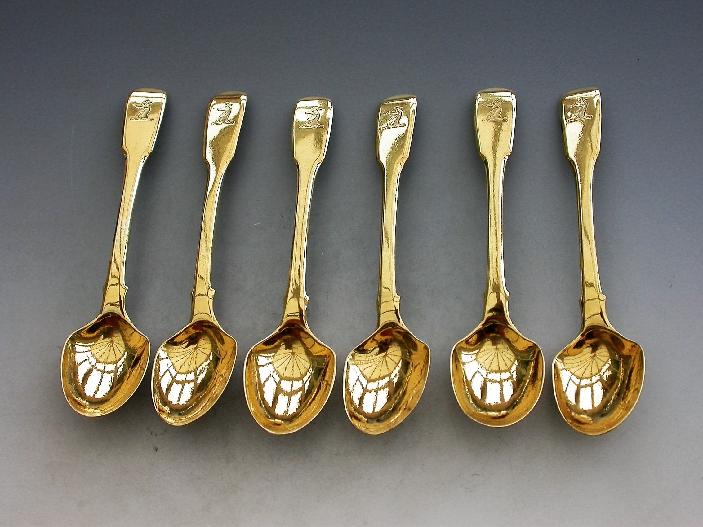 A fine quality set of six George III silver gilt Egg Spoons of plain fiddle pattern, the handles engraved with crests depicting greyhounds heads.