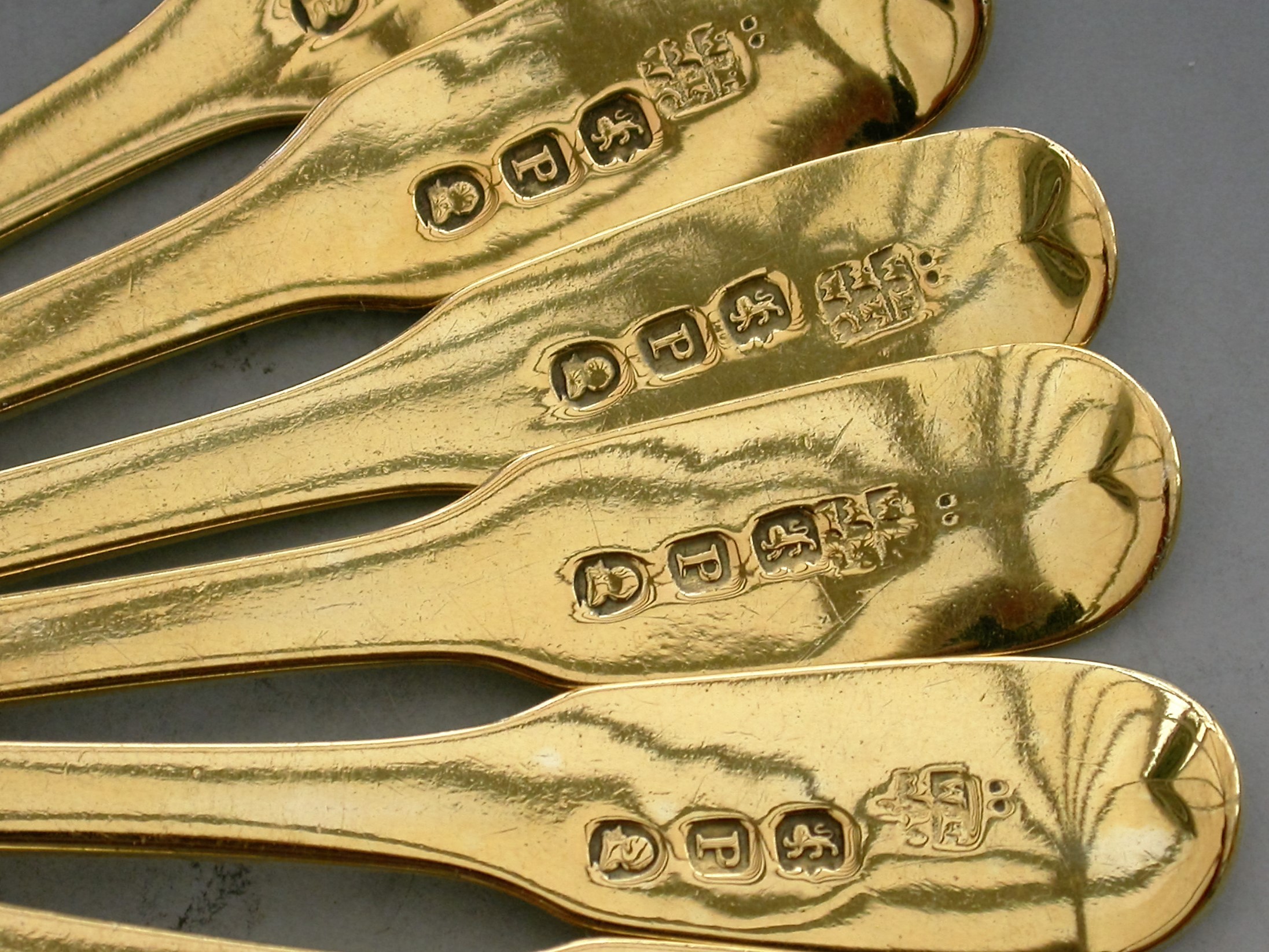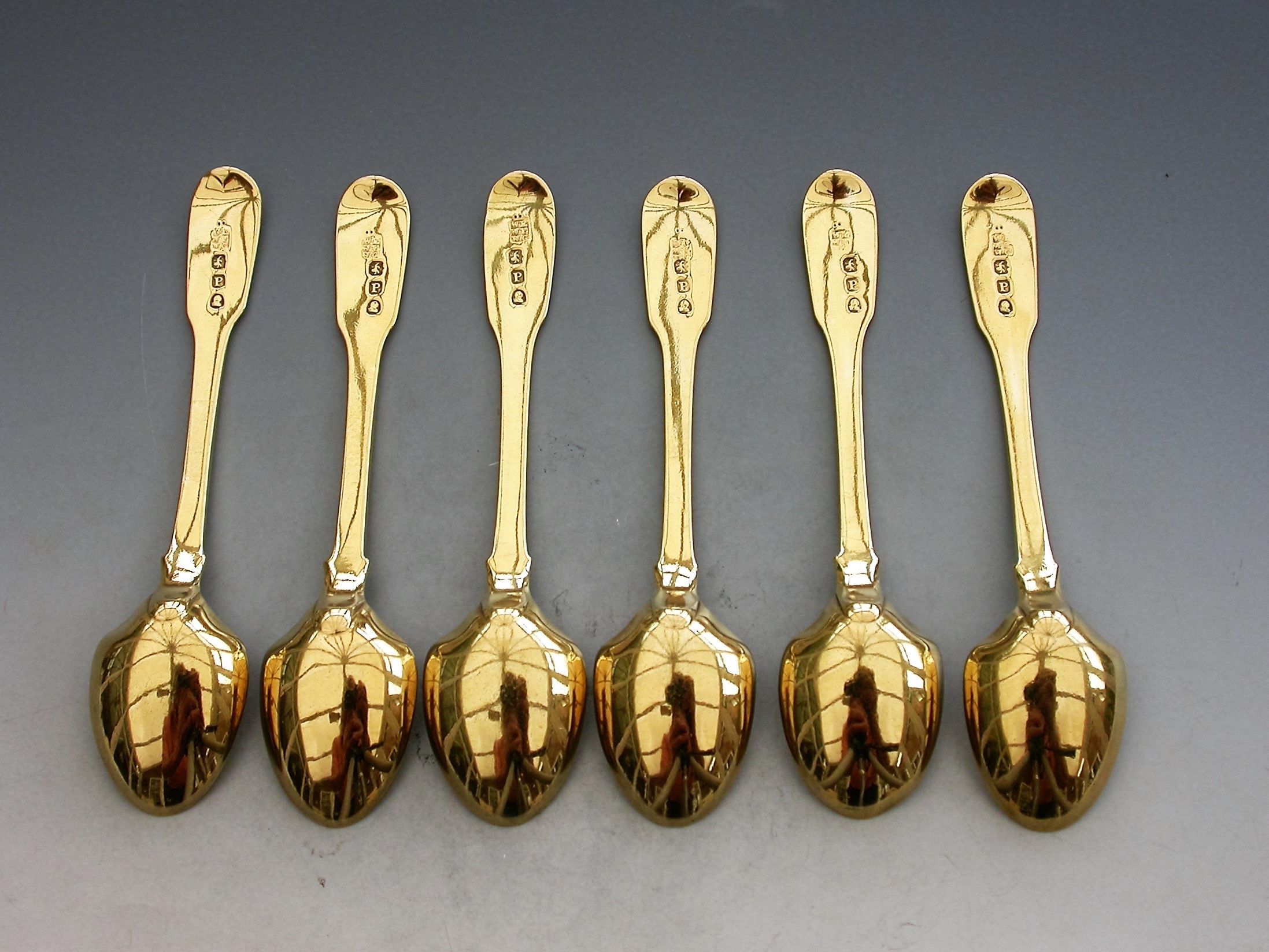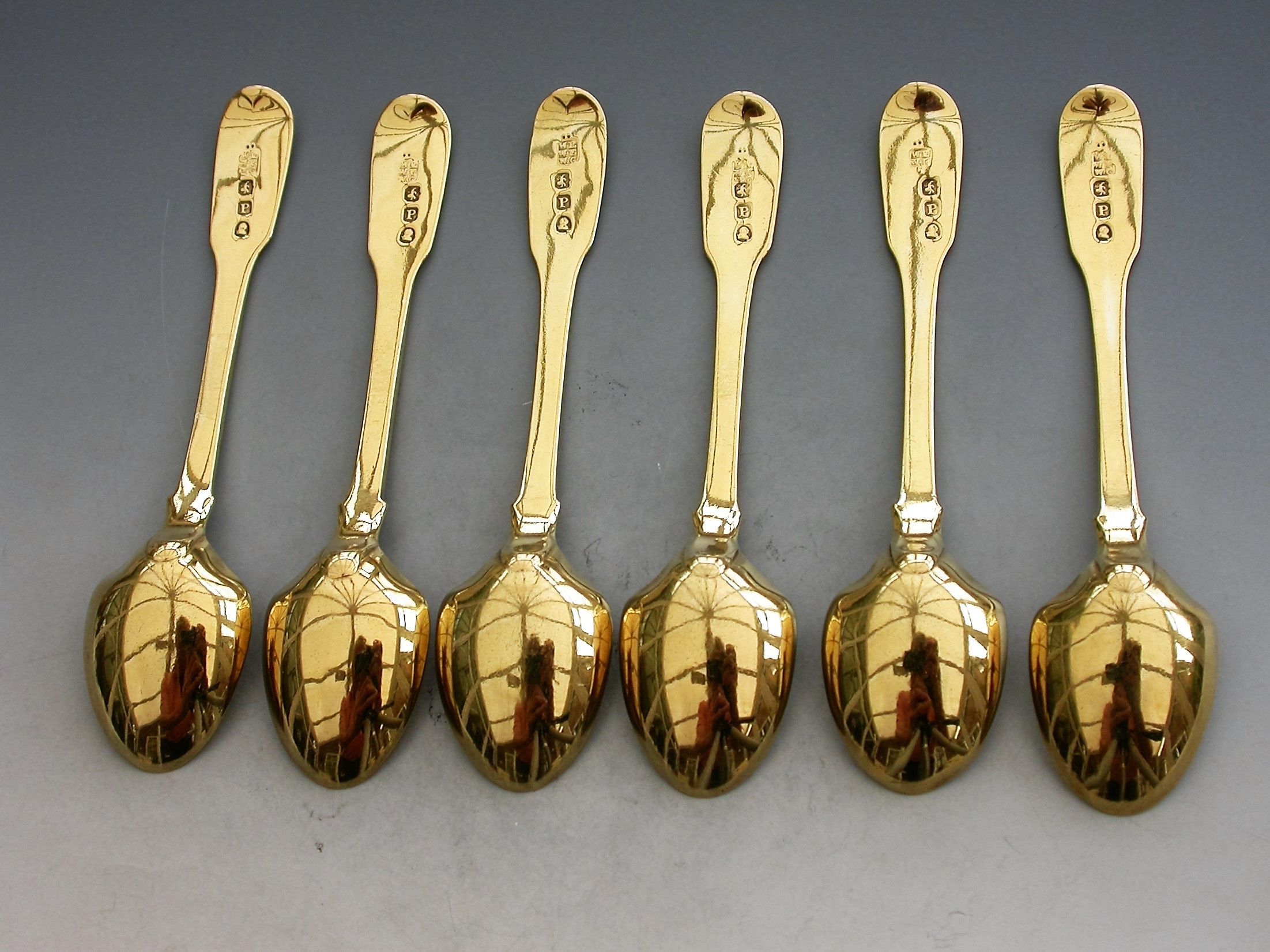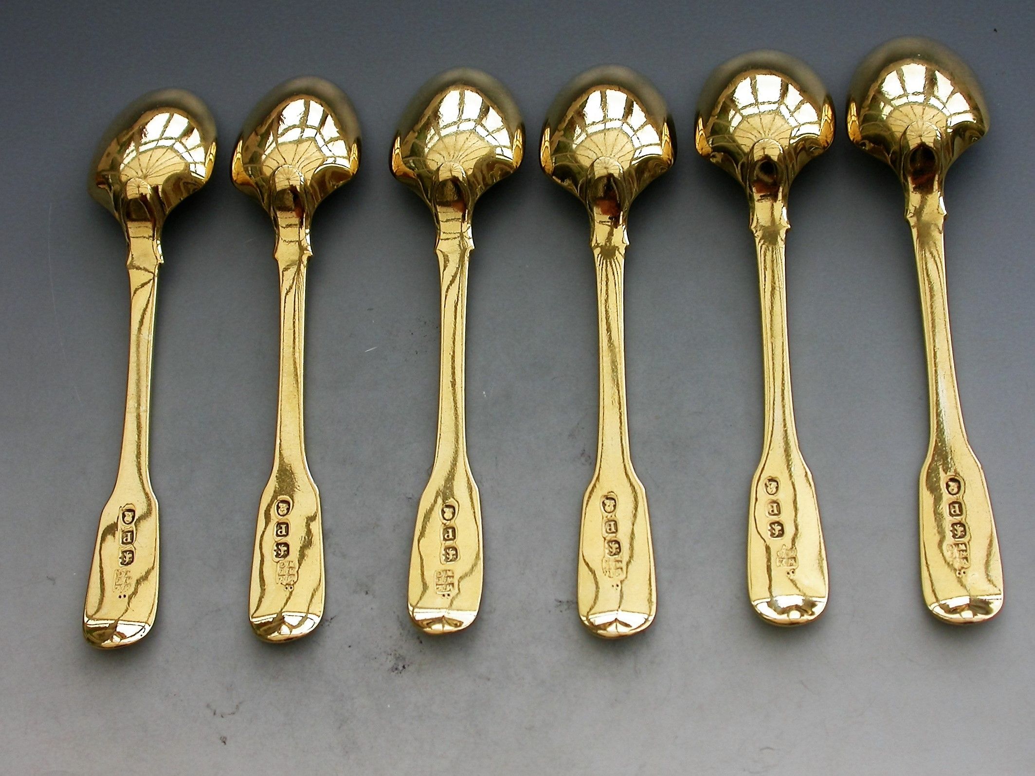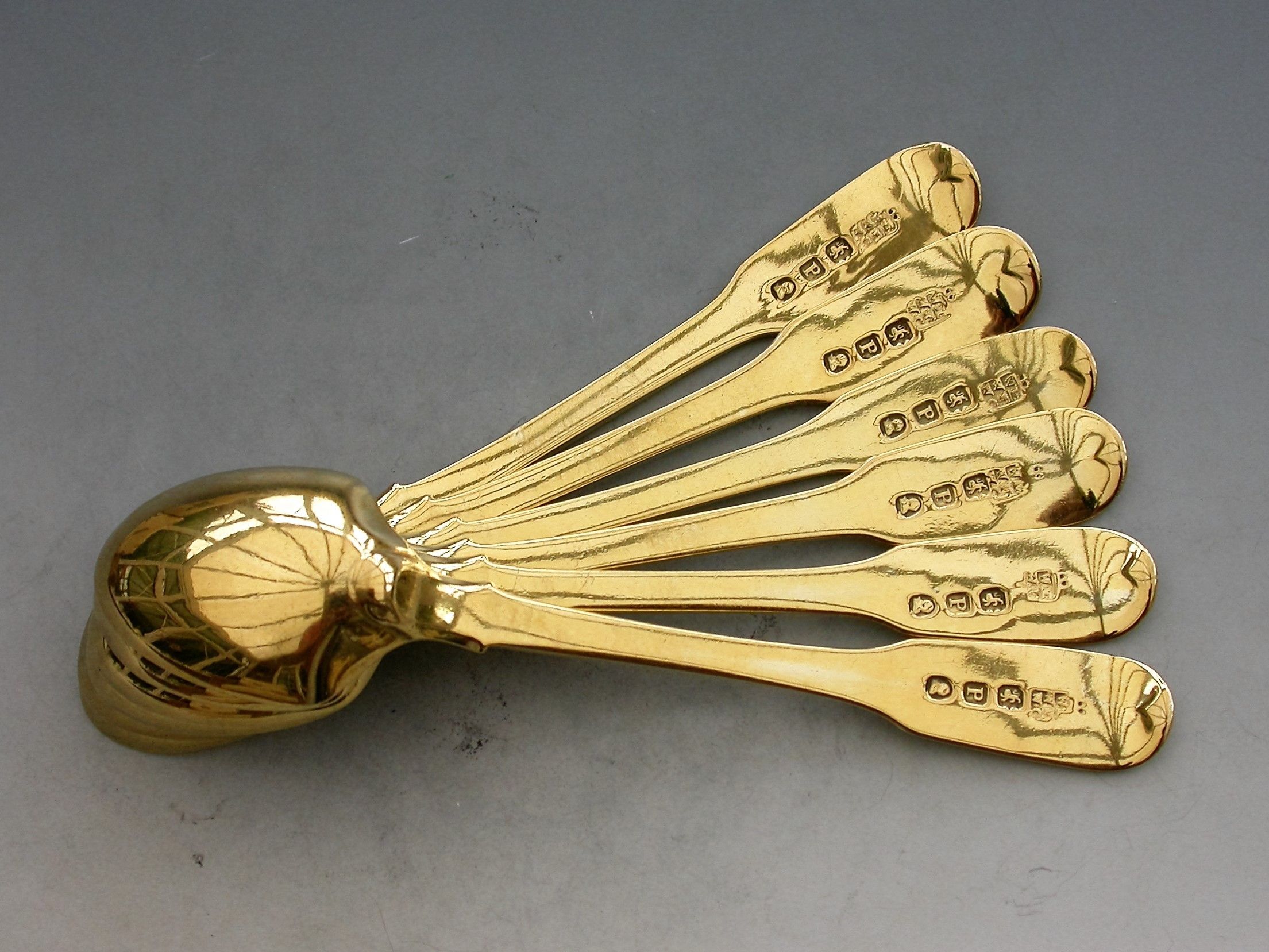 A fine quality set of six George III silver gilt Egg Spoons of plain fiddle pattern, the handles engraved with crests depicting greyhounds heads.