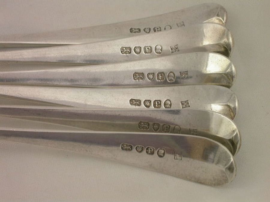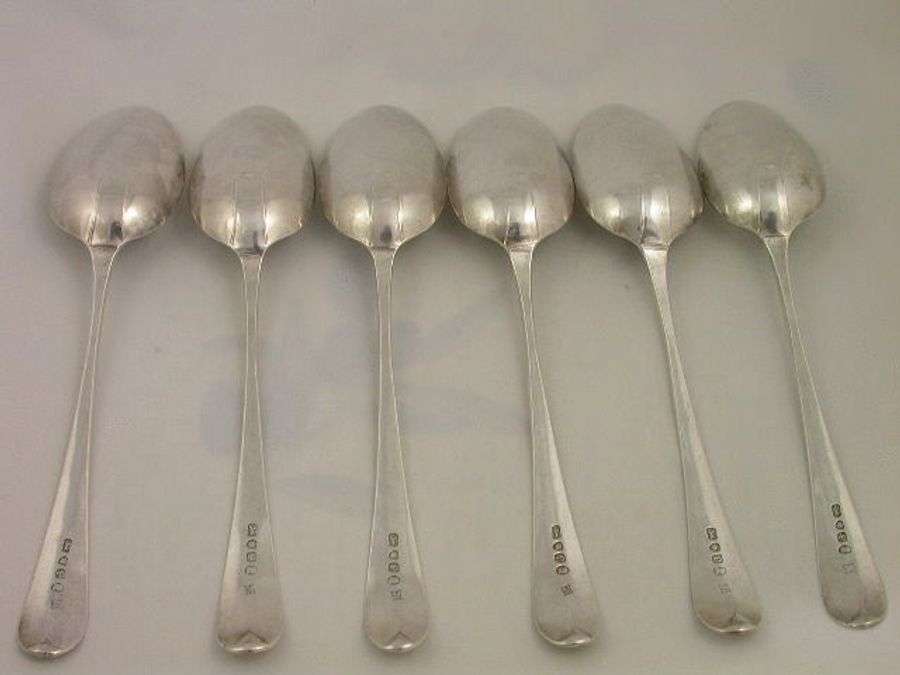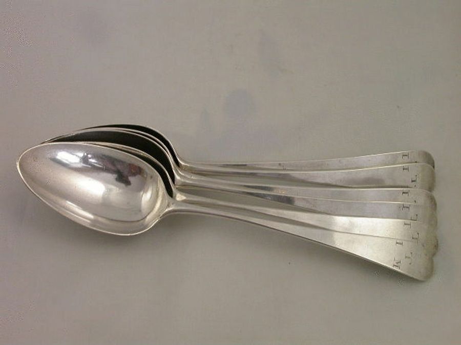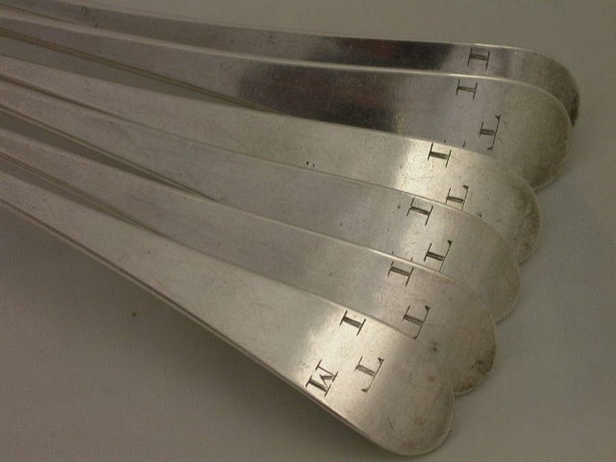 A very rare set of six George III silver Old English pattern Table Spoons, with engraved contemporary initials “T over I.M” to the handles.