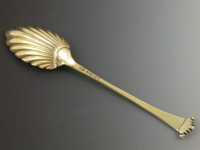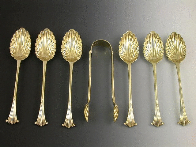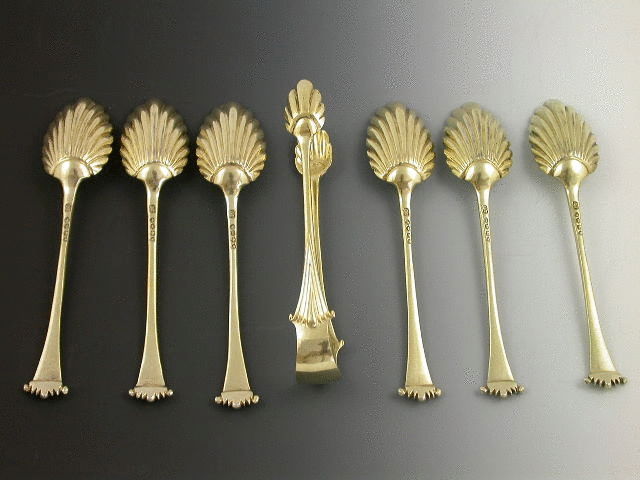 A fine set of six Victorian silver gilt Tea Spoons with Sugar Tongs en-suite, of Onslow pattern, with fluted bowls in the Georgian style.