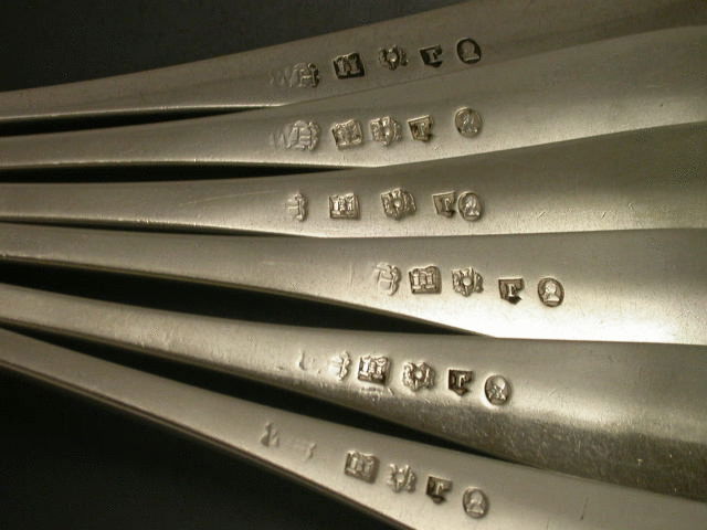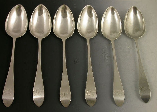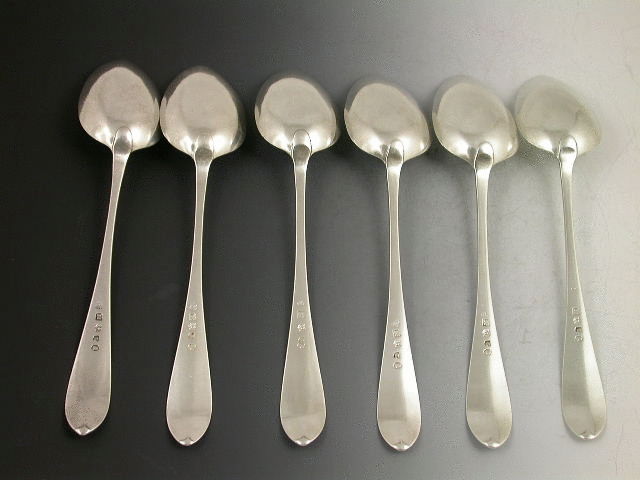 A good set of six Scottish Provincial silver Dessert Spoons of plain Celtic point design, the handles engraved with initials AMB.