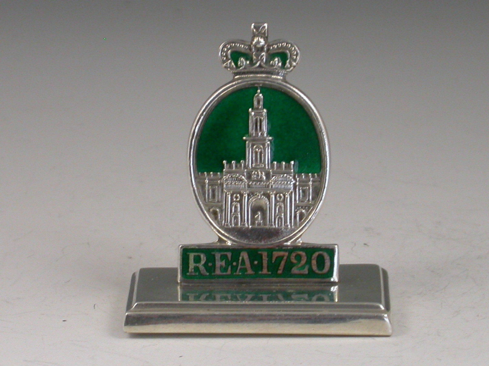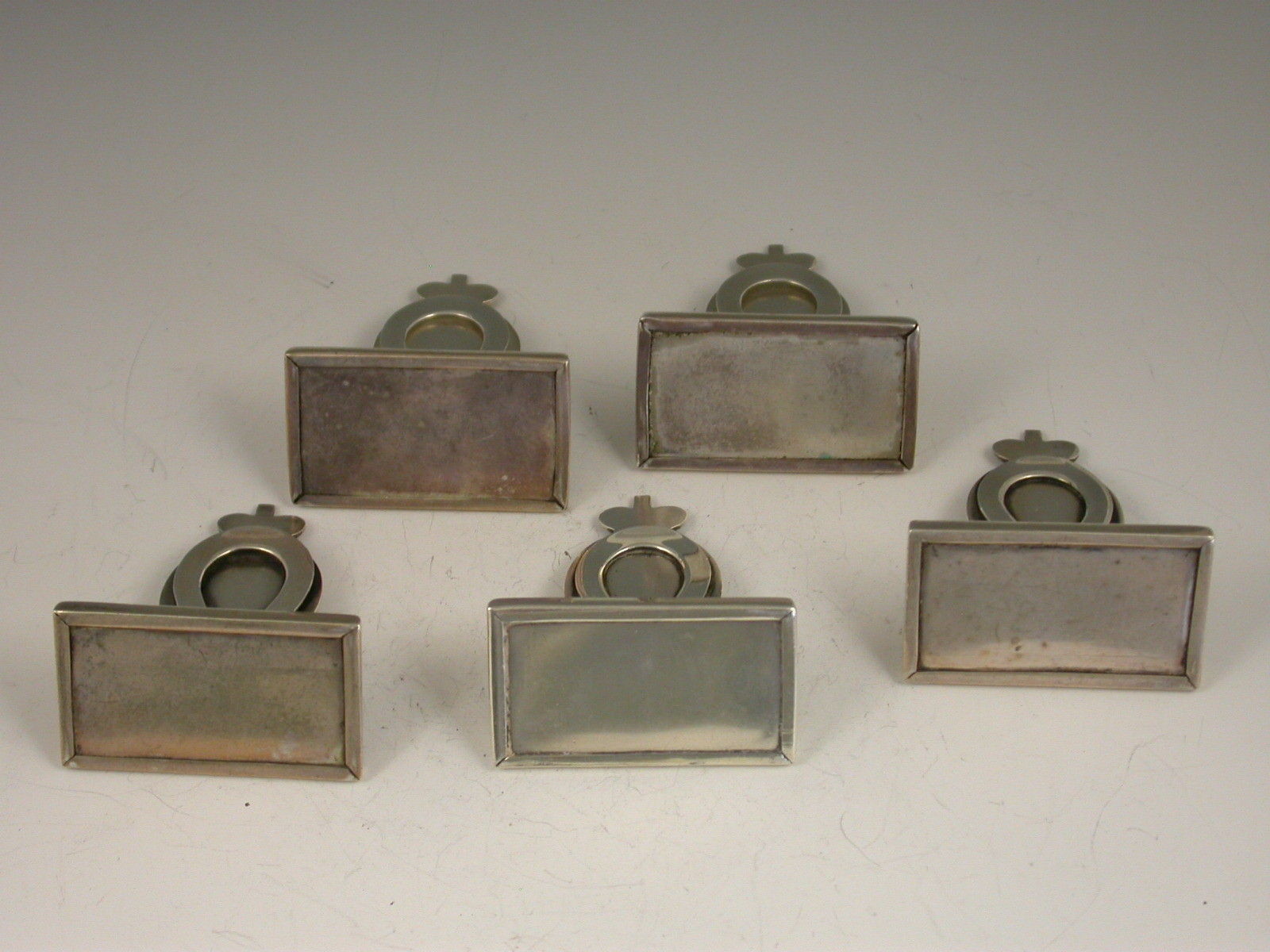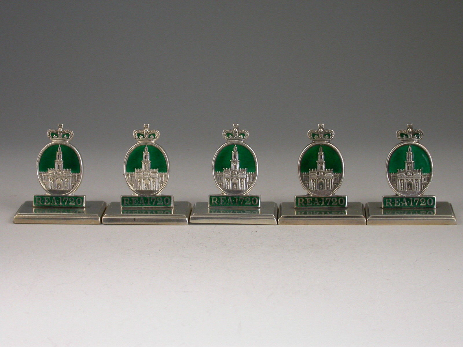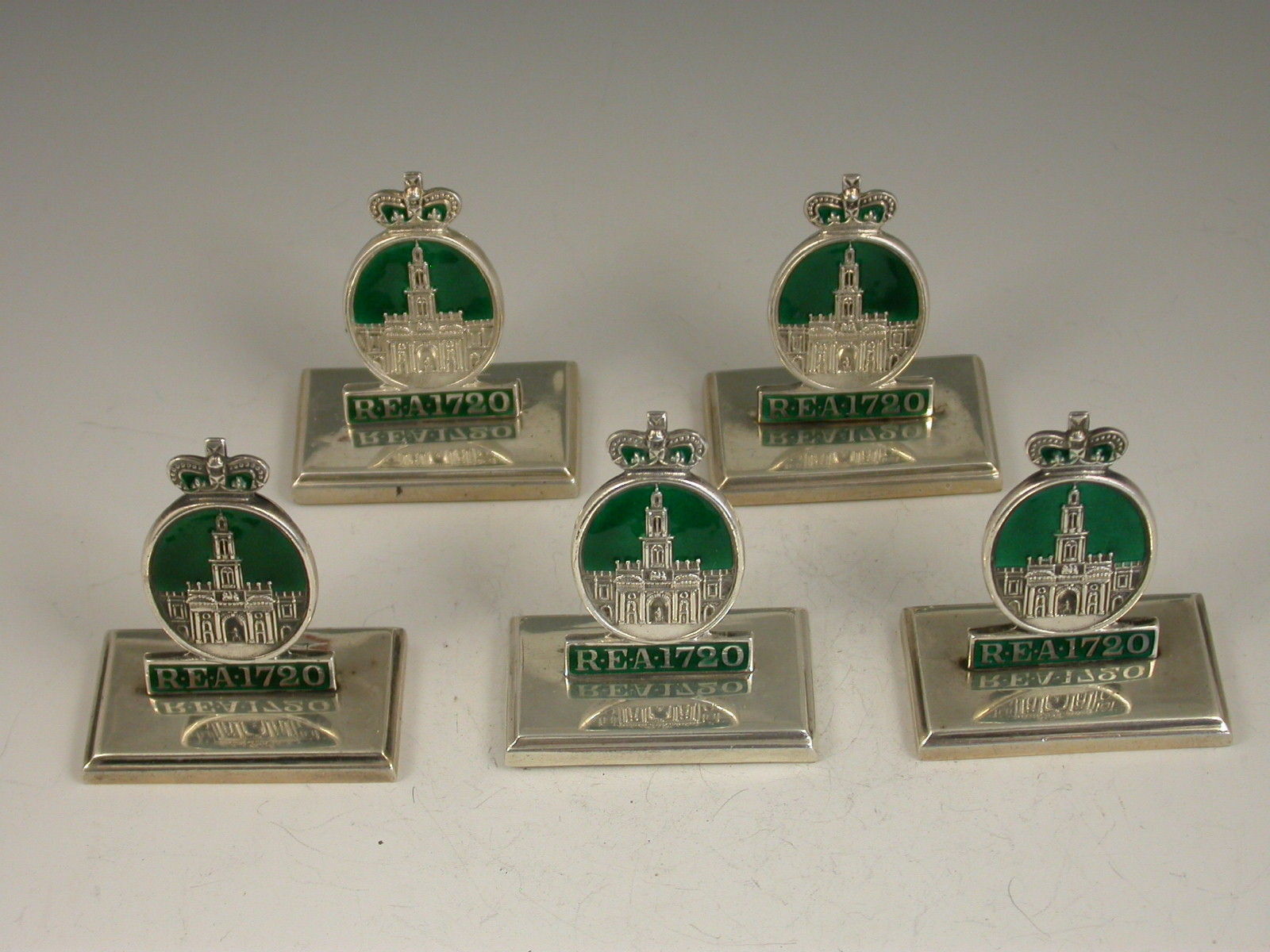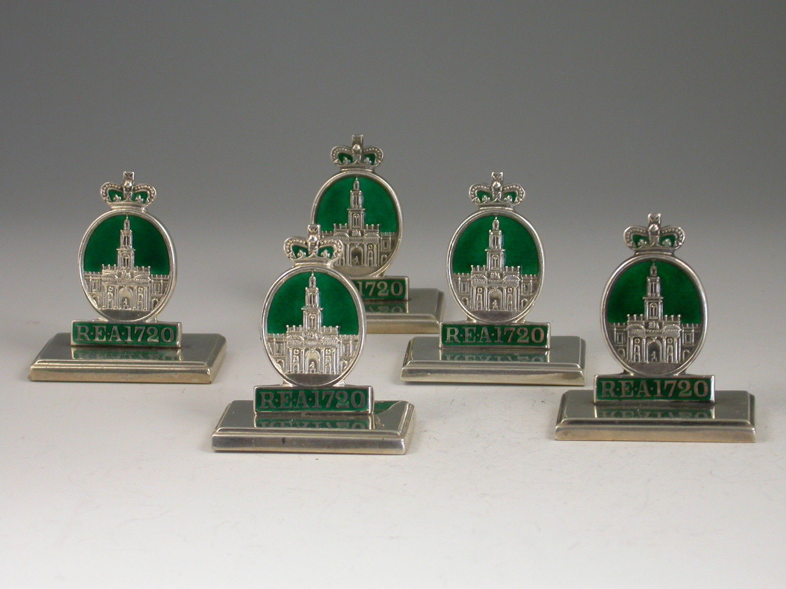 A set of five George V silver and enamel Menu Holders formed as the badge of the Royal Exchanged Assurance Corporation, founded in 1720 and depicting the Royal Exchange Building on a green enamel background, standing on rectangular loaded bases.
