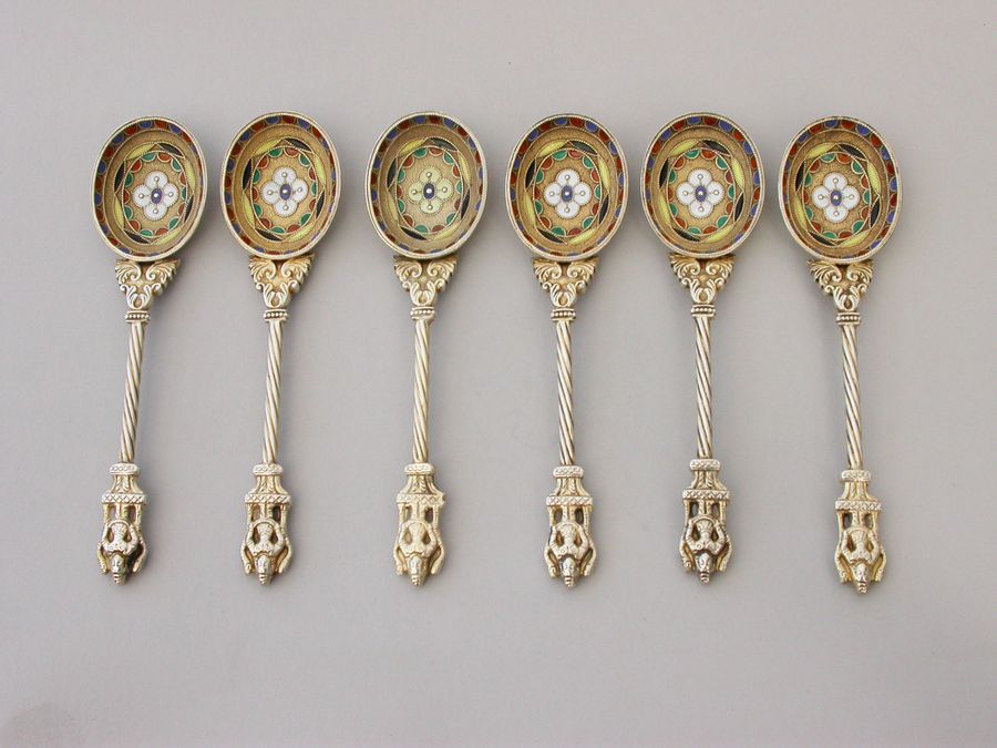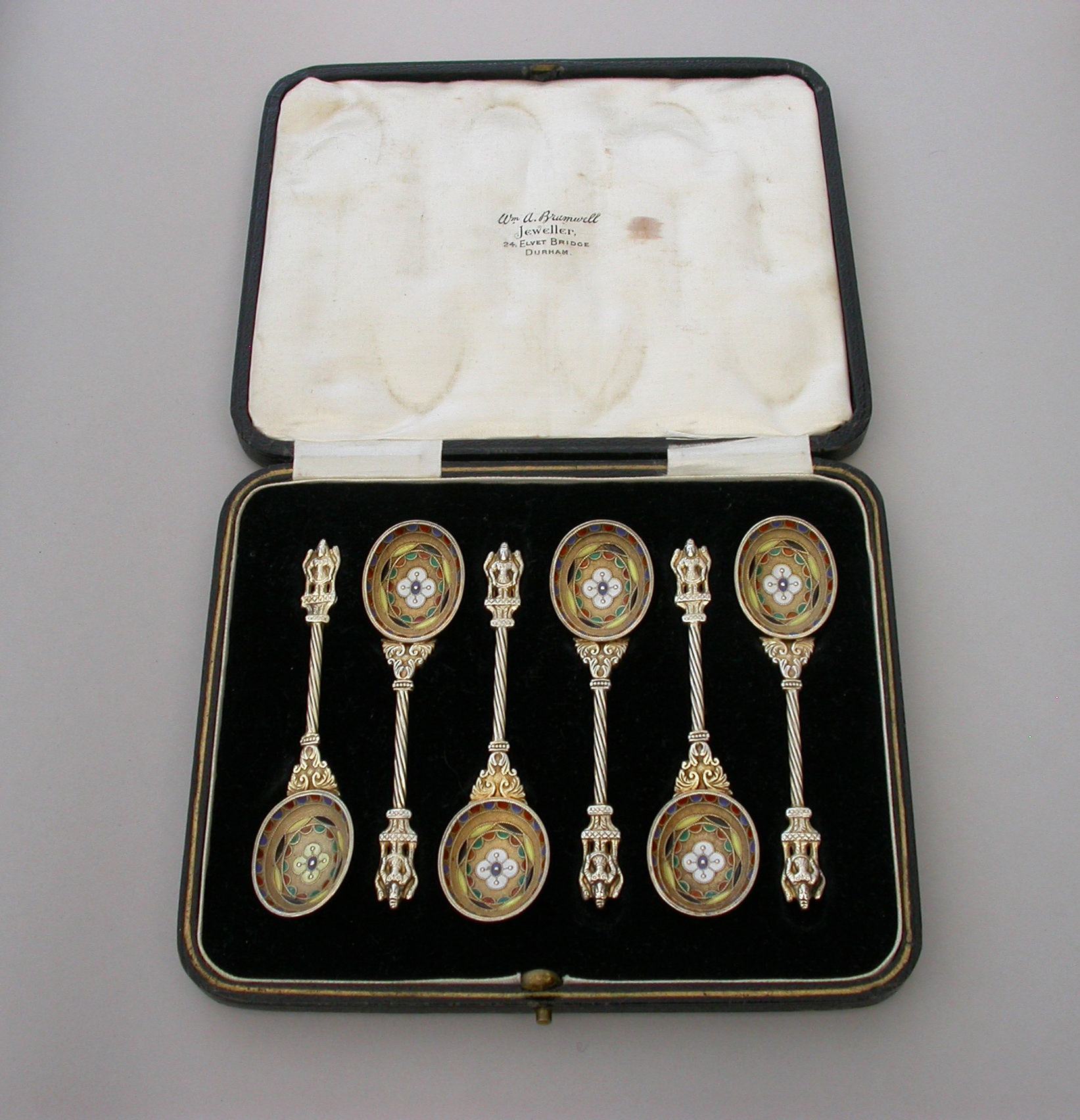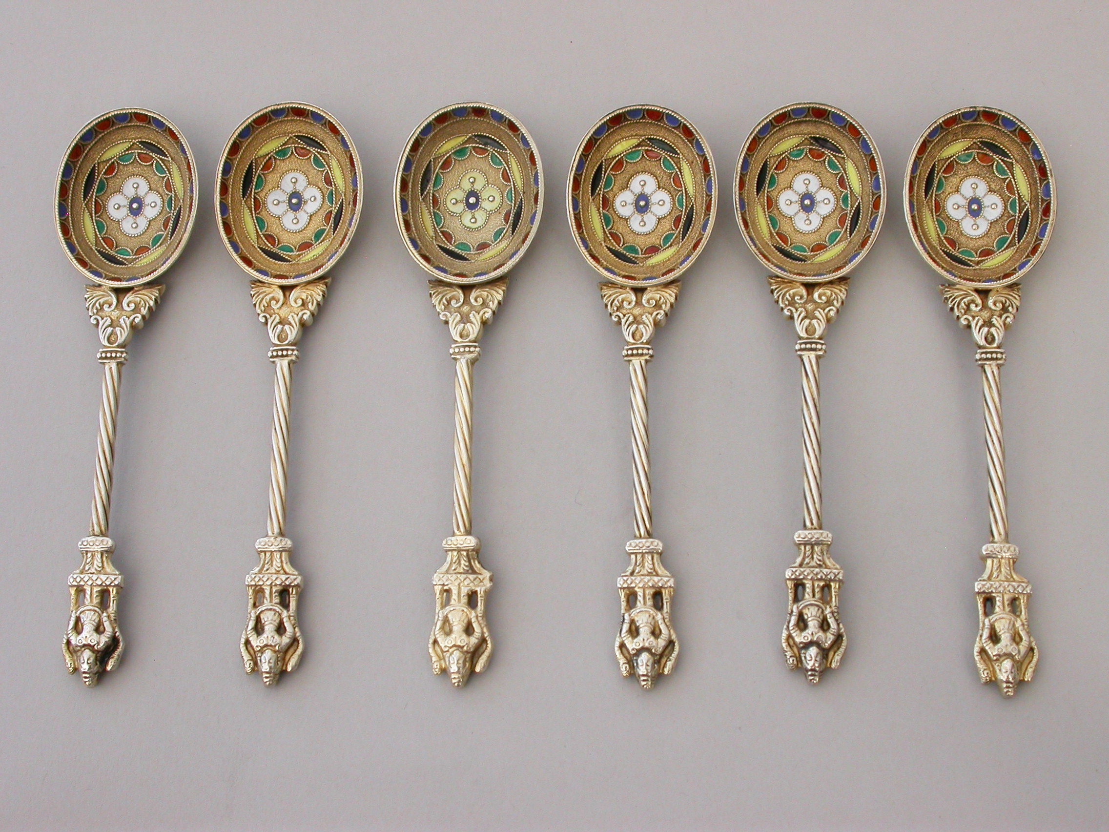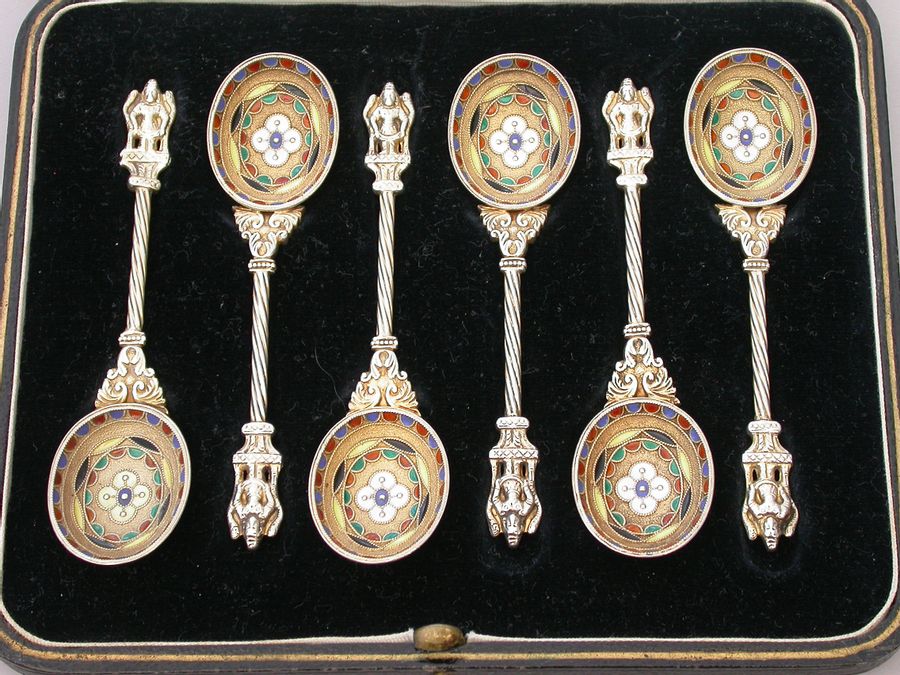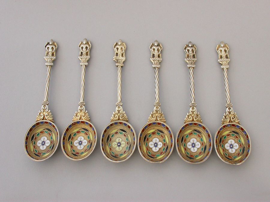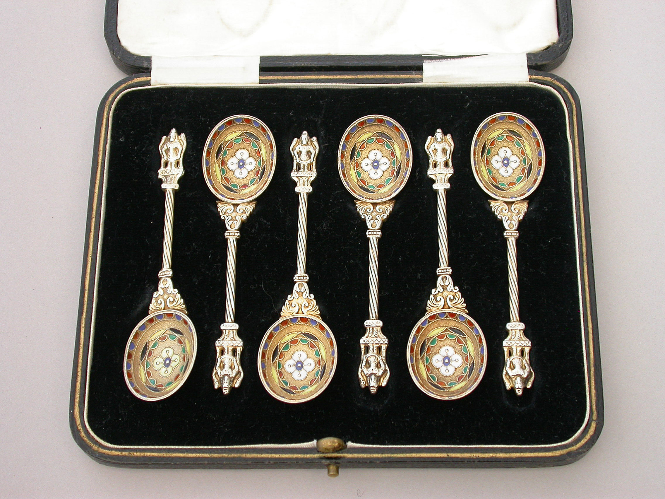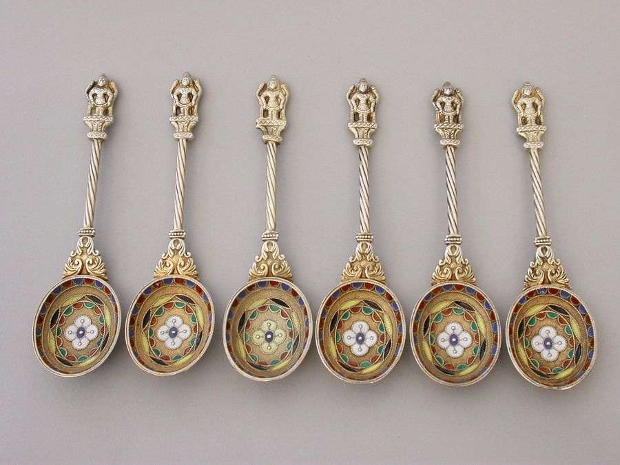 An unusual set of six Victorian silver gilt Teaspoons with Indian Deity finials above twisted stems with extravagant winged shoulders terminating in large oval bowls inlaid with gilt cloisonne and polychrome enamel. Imitating the styles of both Norway and Russia.