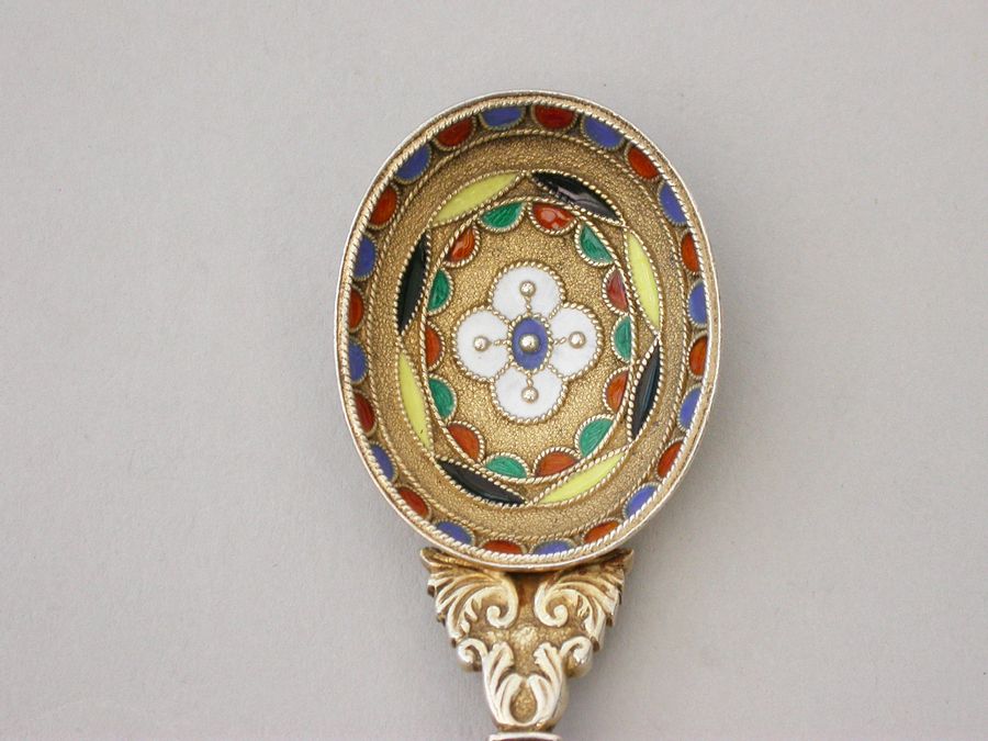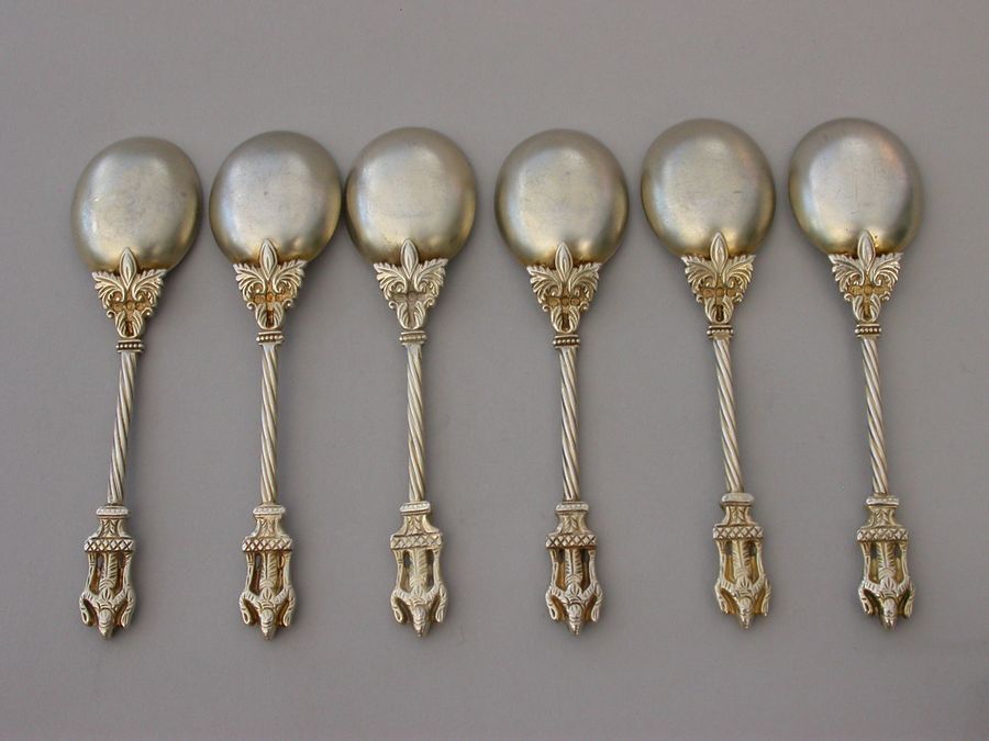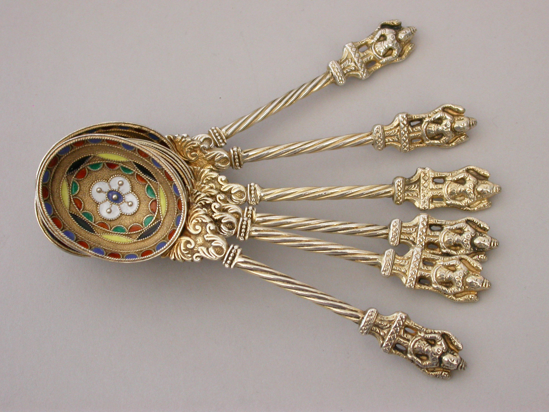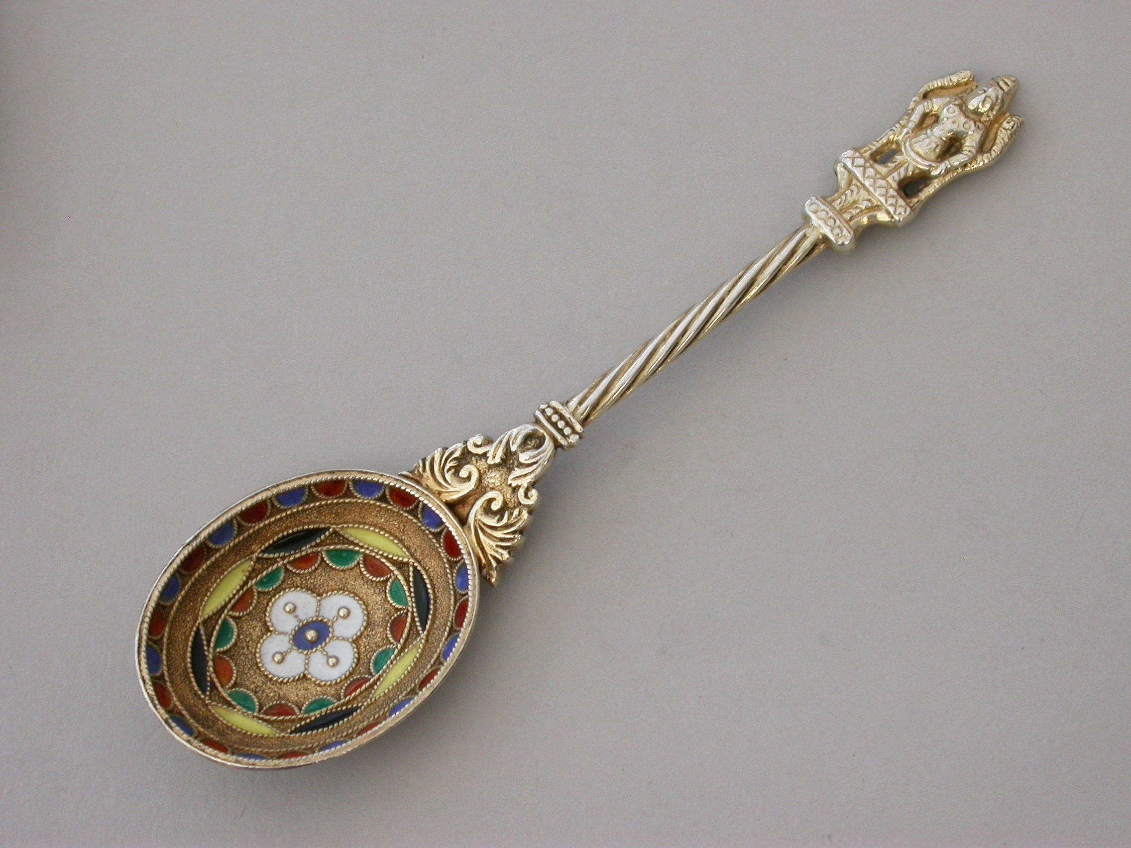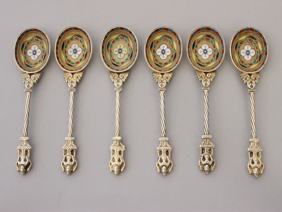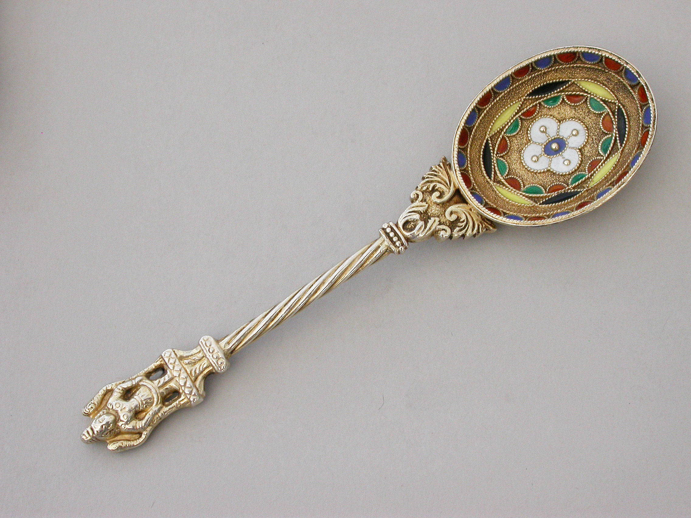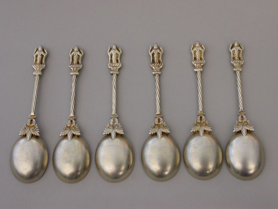 An unusual set of six Victorian silver gilt Teaspoons with Indian Deity finials above twisted stems with extravagant winged shoulders terminating in large oval bowls inlaid with gilt cloisonne and polychrome enamel. Imitating the styles of both Norway and Russia.