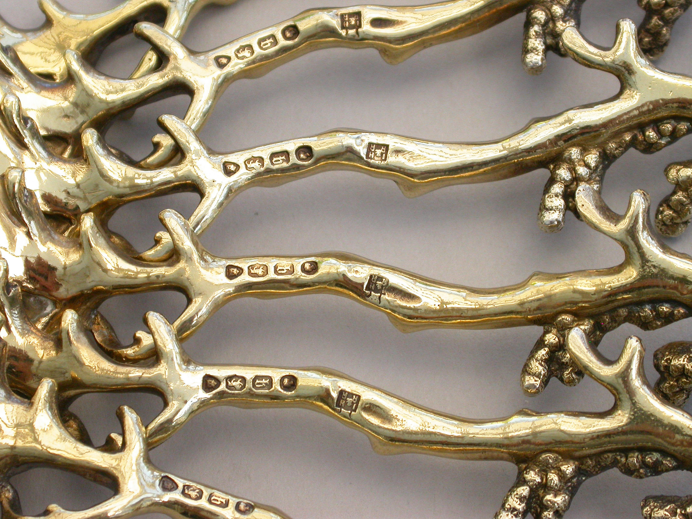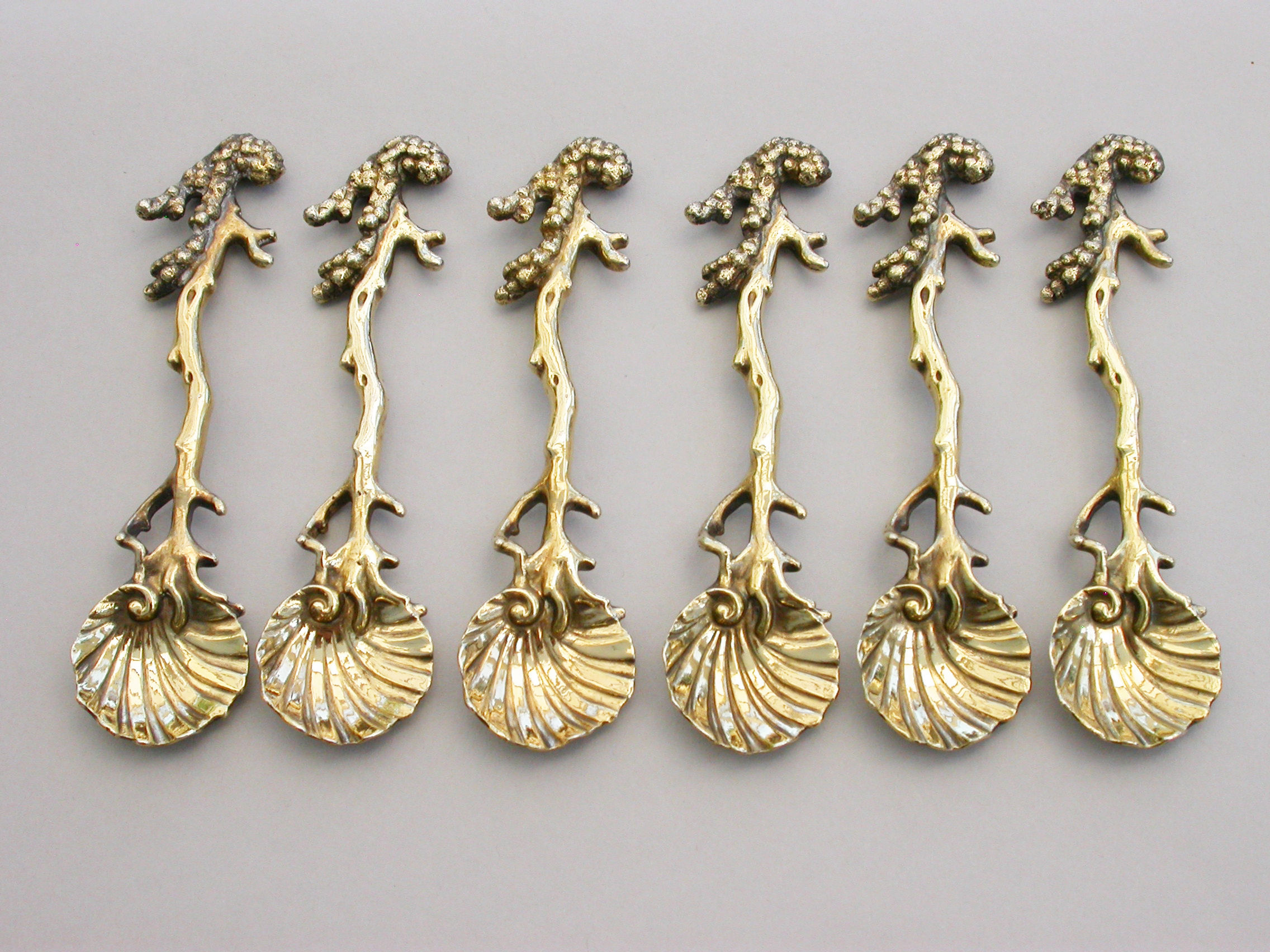 A fine quality set of six Victorian heavy cast silver gilt nautical Salt Spoons with seaweed handles and shell shaped bowls engraved with contemporary armorial crests.