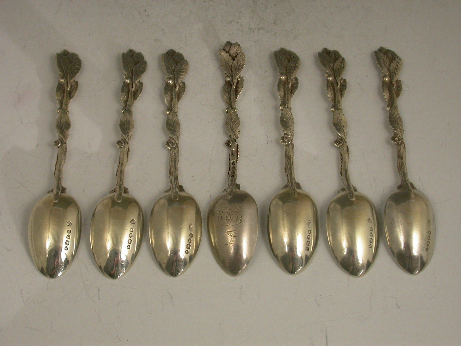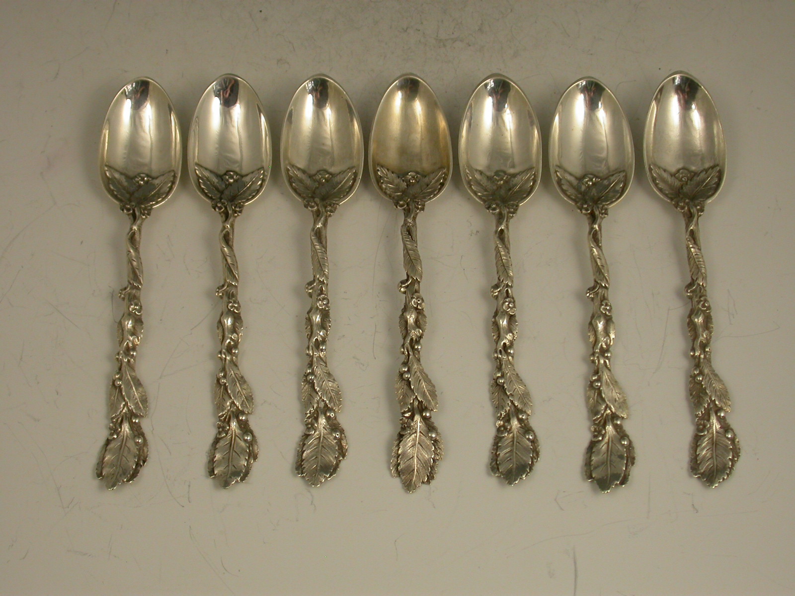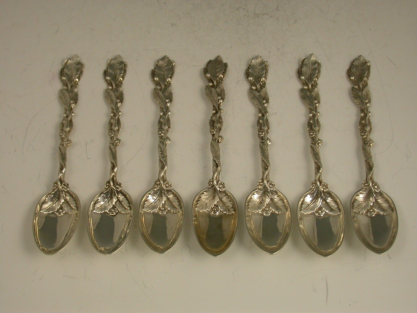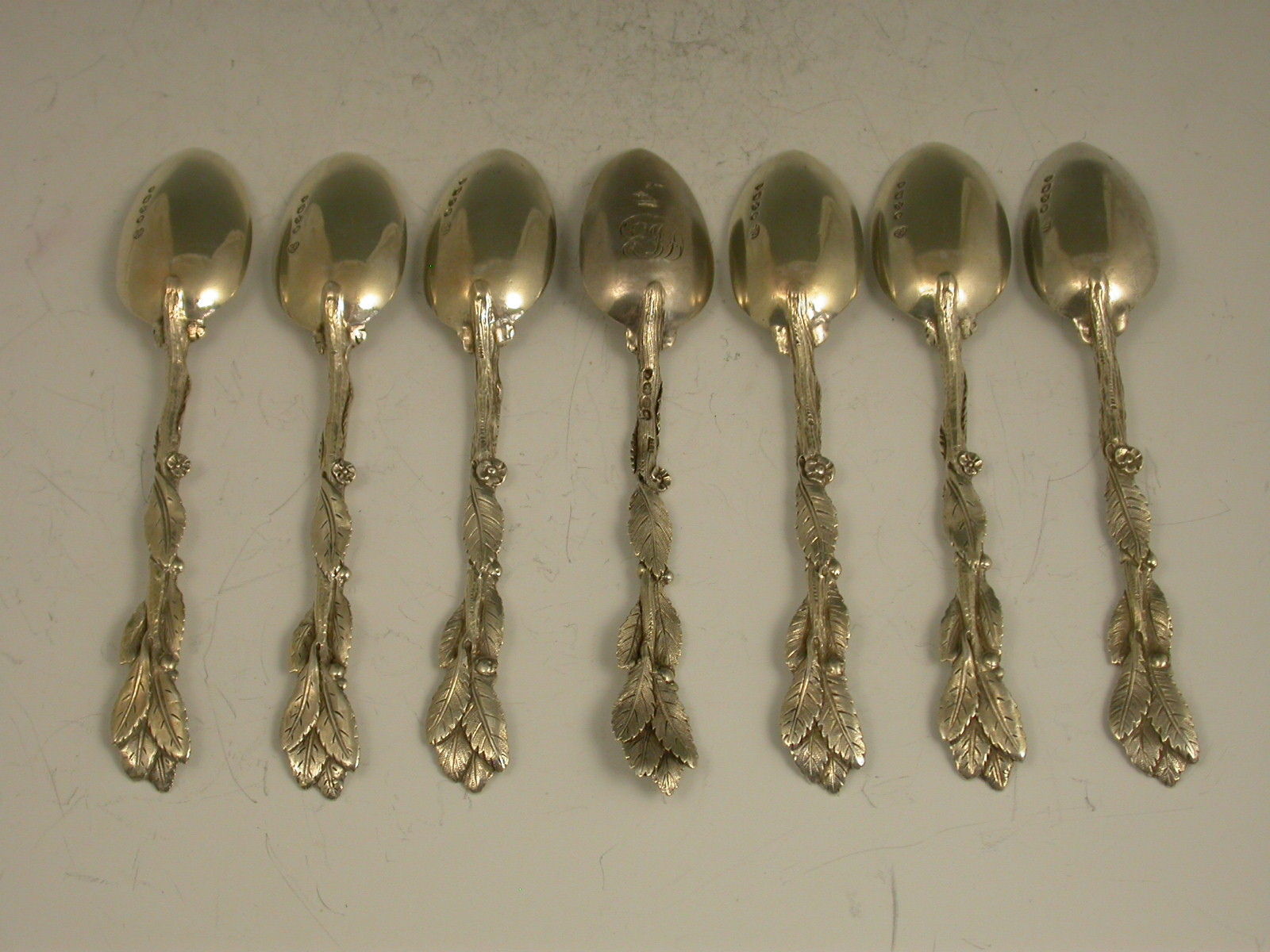 Set 7 Victorian Cast Silver Naturalistic Leaf Teaspoons
