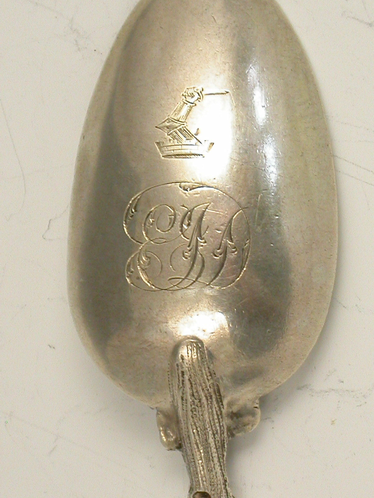 One engraved with a crest and initials.