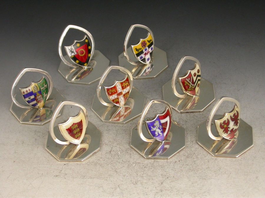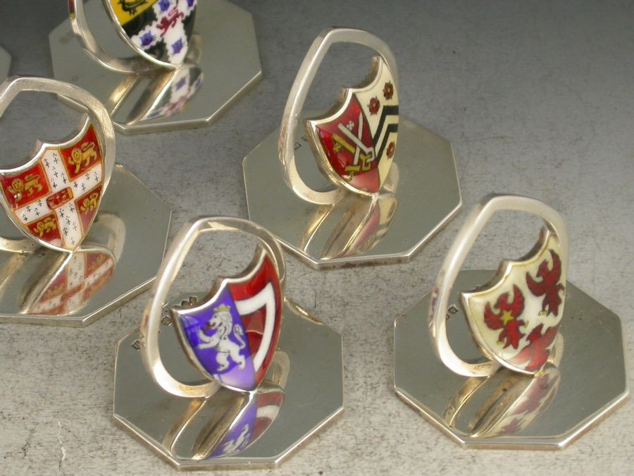 Set 8 Edwardian Silver & Enamel 'Oxford & Cambridge University Colleges' Menu Holders