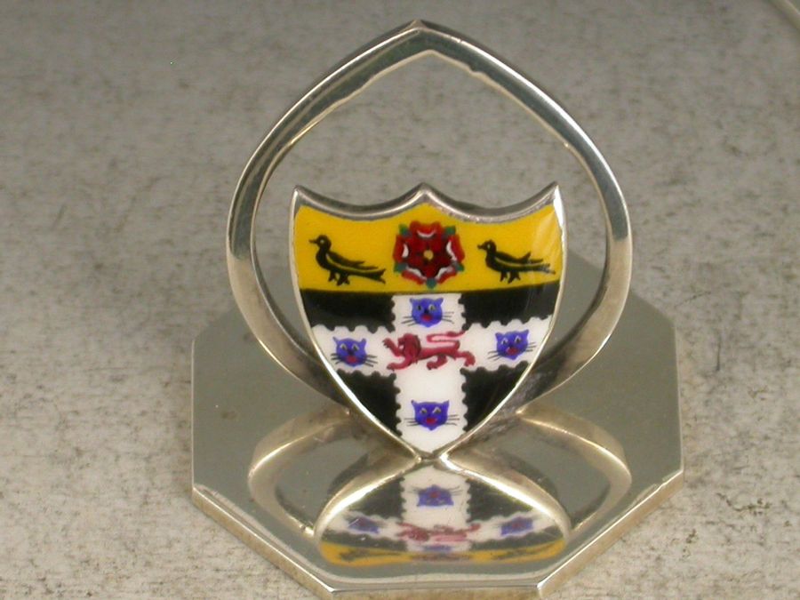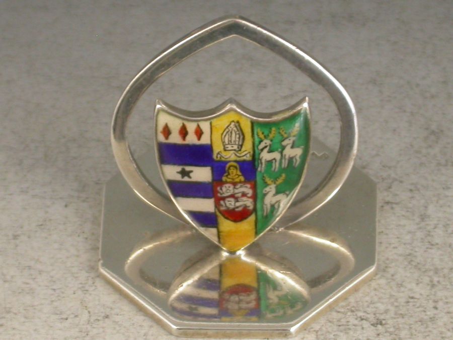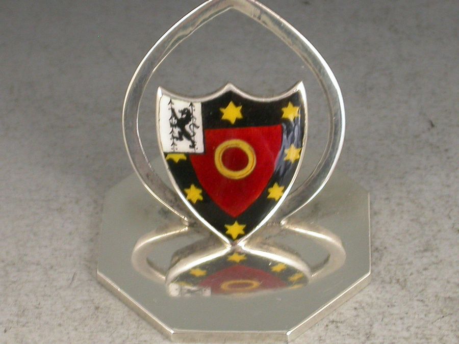 A fine and rare set of eight Edwardian silver and enamel Oxford and Cambridge University Colleges Menu Holders, the shield shaped stands on octagonal bases, enamelled with the Coats of Arms of St Johns College, Lincoln College, Christchurch College, Balliol College, Queens College, Oriel College, New College and Cambridge University.