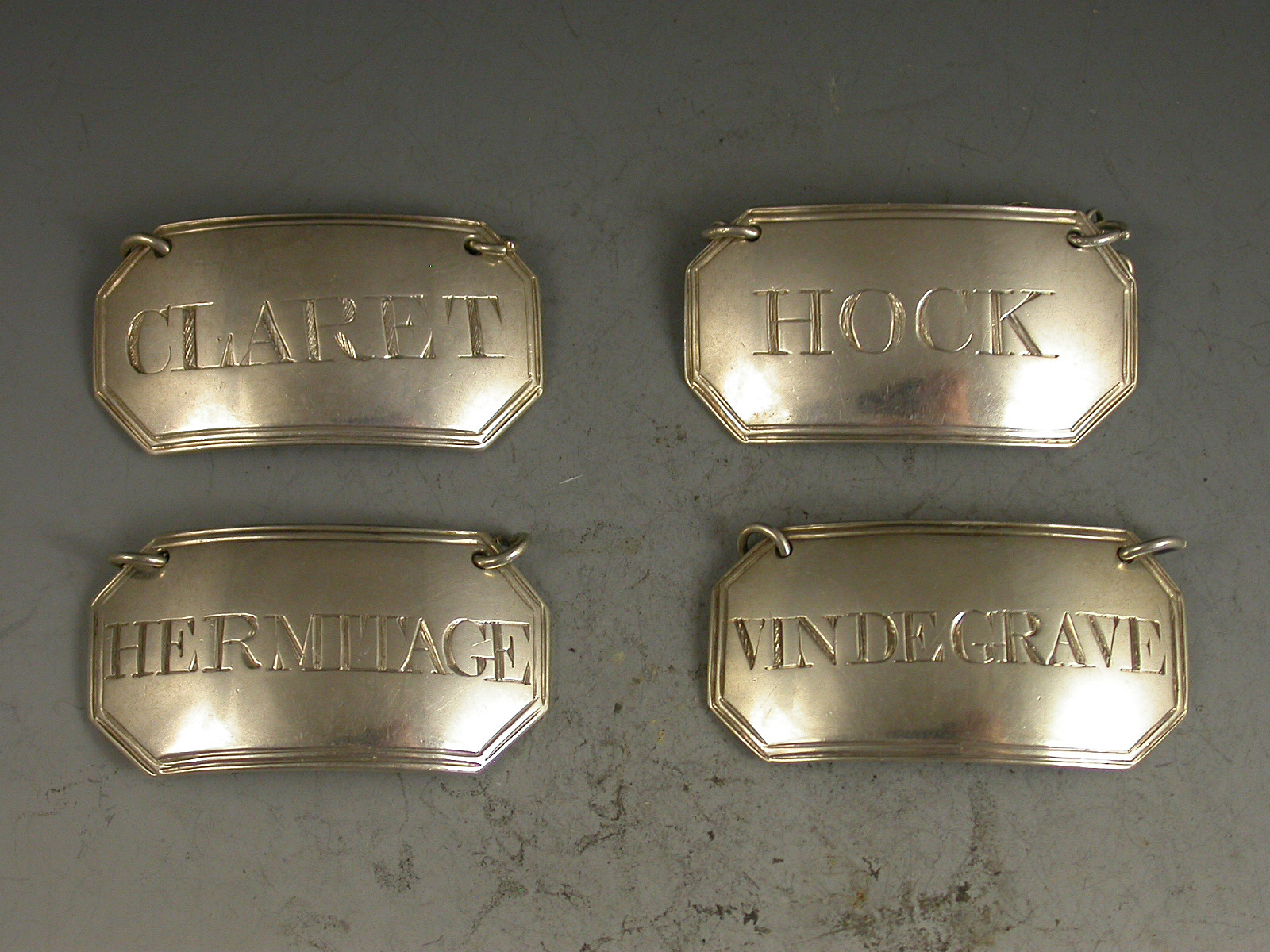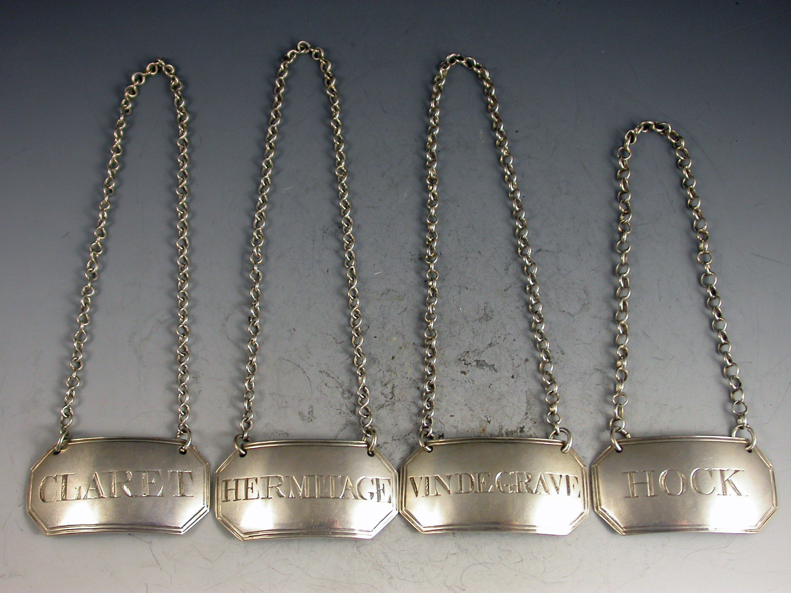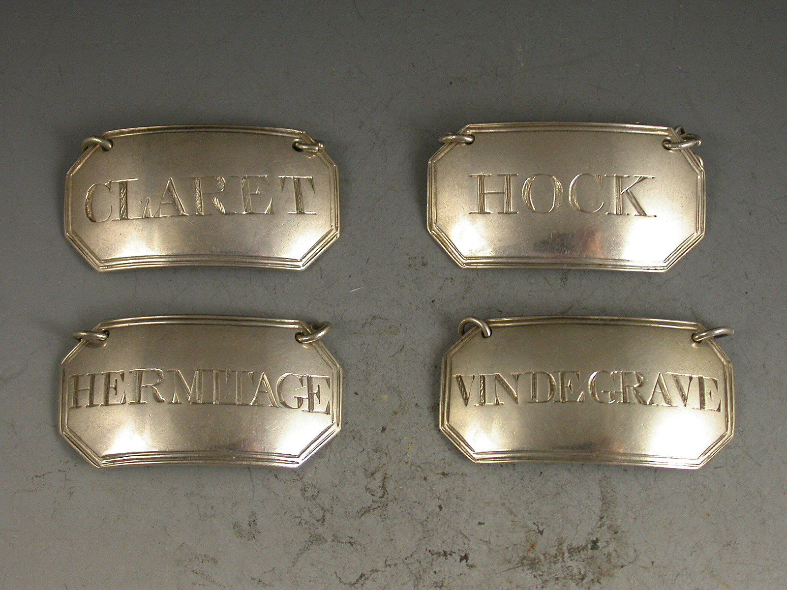 Set Four George III Irish Silver Wine Labels 'Vin De Grave, Hock, Claret & Hermitage'