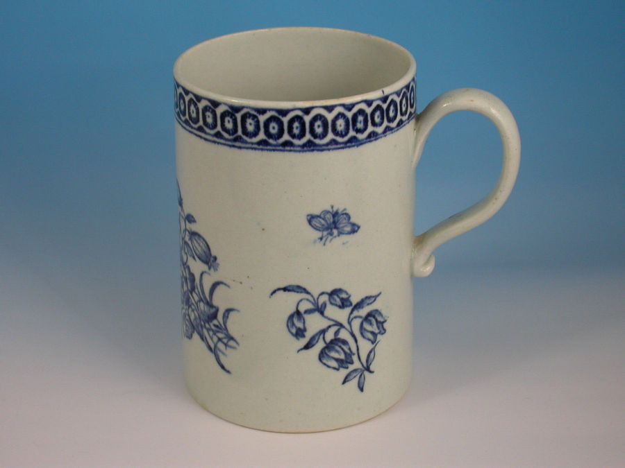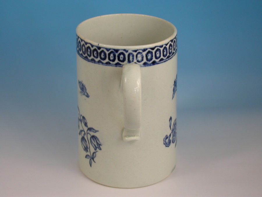 A fine Seth Pennington cylindrical Mug with solid ear shaped handle printed in under-glaze blue with a large floral spray enclosed by scattered sprays and insets, all within a wide dot border.