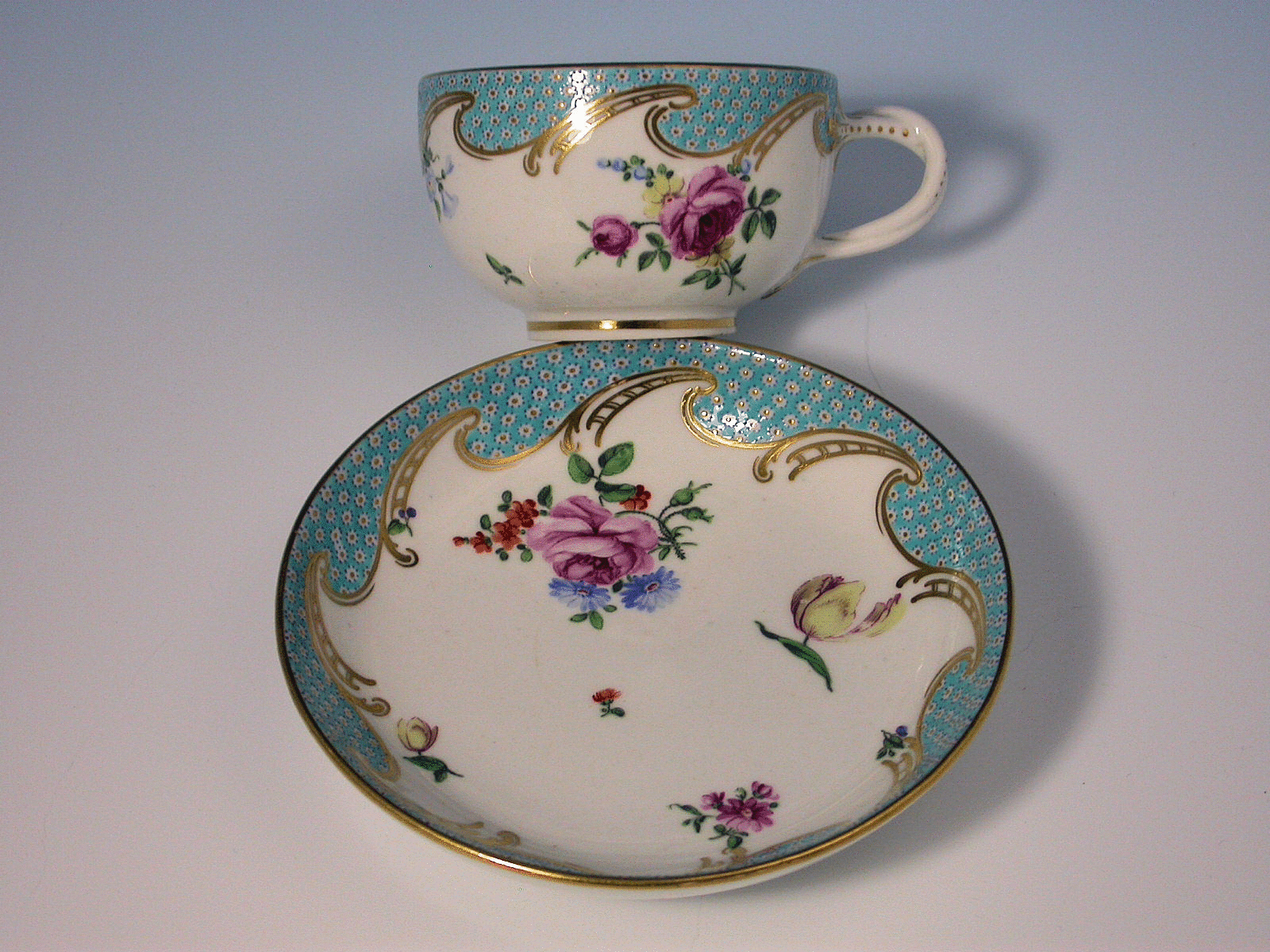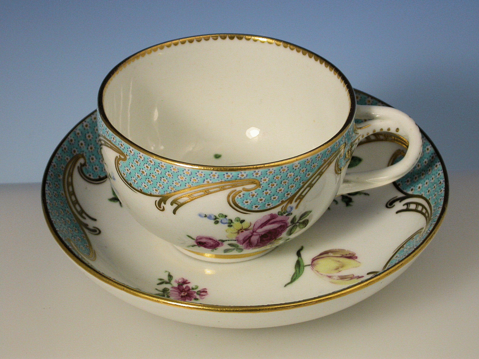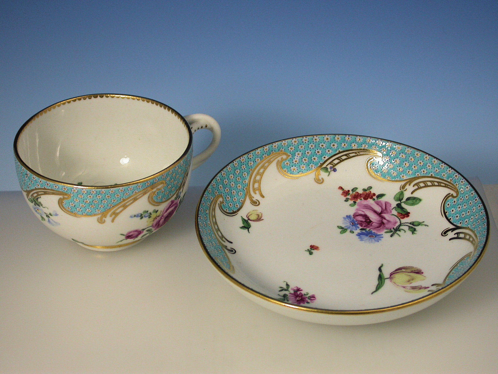 A very fine and rare Chelsea Derby Teacup & Saucer, the cup with twisted loop handle, painted in Serves style with sprays and bouquets of English flowers within a border of gilt enriched cornucopia reserves with turquoise ground, gilt lined rims.
