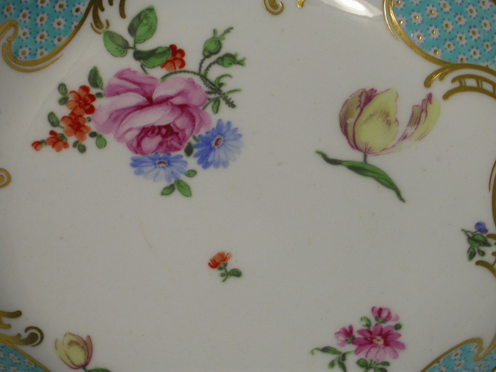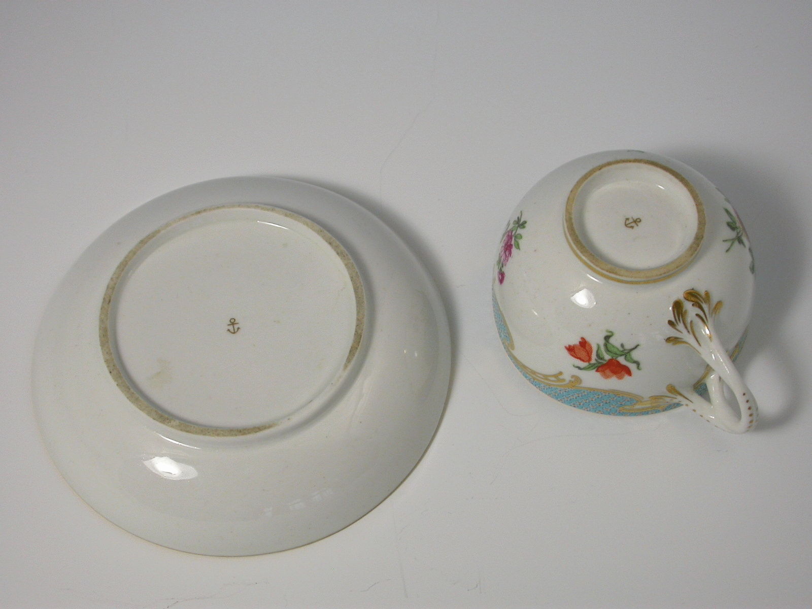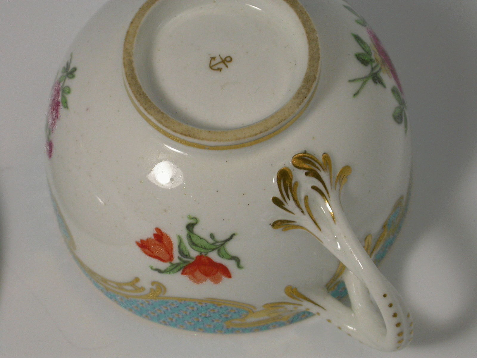 A very fine and rare Chelsea Derby Teacup & Saucer, the cup with twisted loop handle, painted in Serves style with sprays and bouquets of English flowers within a border of gilt enriched cornucopia reserves with turquoise ground, gilt lined rims.
