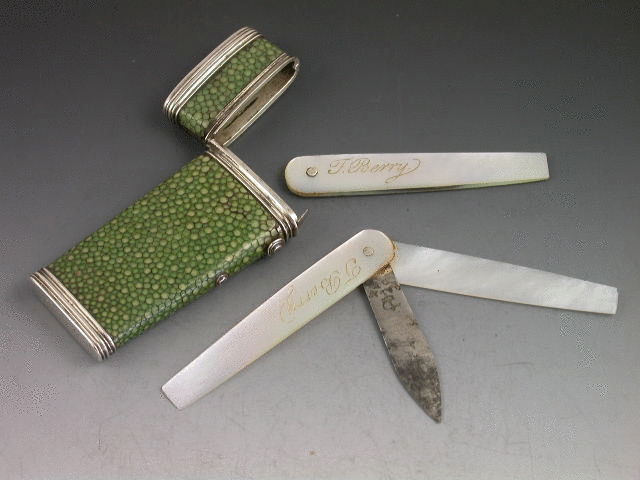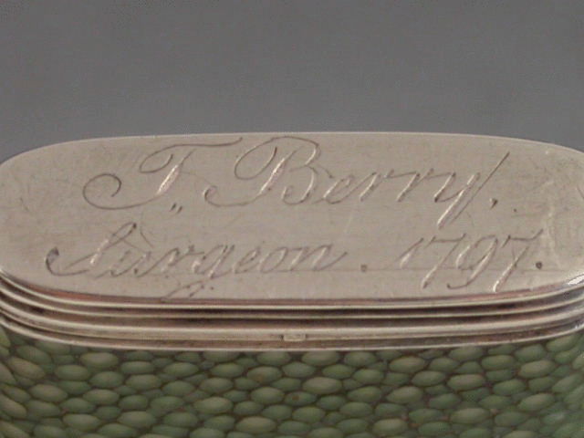 Unmarked c1720. The base of the case engraved “J .Berry, Surgeon 1797”, The lid of the case engraved with the initials “JB”, the Lancet covers also engraved “J Berry”. The steel Lancets also marked.