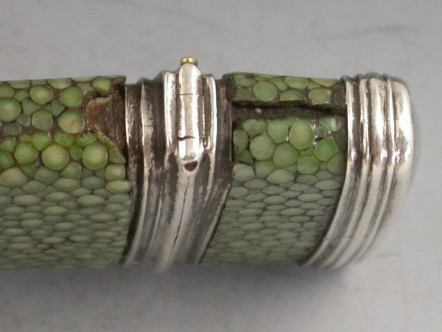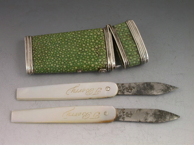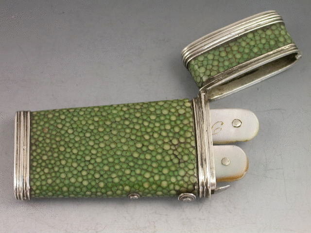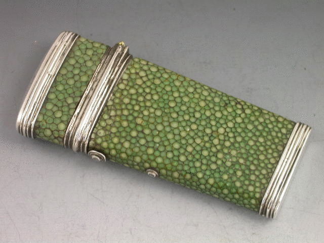 A rare and interesting early 18th century silver mounted Shagreen covered Lancet Case, with push button hinged cover opening to reveal the two steel Lancets with Mother of Pearl covers.