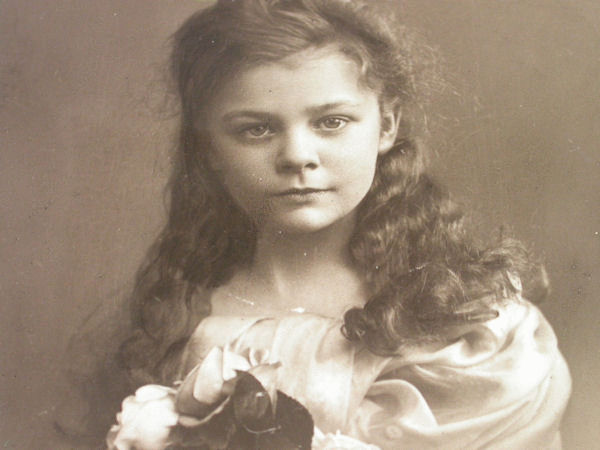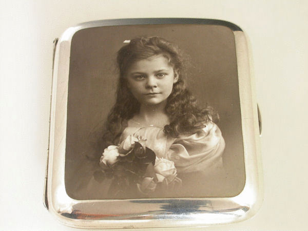 A good Antique silver and enamel Cigarette Case of curved rounded rectangular form with silver gilt interior, the front with superb quality sepia enamelled portrait of a pretty young girl with flowing locks holding a bouquet of roses.