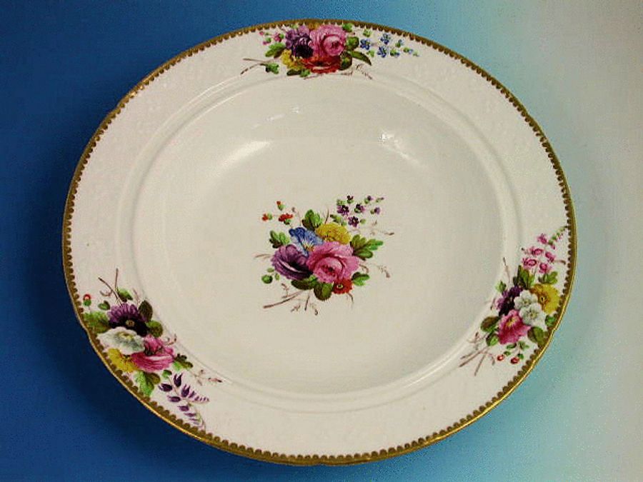 A fine Spode Muffin Dish & Cover painted with a central bouquet of English flowers within a moulded floret border enclosing three bouquets of English flowers, gilt dentil borders. Gilt cherry finial.