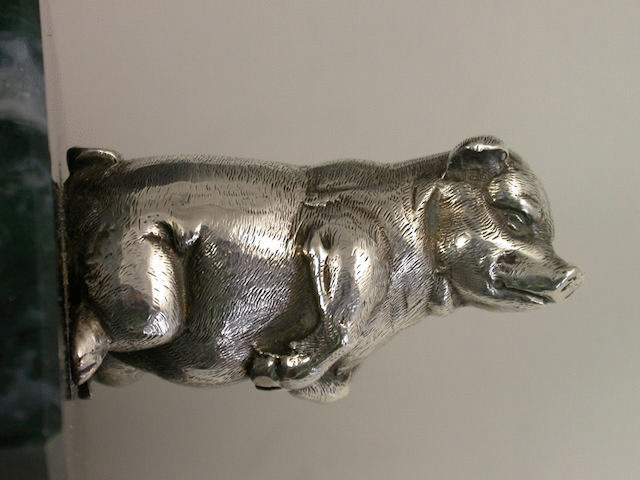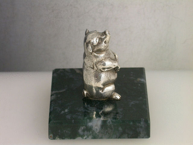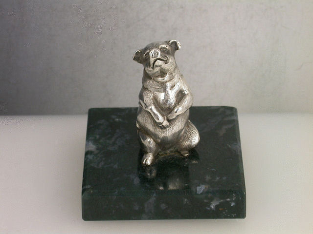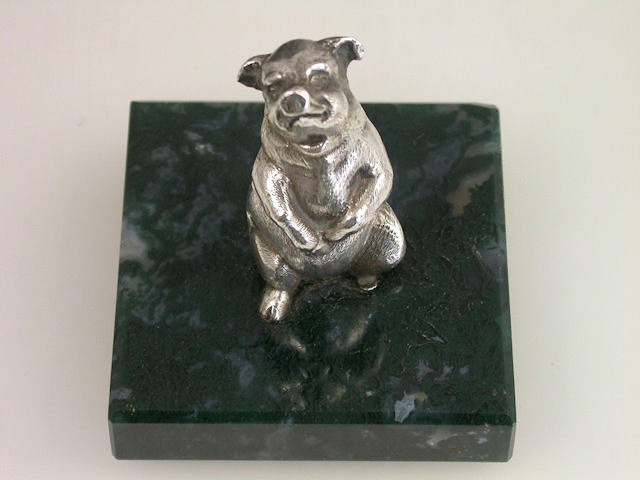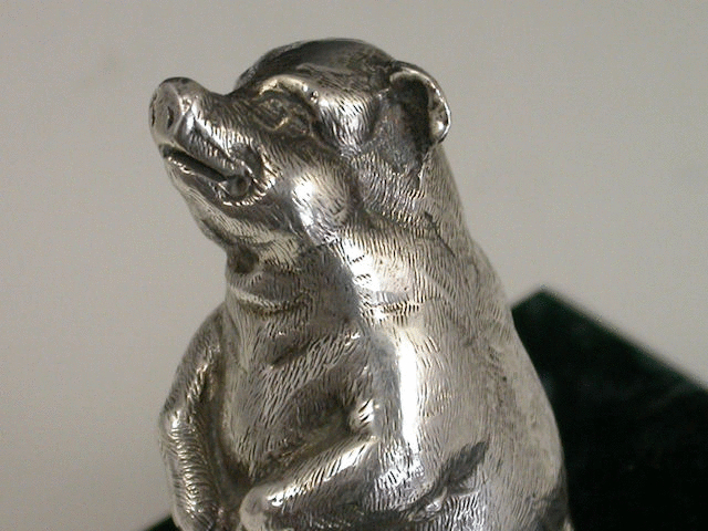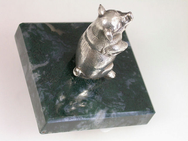 An early 20th century cast silver model of a Pig standing on its hind legs, seated on a green and blue crazed agate plinth, very finely modelled with superb detail and a great expression.