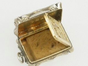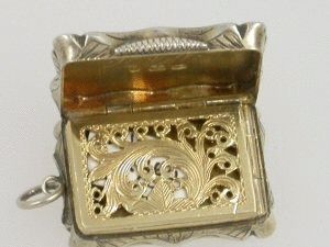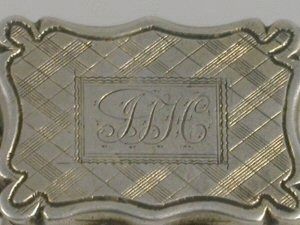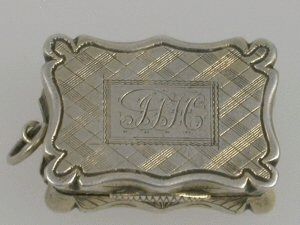 A good early Victorian silver Vinaigrette of shaped rectangular form, the base and lid engraved with a tartan design, contemporary initials to cartouche and interior lid, silver gilt interior with intricately pierced grille. Complete with original sponge.