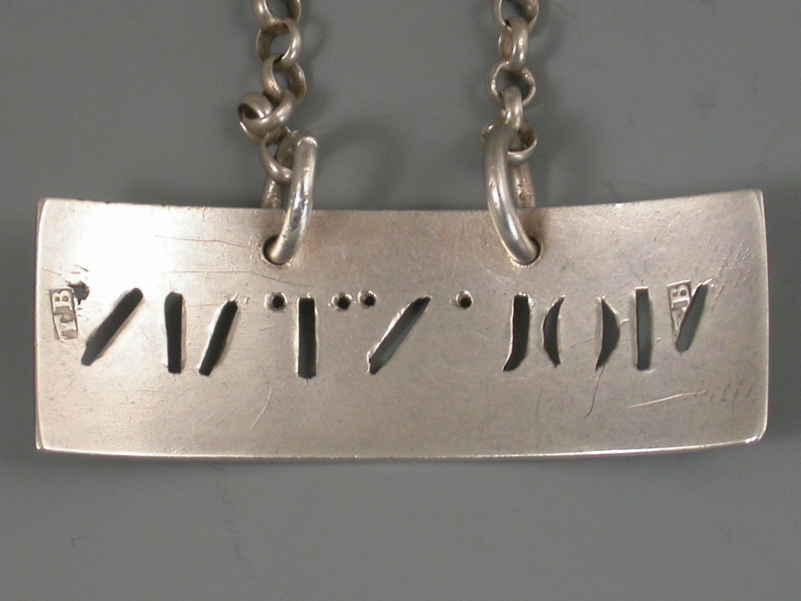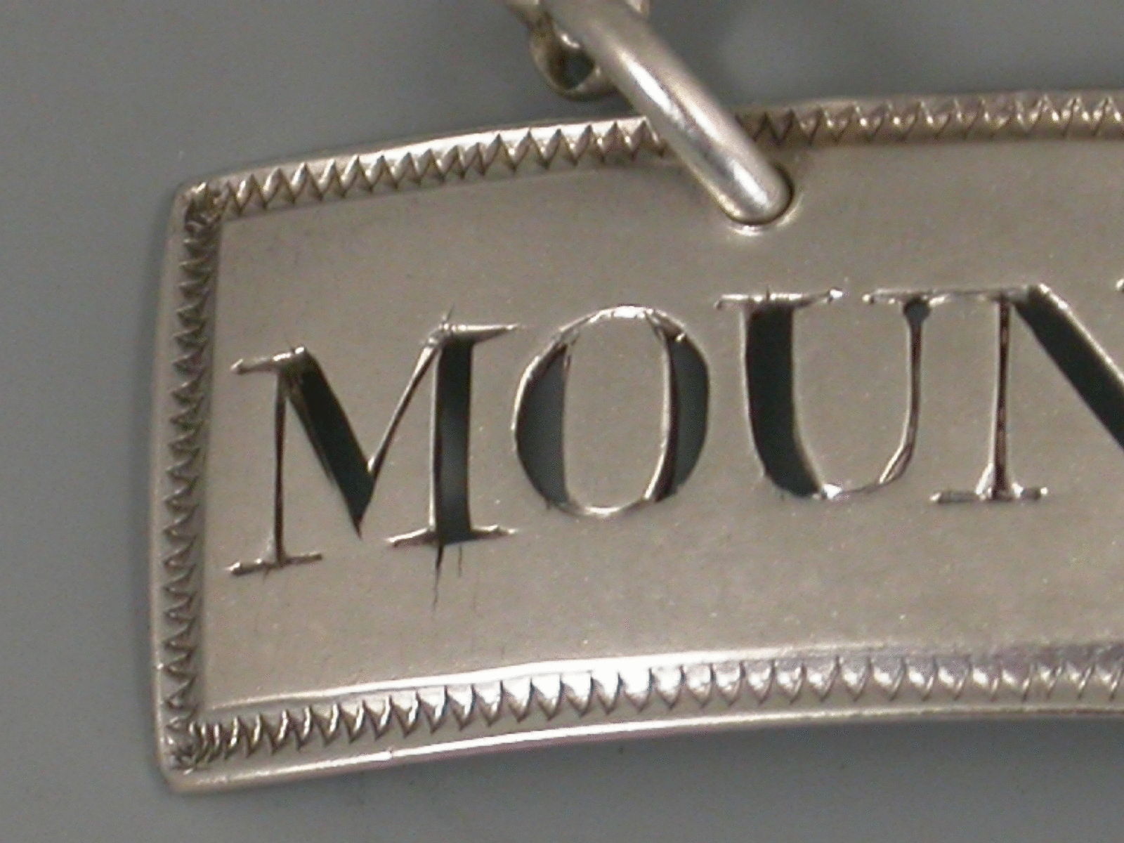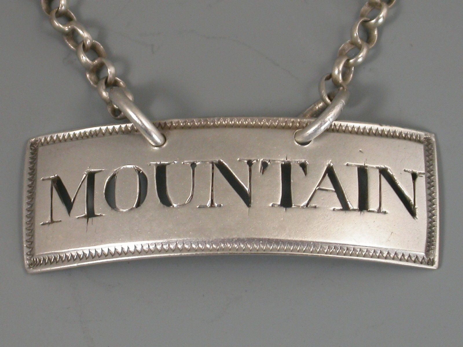 An unusual antique silver Wine Label of curved narrow rectangular form with 'dog-tooth' engraved border, pierced for Mountain.