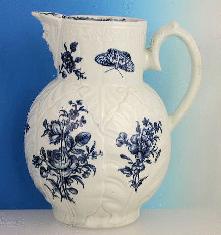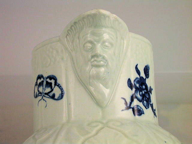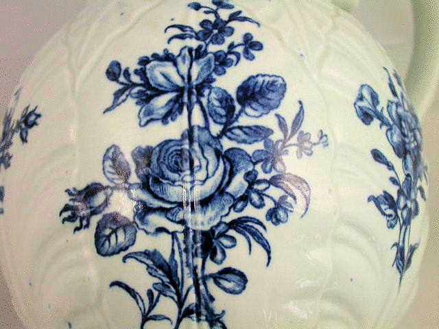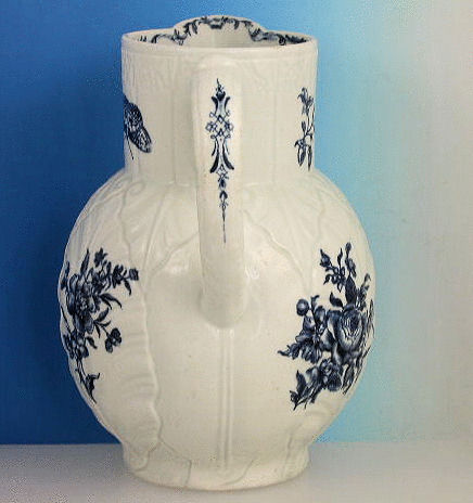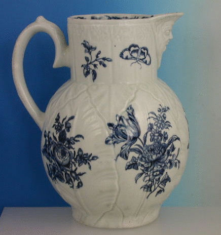 An unrecorded Dr Wall Worcester blue and white Mask Jug of moulded form, printed with the “Delicate Rose Pattern”, a prominent tulip (unrecorded) as well as the “Rose and Running Border” print only known on Blind Earl Plates. The border painted in underglaze blue (also unrecorded). Early handle shape.