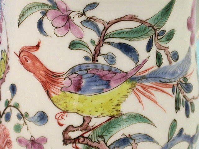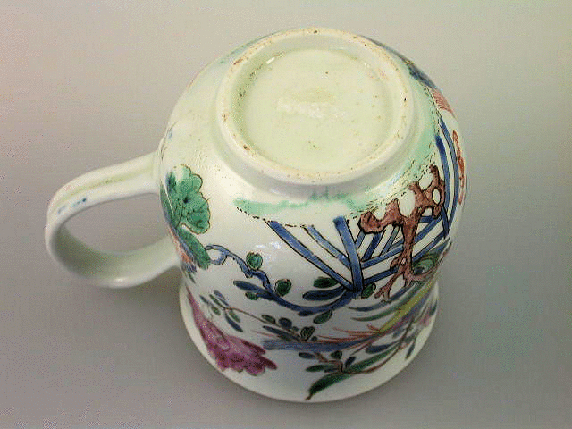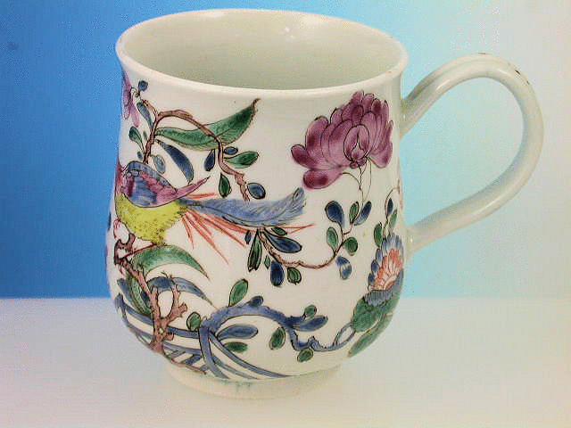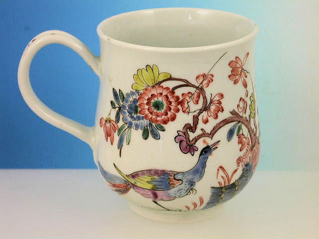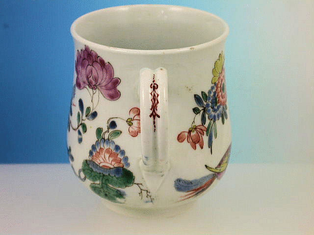 An unrecorded early Worcester bell shaped Mug with notched grooved strap handle, brilliantly painted in polychrome enamels in Chinese famille rose and famille verte palettes and depicting two long tailed birds in foliage, encapsulating the Banded Hedge and Wheatsheaf pattern, the strap handle picked out in iron red enamel.