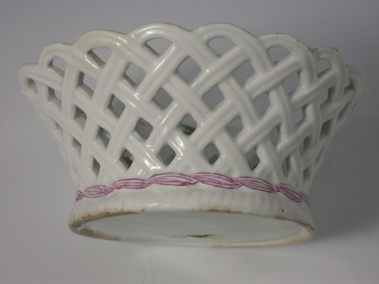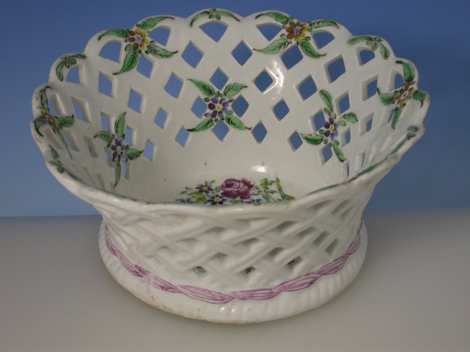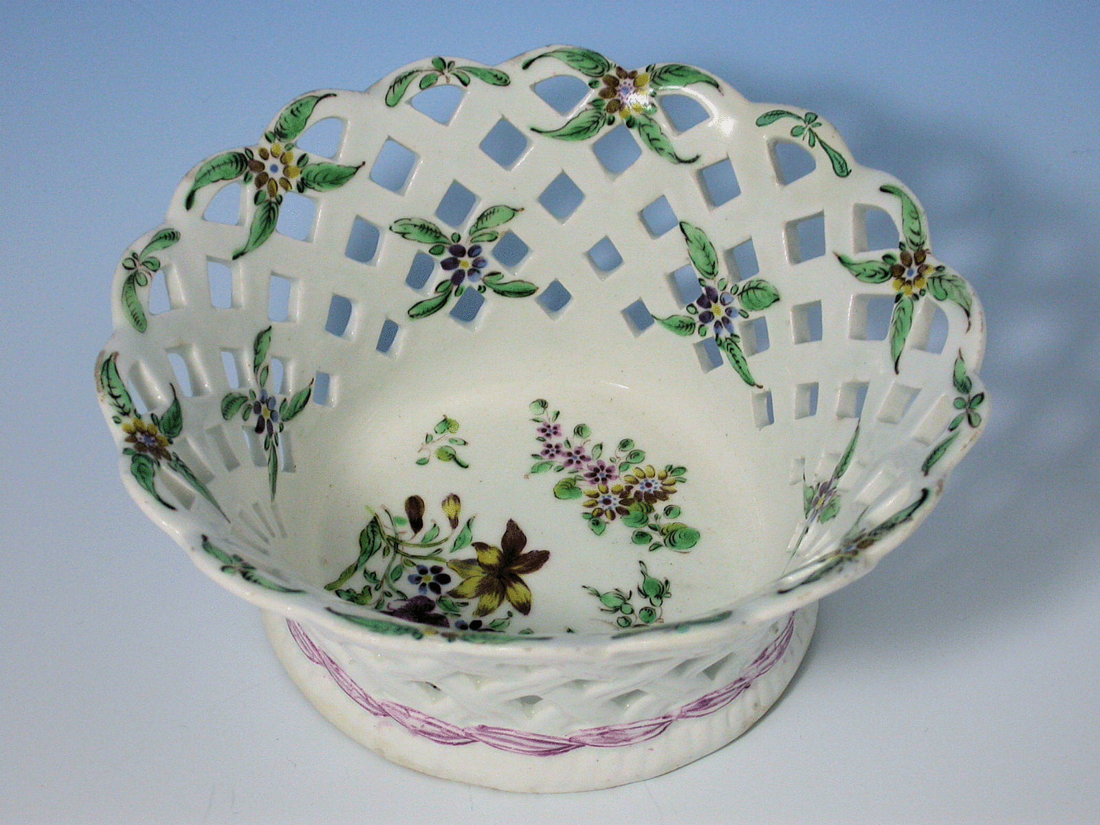 An unusual Bow circular pierced Basket, painted with flowers and foliage.