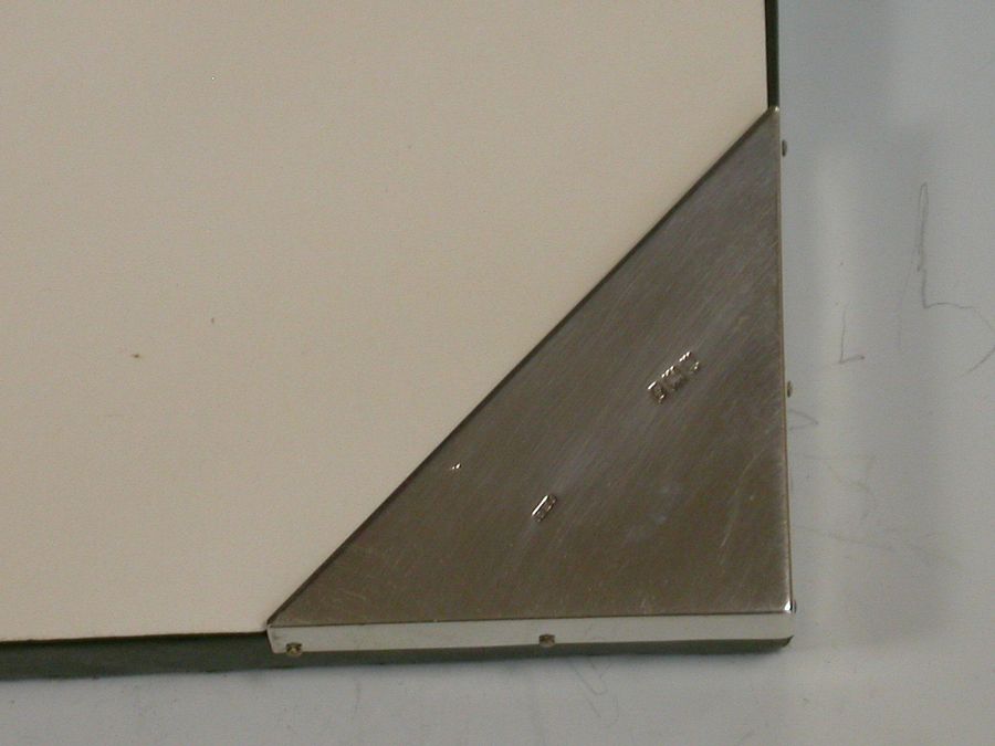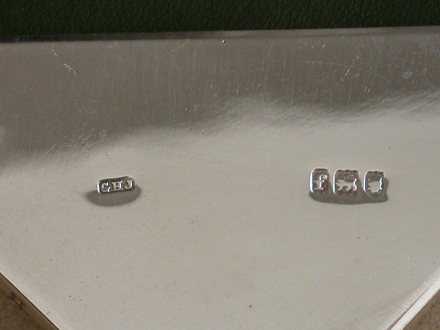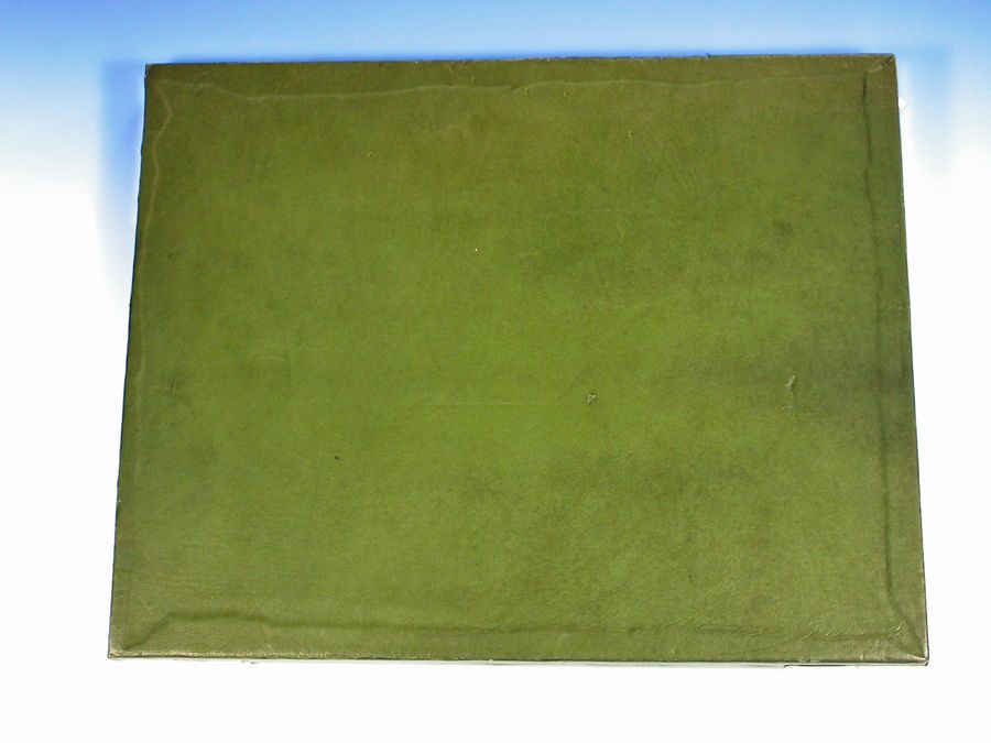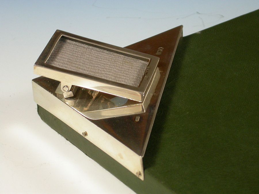 An unusual early Edwardian silver mounted green leather covered Desk Blotter, the blotting paper held in place by four triangular silver mounts to the corners, one surmounted by a sprung silver letter clip / photo frame.
