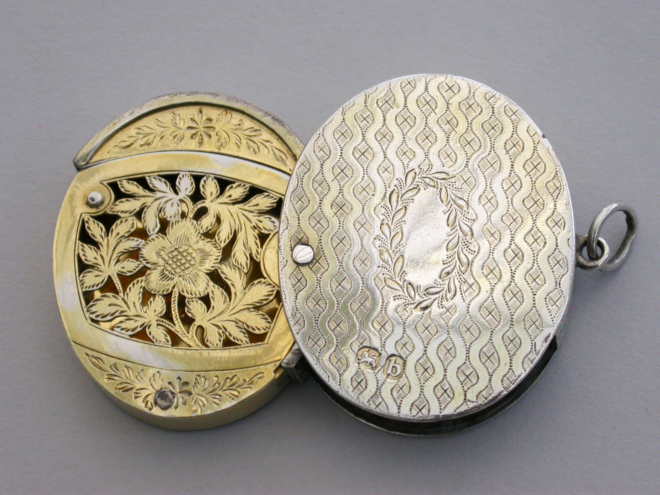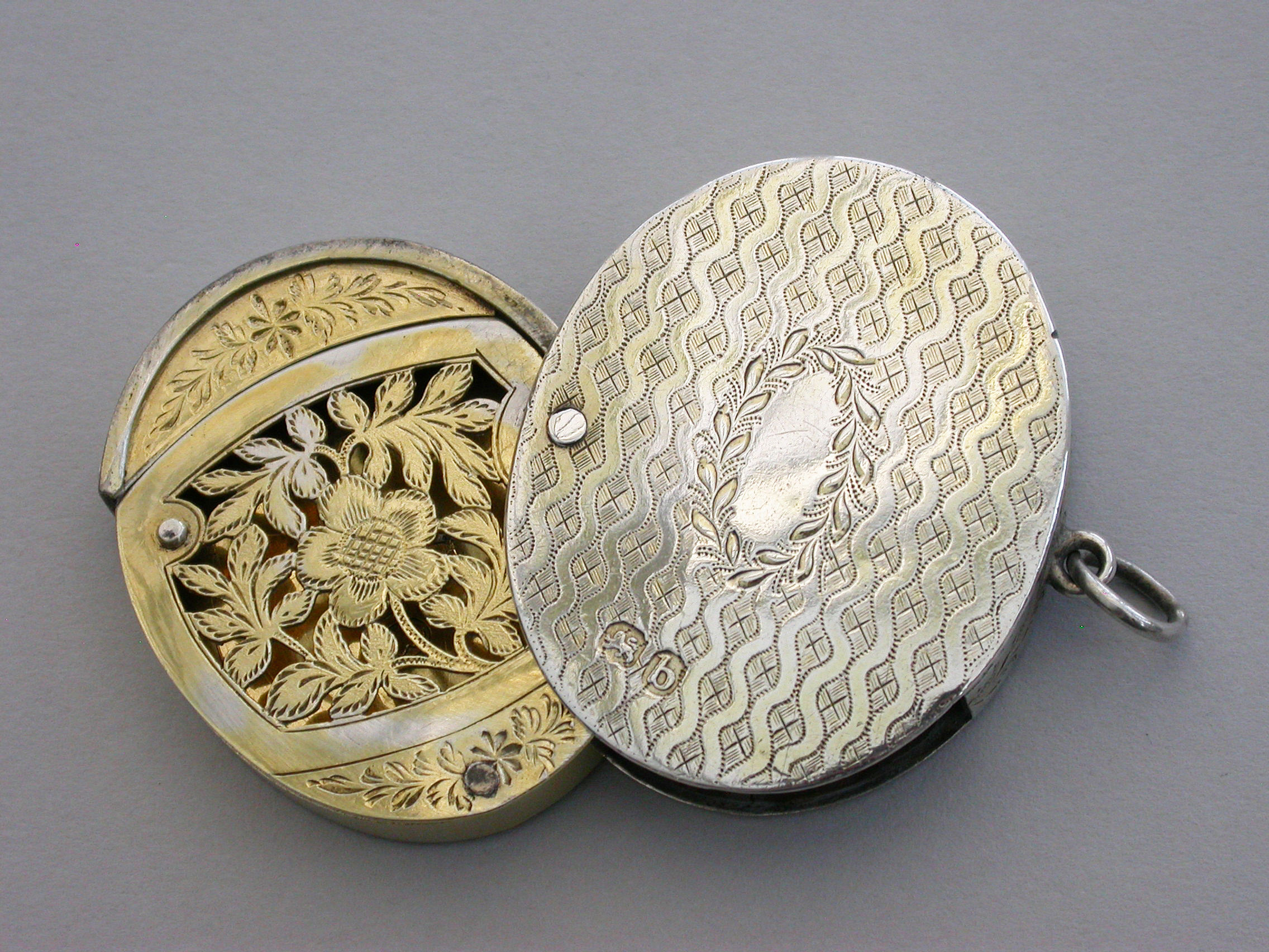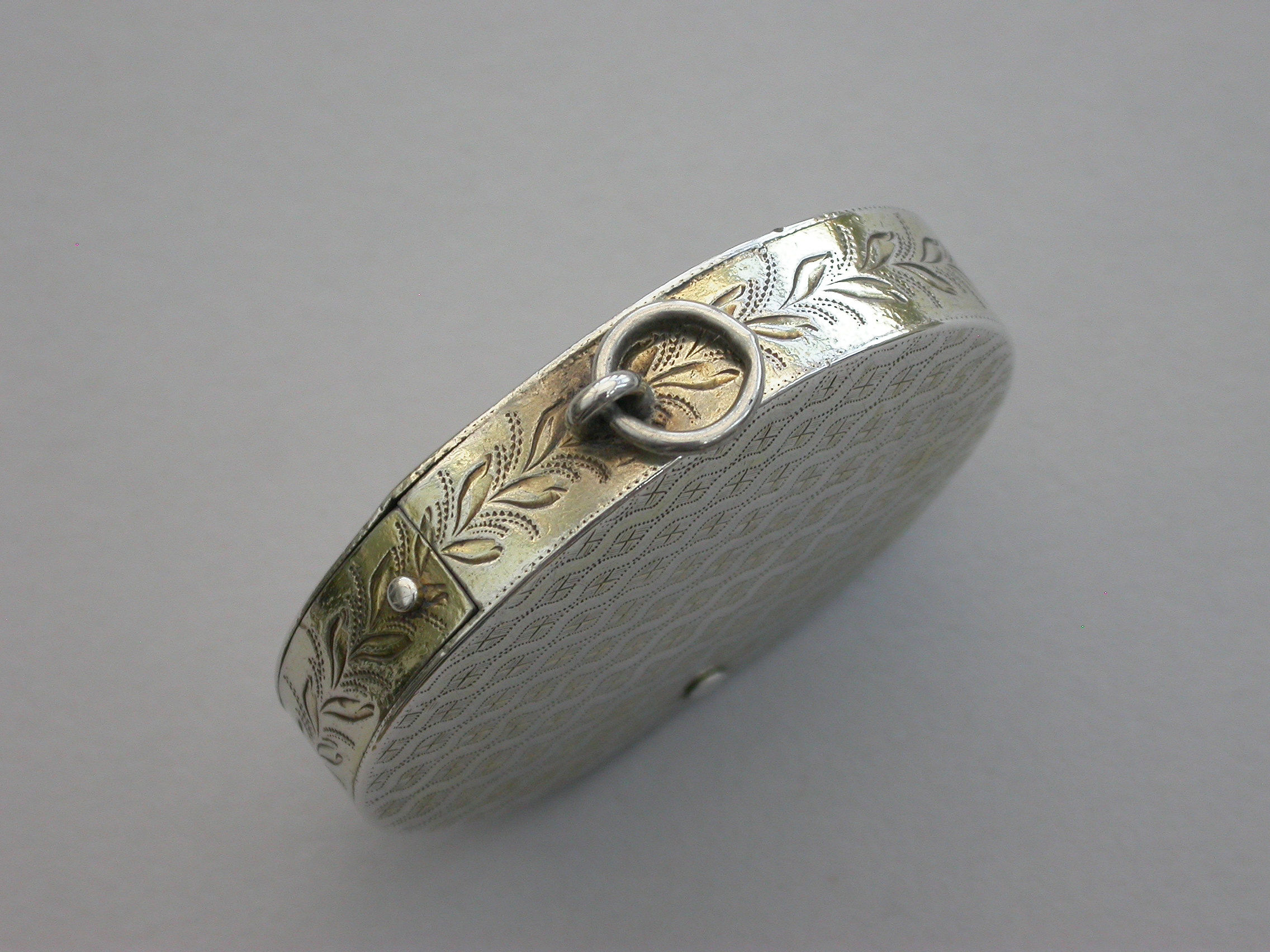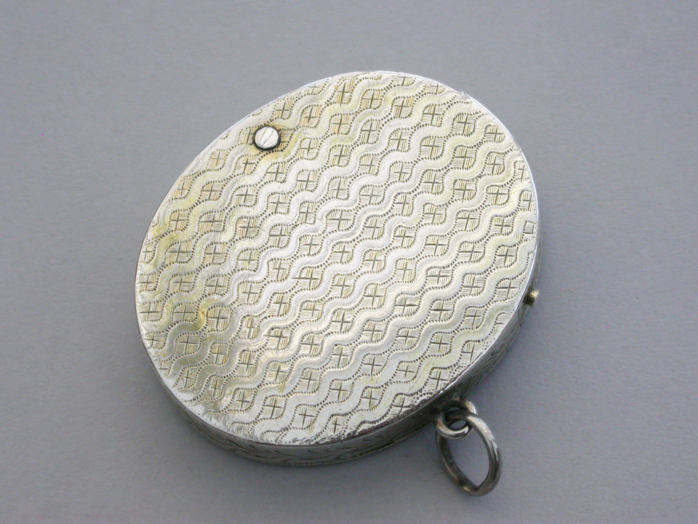 A most unusual George III silver Vinaigrette of oval form with attached suspension ring, the base lid and sides with wriggle work and foliate engraving, the interior compartment swiveling open to reveal a finely pierced sliding grille.