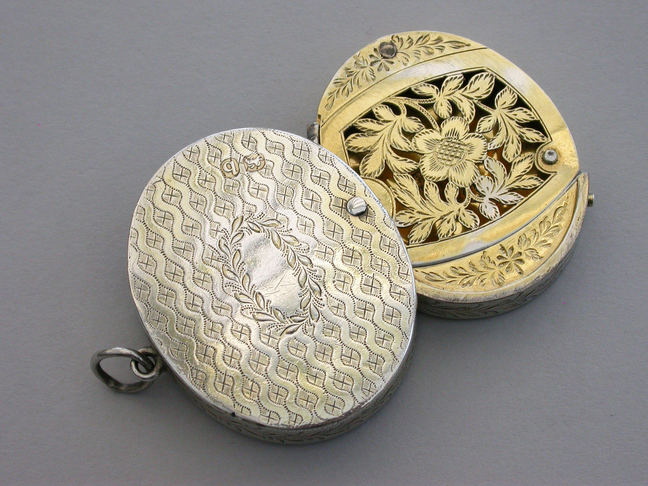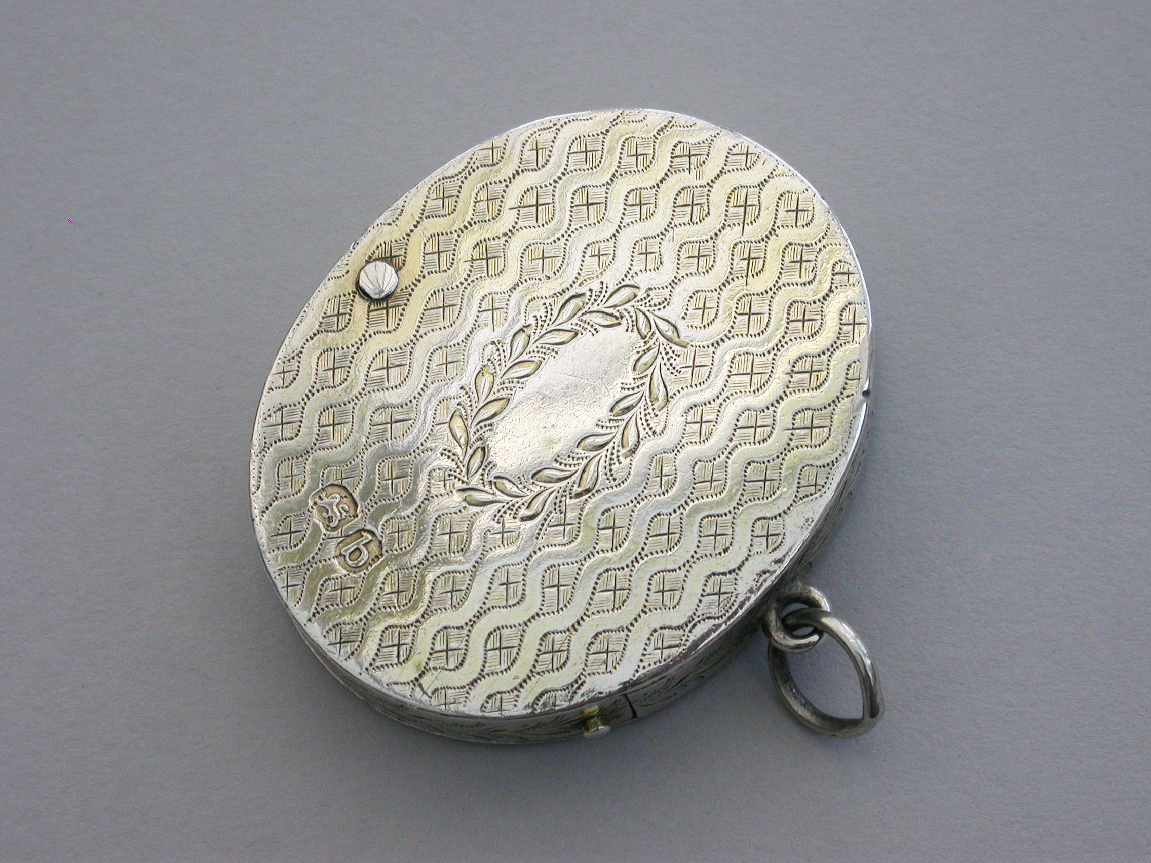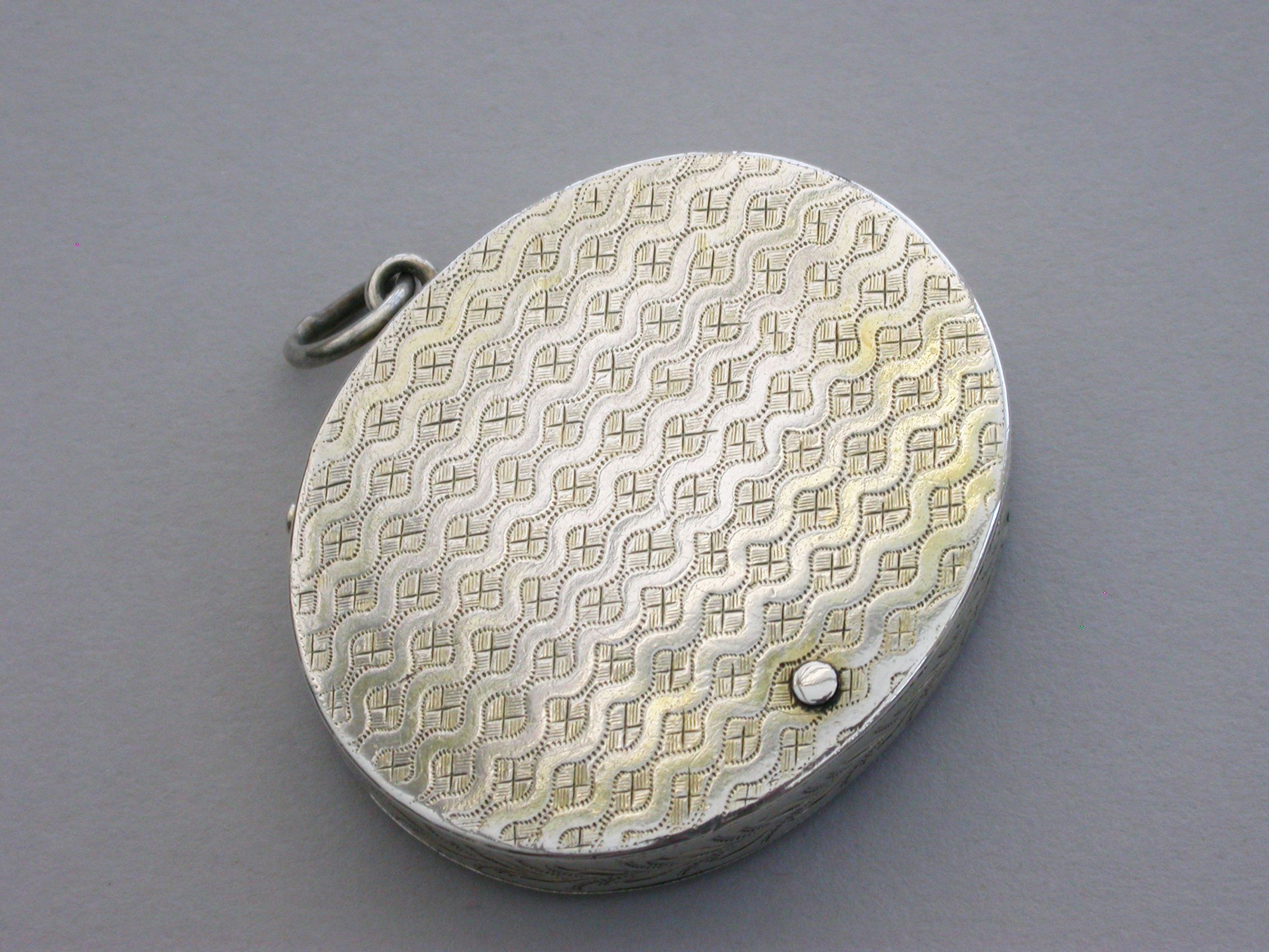 A most unusual George III silver Vinaigrette of oval form with attached suspension ring, the base lid and sides with wriggle work and foliate engraving, the interior compartment swiveling open to reveal a finely pierced sliding grille.