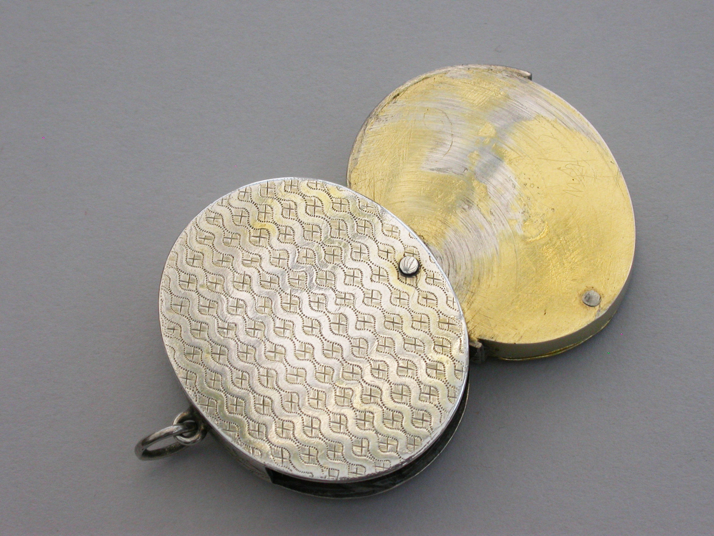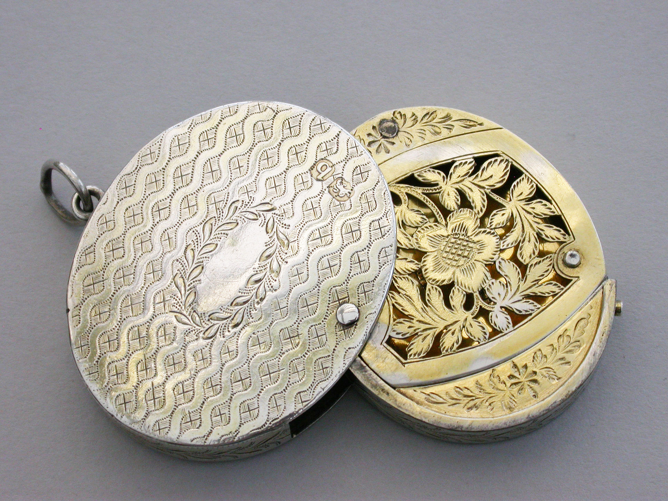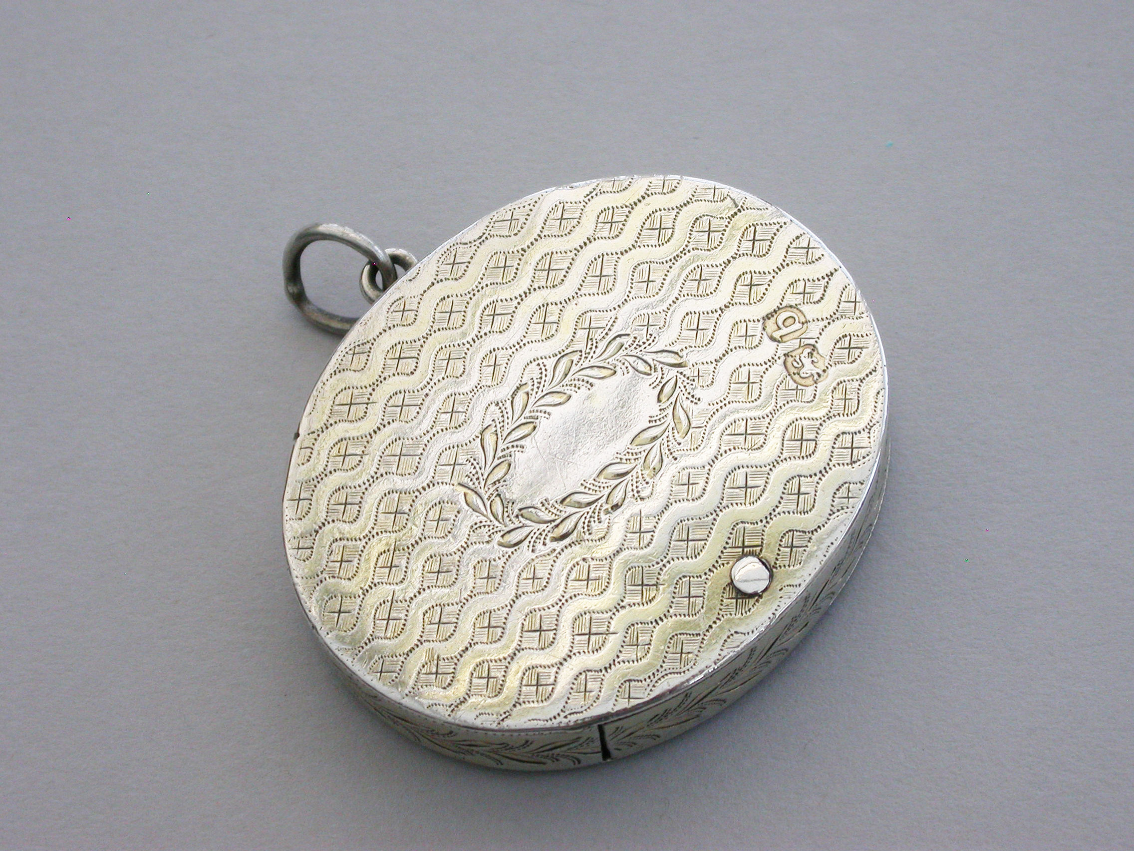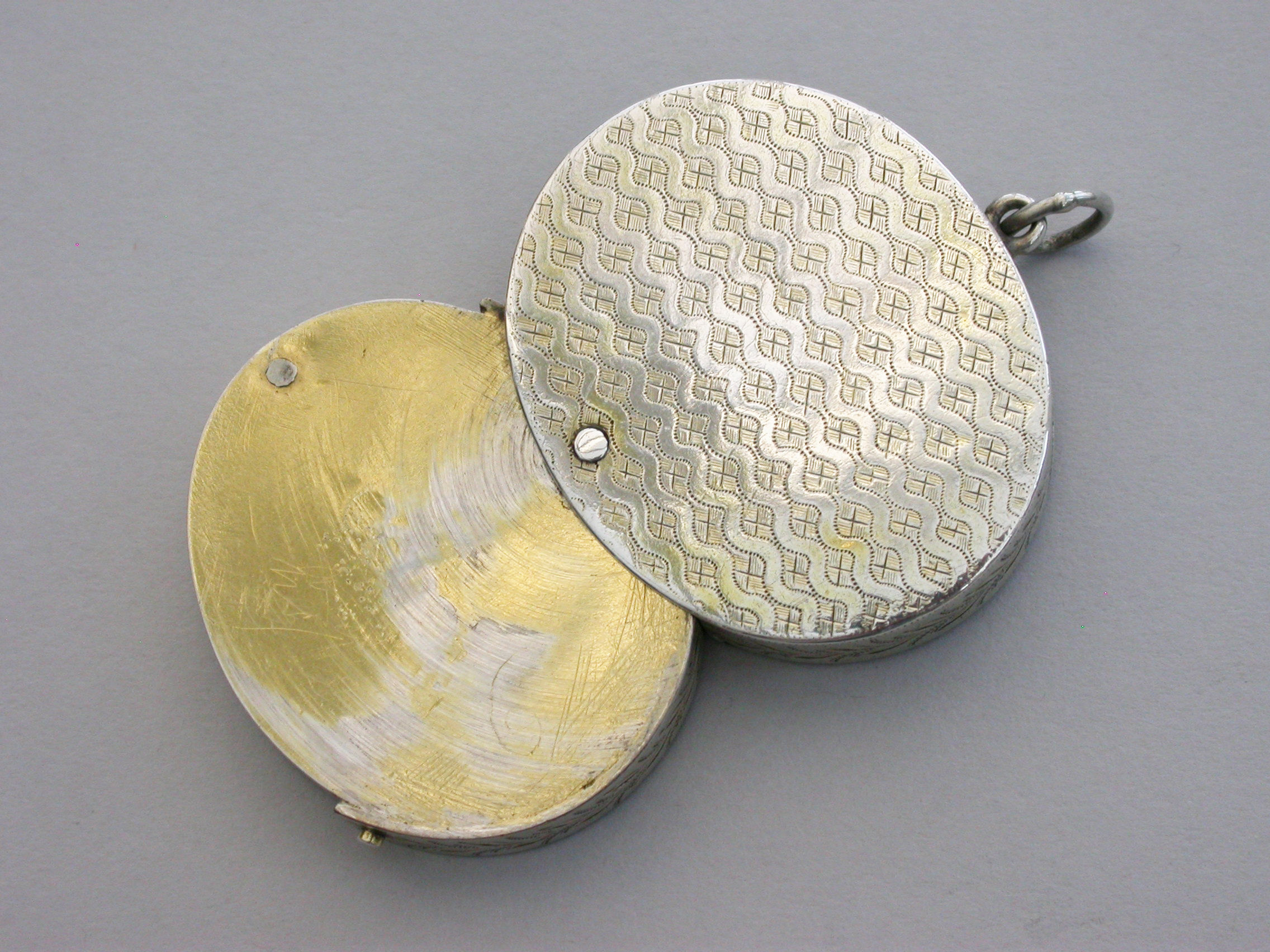A most unusual George III silver Vinaigrette of oval form with attached suspension ring, the base lid and sides with wriggle work and foliate engraving, the interior compartment swiveling open to reveal a finely pierced sliding grille.