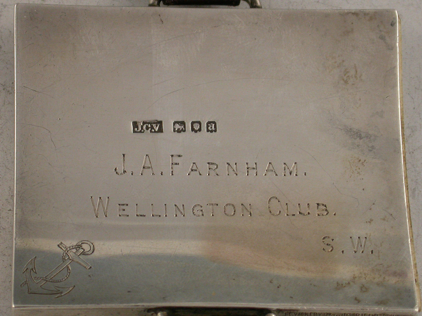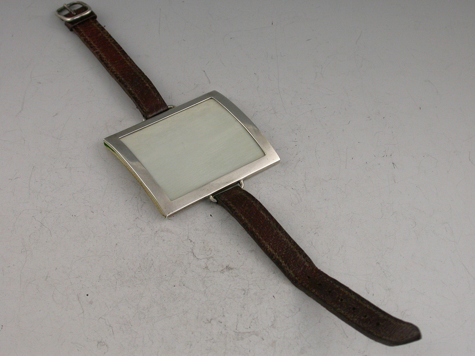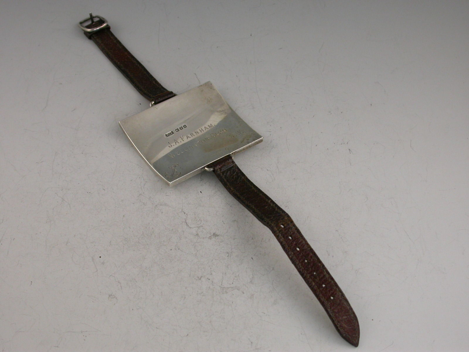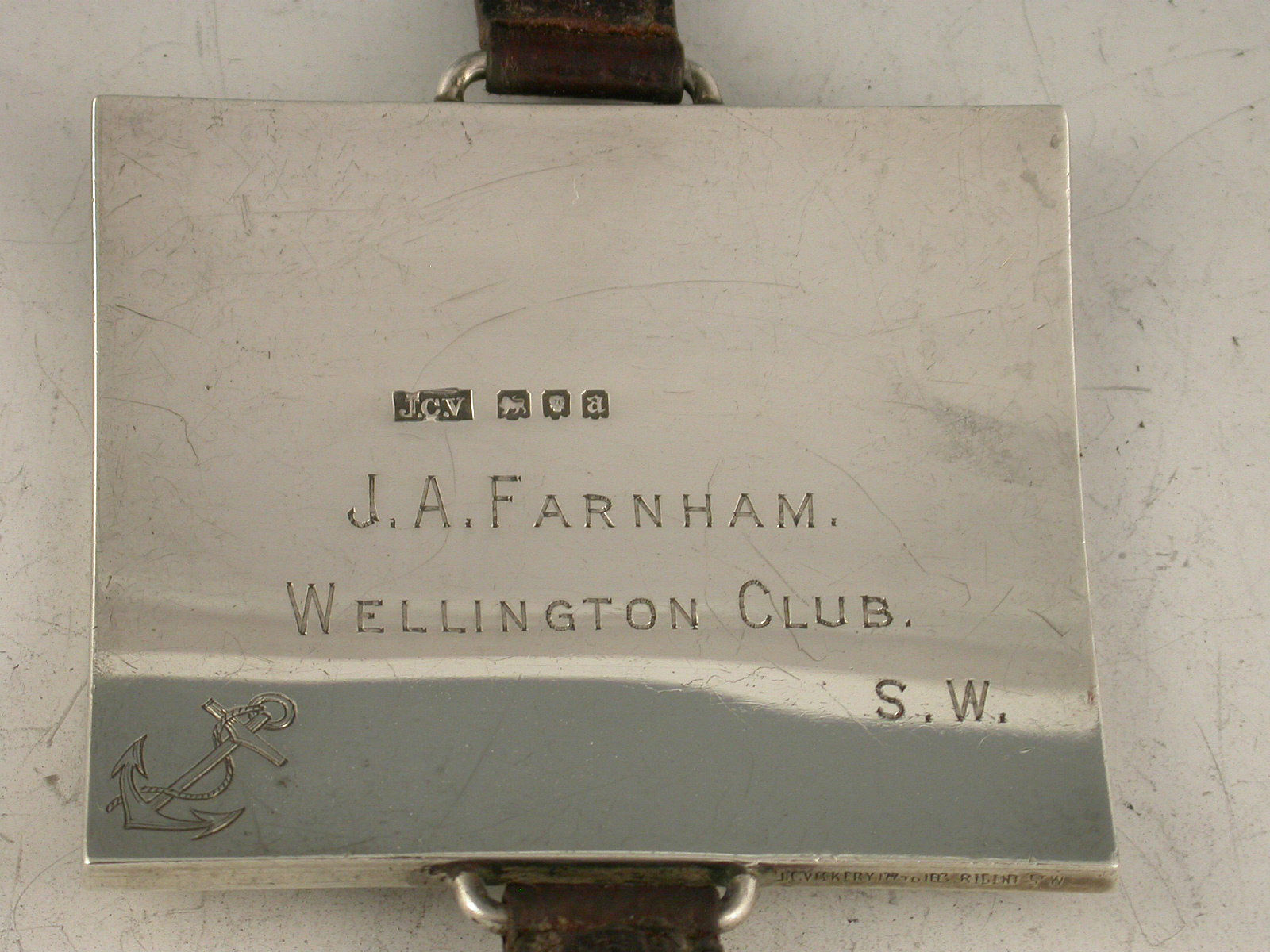 A very unusual George V silver mounted Wrist Aide Memoire or Dance Card, complete with original Rolex leather strap, the curved rectangular pad with removable ivory tablet. The reverse of the silver case engraved ""J.A. Farnham, Wellington Club. S.W"", and also with a fouled anchor.