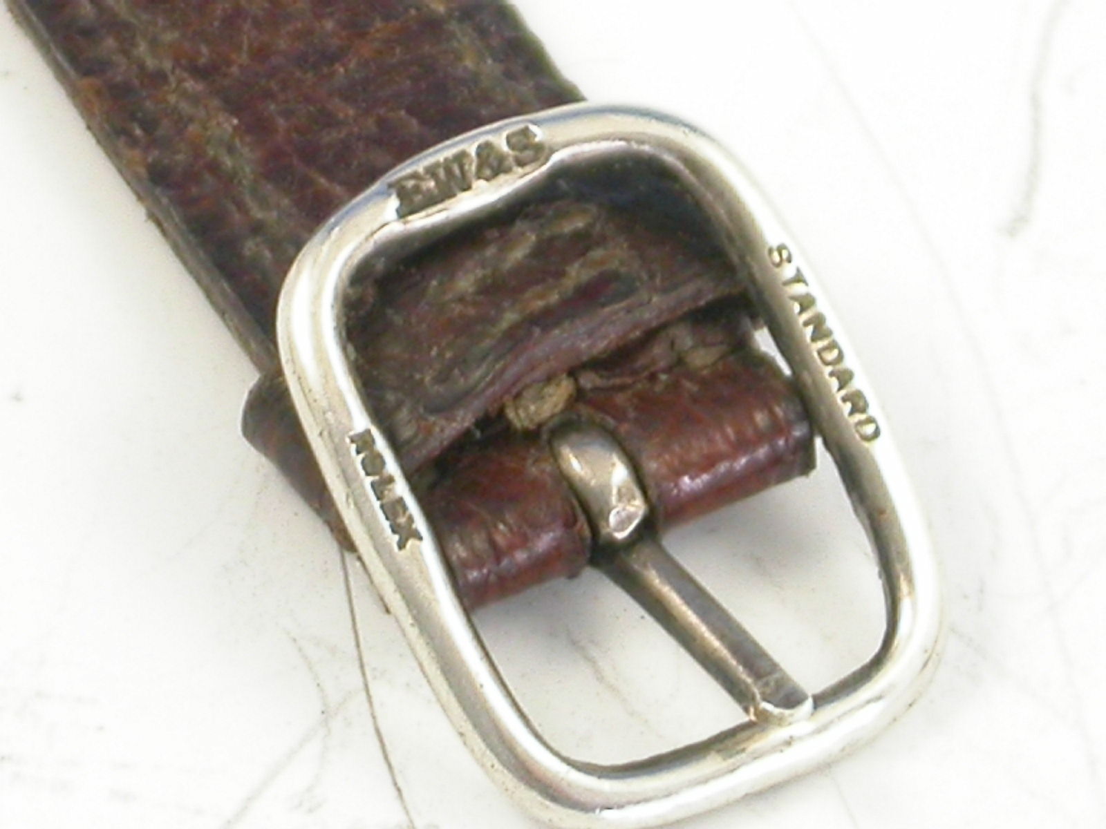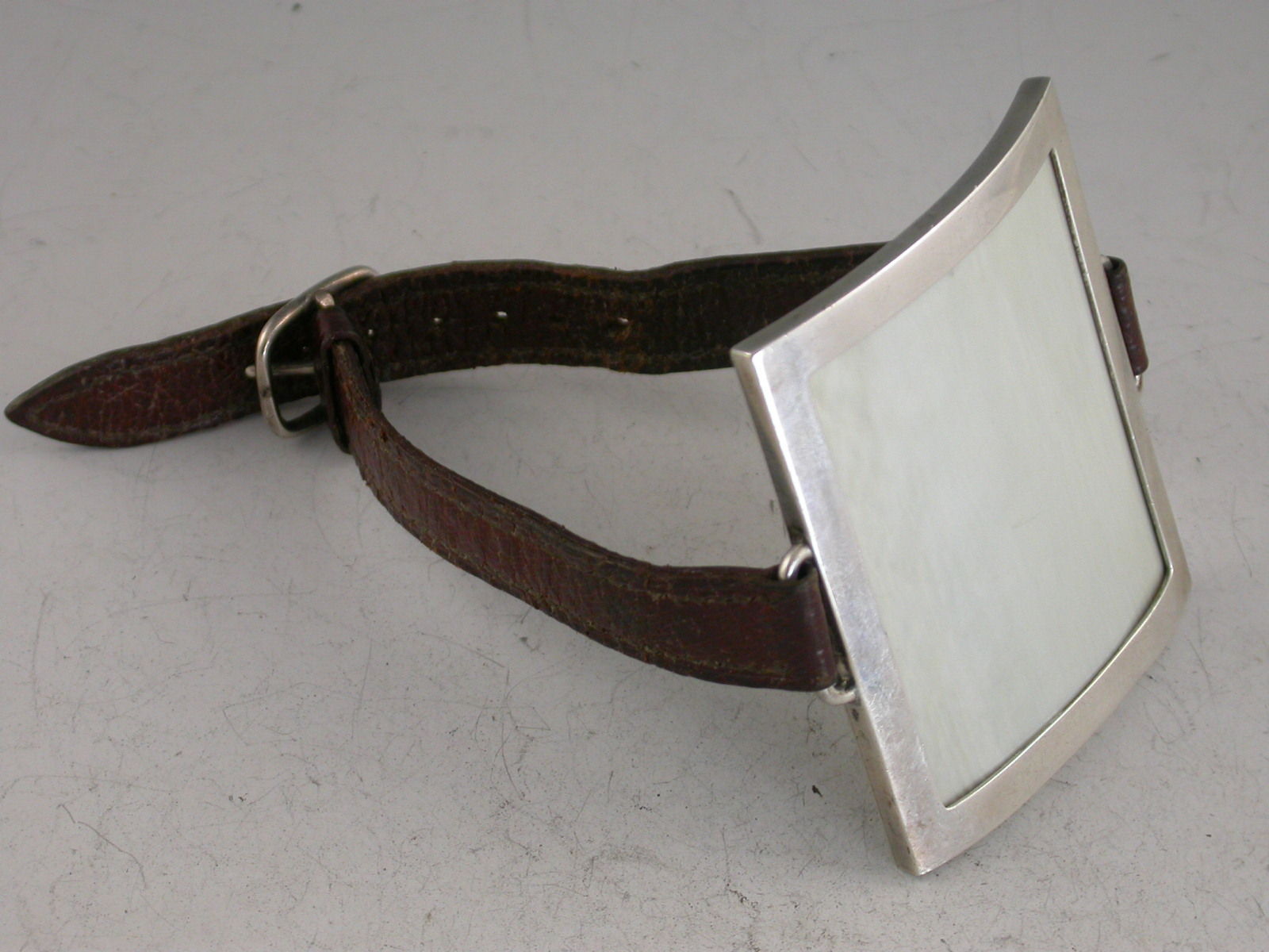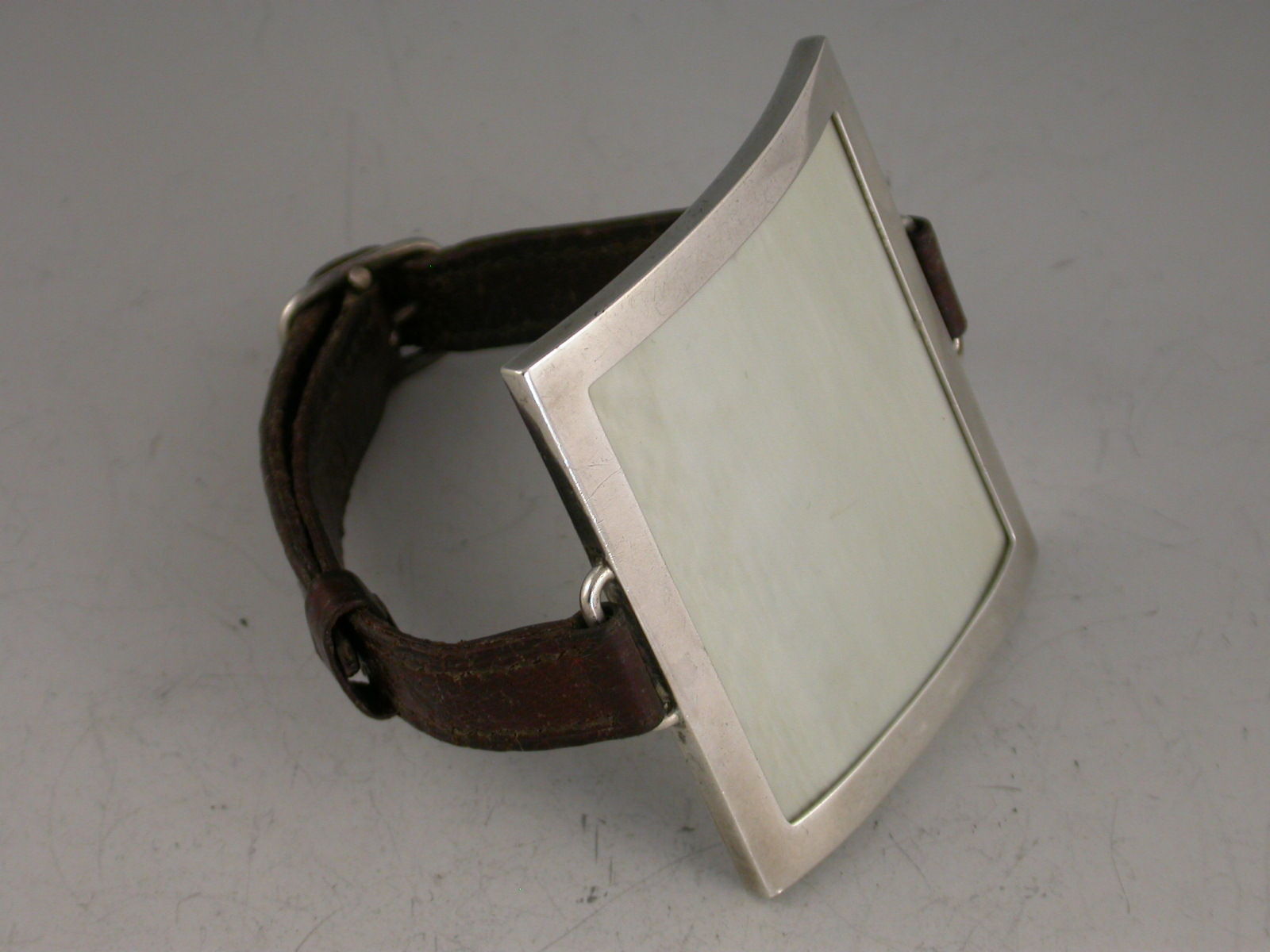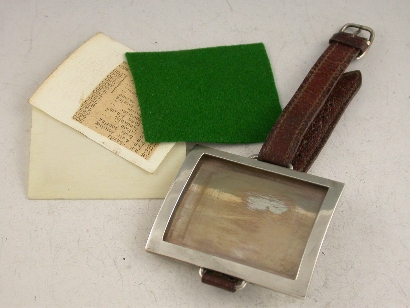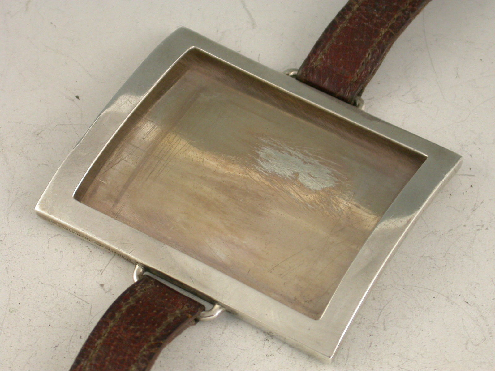 A very unusual George V silver mounted Wrist Aide Memoire or Dance Card, complete with original Rolex leather strap, the curved rectangular pad with removable ivory tablet. The reverse of the silver case engraved ""J.A. Farnham, Wellington Club. S.W"", and also with a fouled anchor.