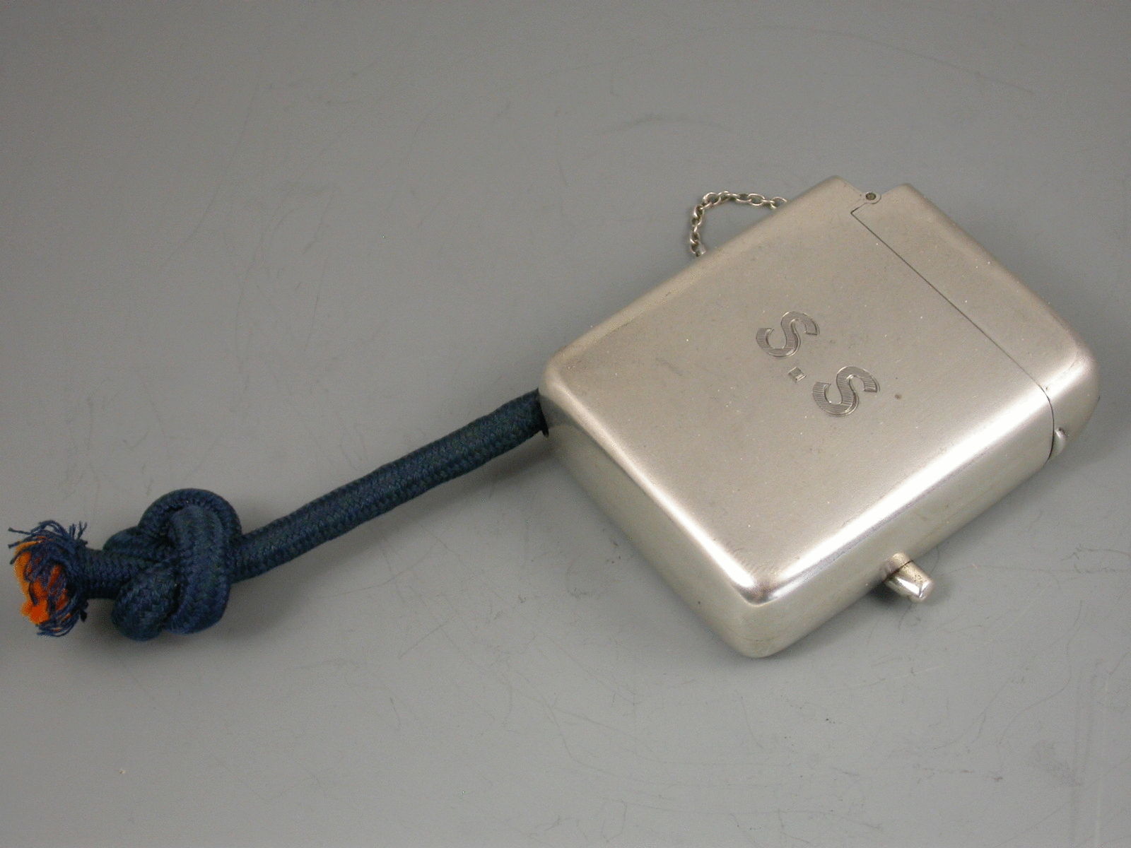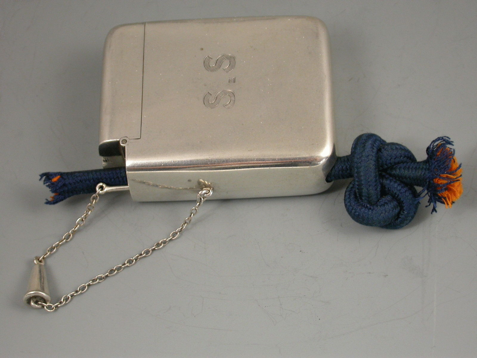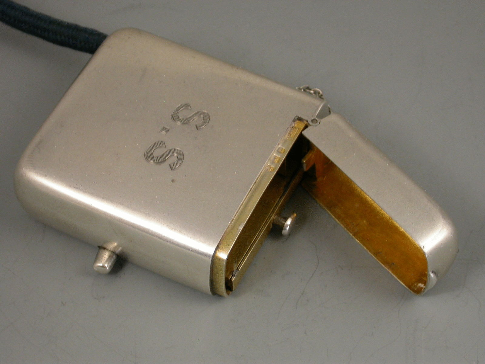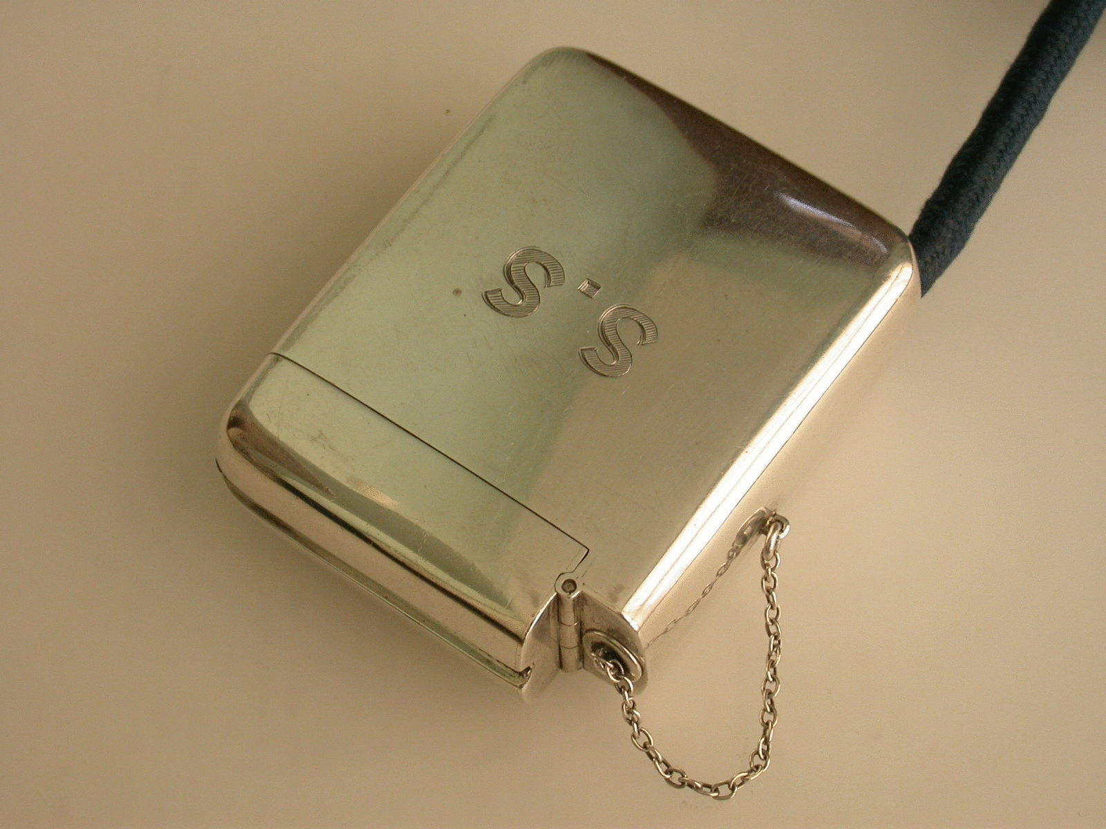 A very unusual and large Edwardian silver heavy duty Vesta Box with slow match or taper tube to one side sealed by a stopper on a chain. Two manually operated push button counter devices (one inside the cover) operating rotating counter dials, one for tens and one for units, the numbers appearing in oval apertures to one side. The front engraved with initials 'S.S'. Possibly a game counter for shot birds or perhaps a device for counting passengers boarding a ship.