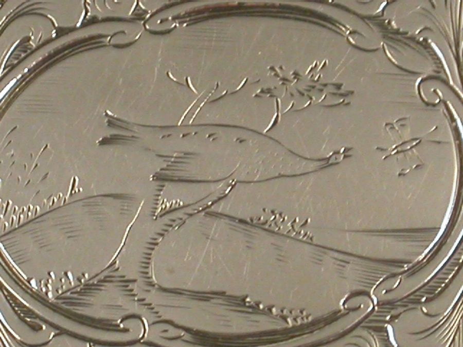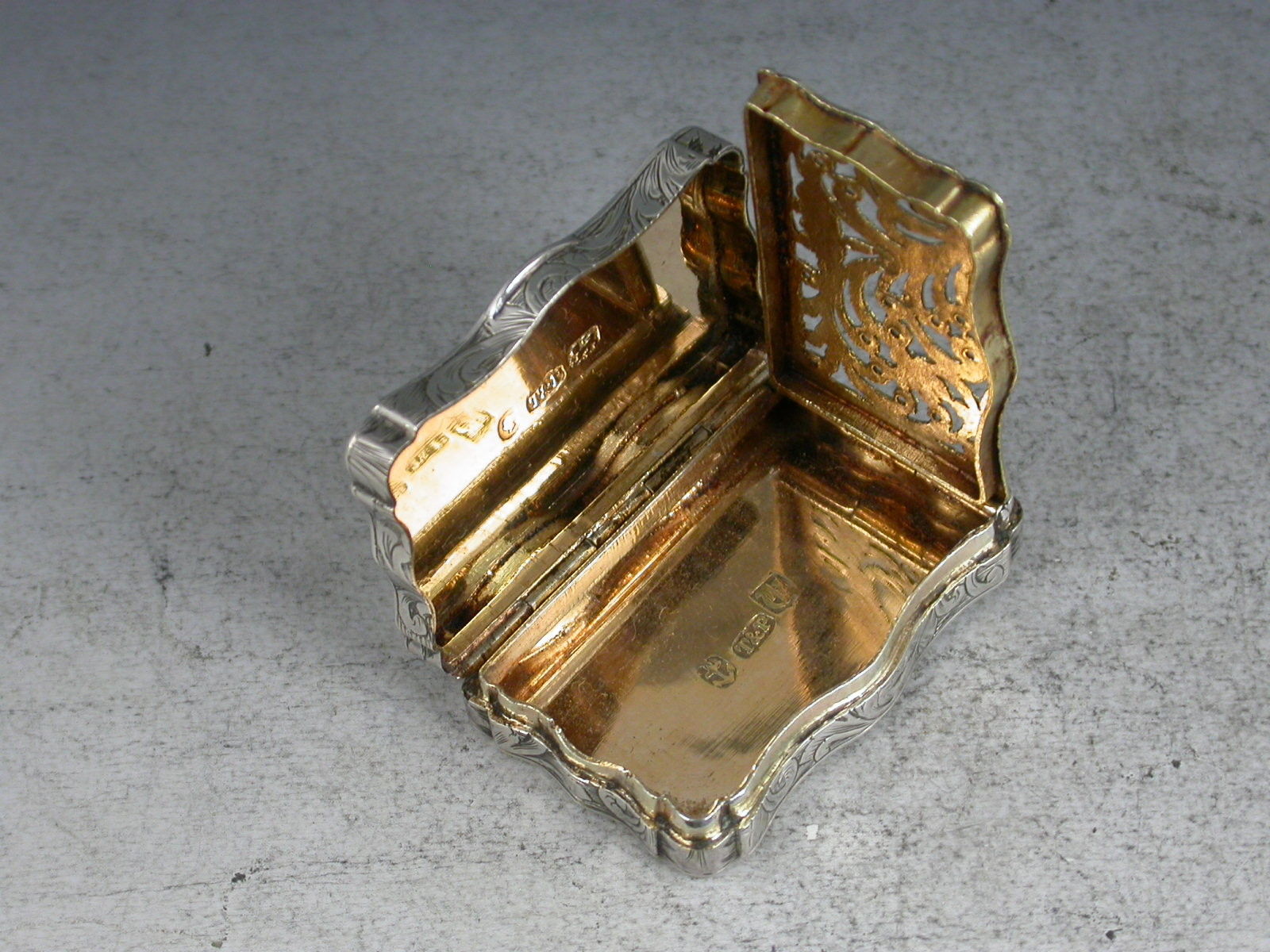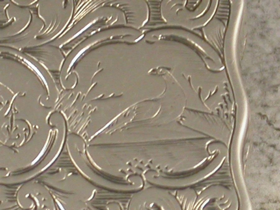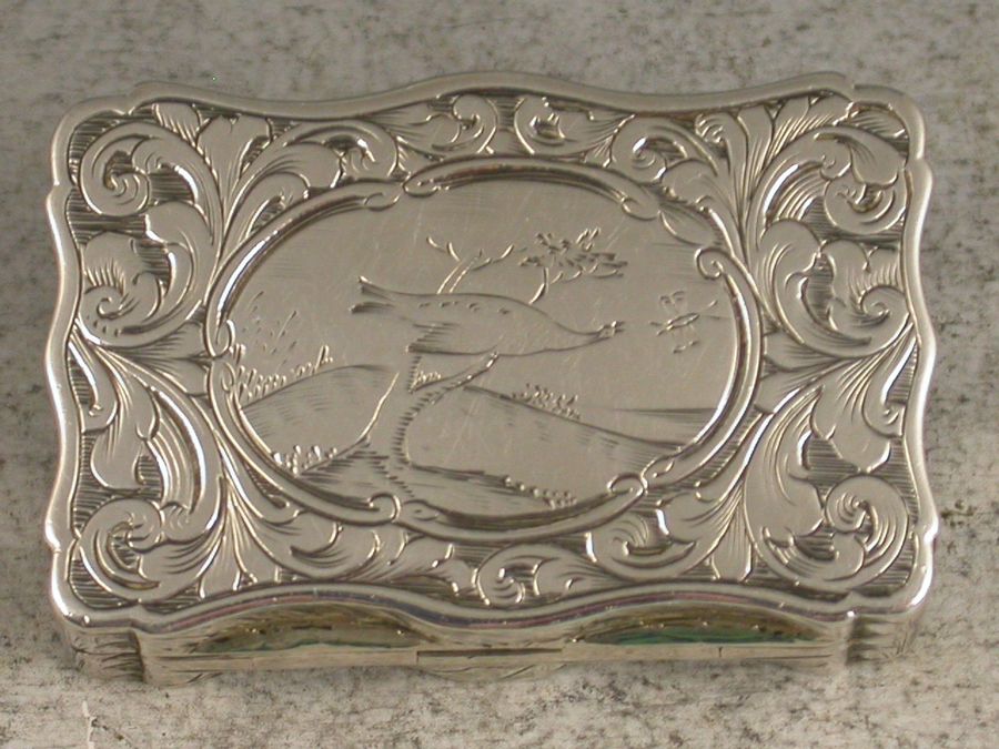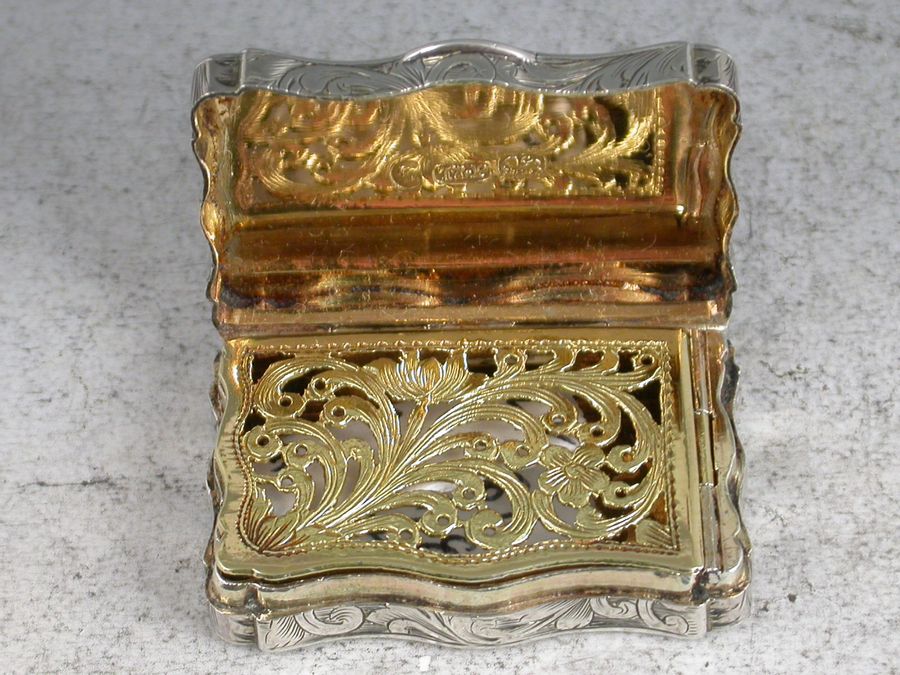 An unusual Victorian silver Vinaigrette of serpentine shaped rectangular form, the base and lid engraved with vingettes depicting exotic birds and fruit. The silver gilt interior with foliate scroll pierced grill.