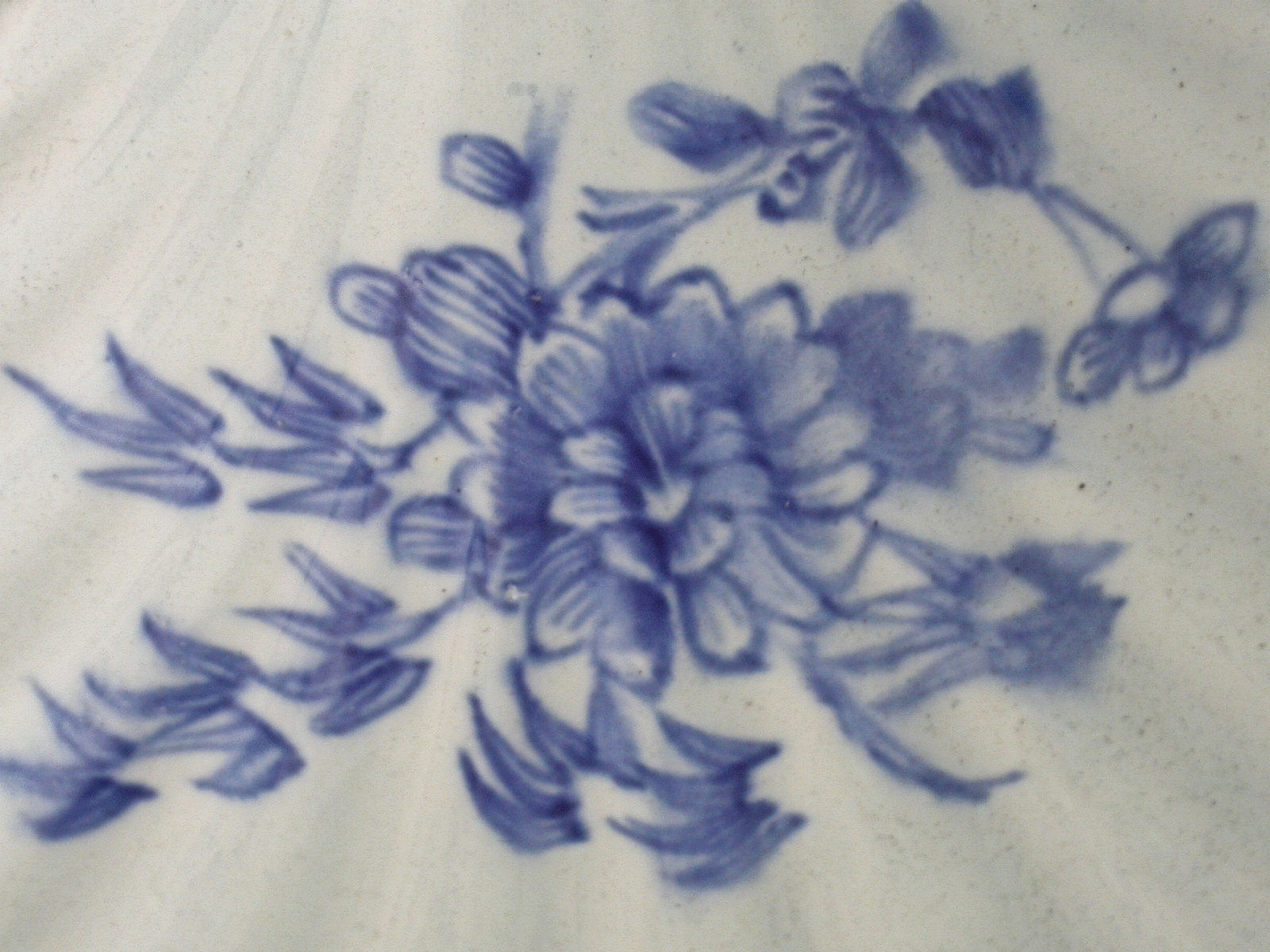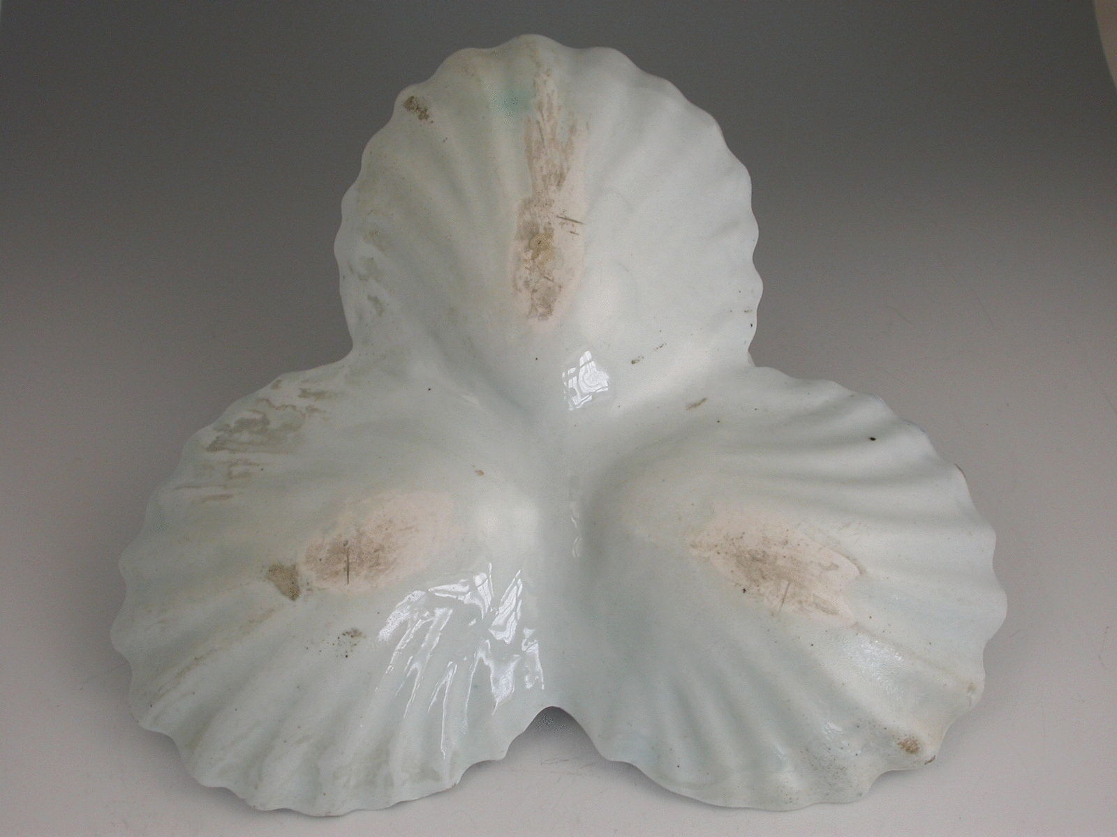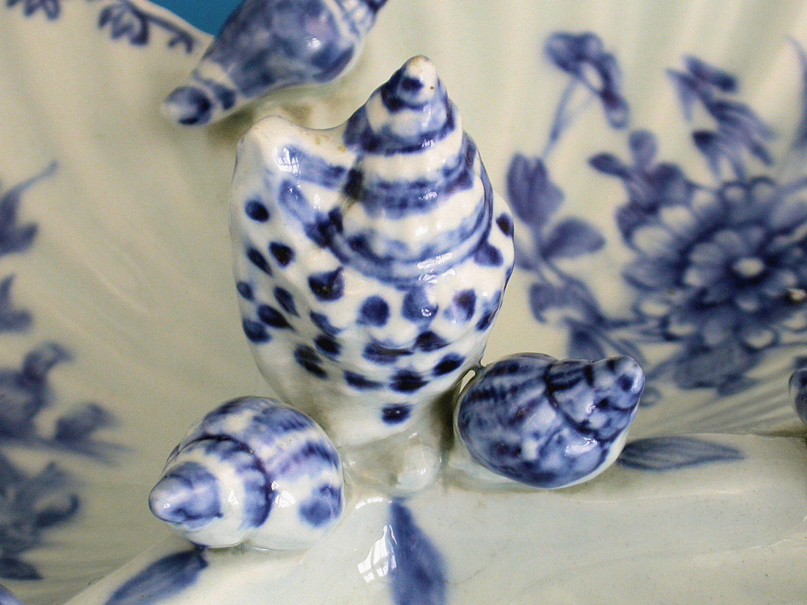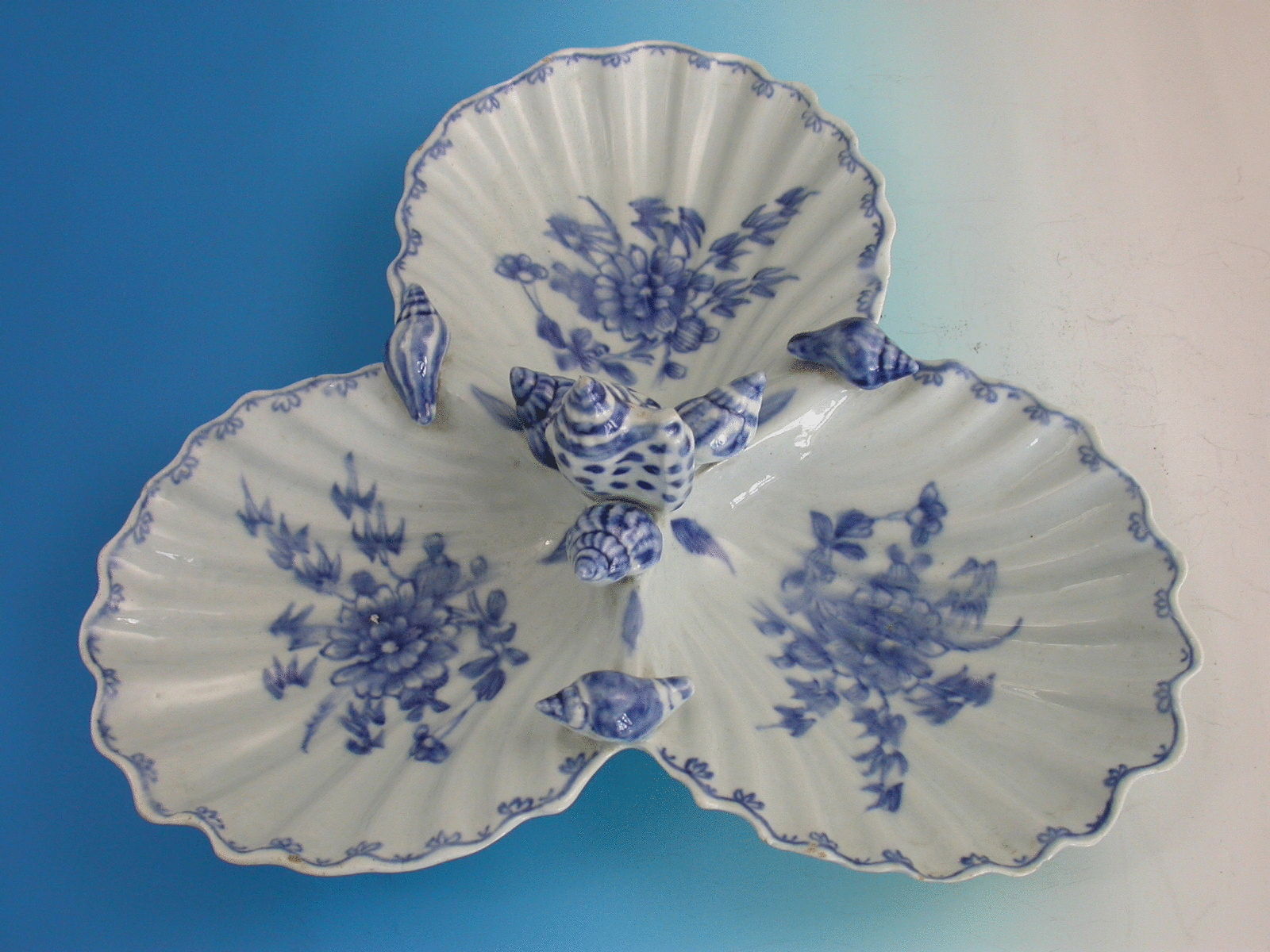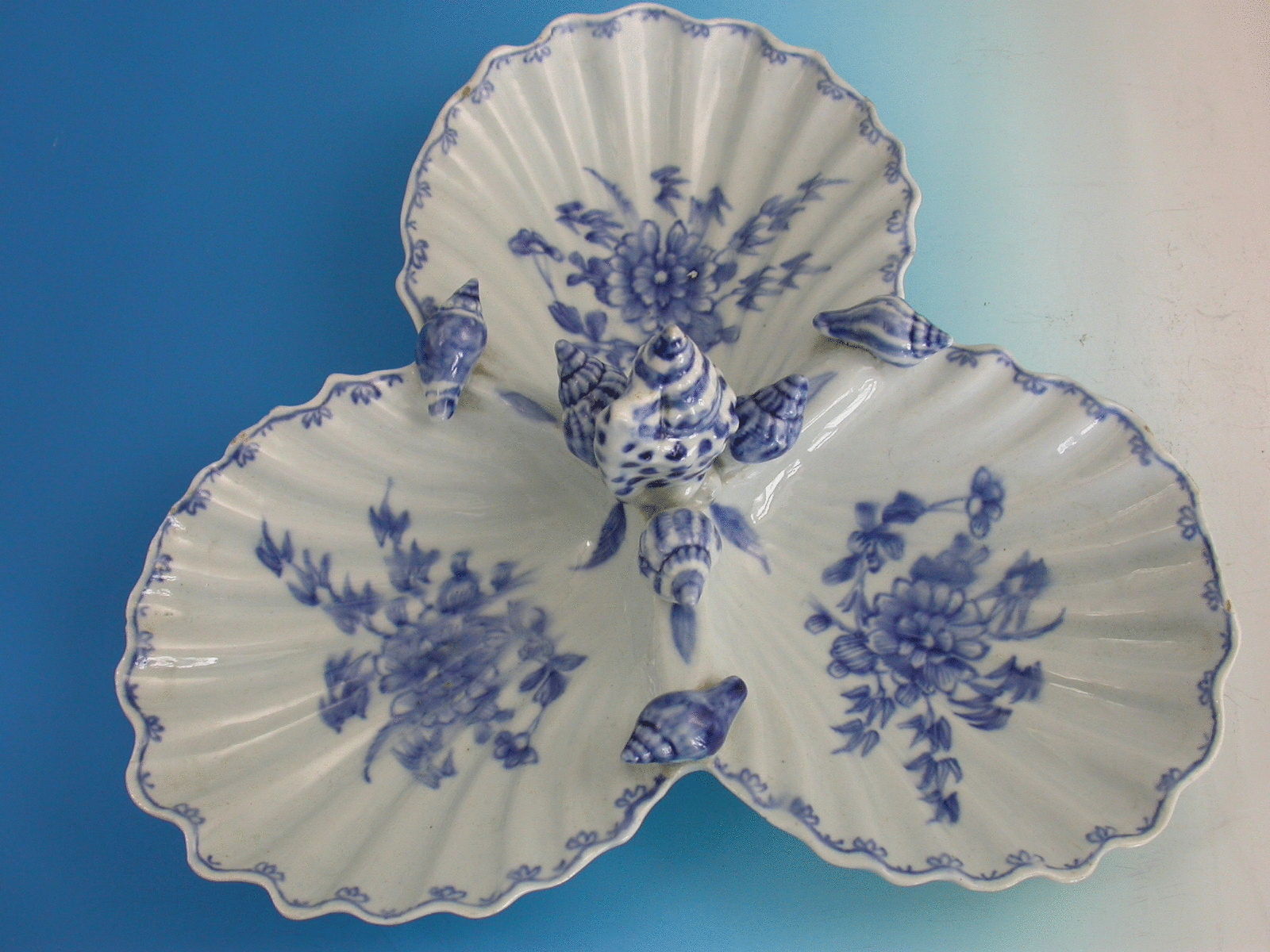 A very rare Vauxhall Table Pickle Stand formed from three shallow scallop shells, the central finial formed from a cockle shell flanked by three smaller shells, painted in under-glaze sticky blue with foliate sprays within pendant leaf rims.