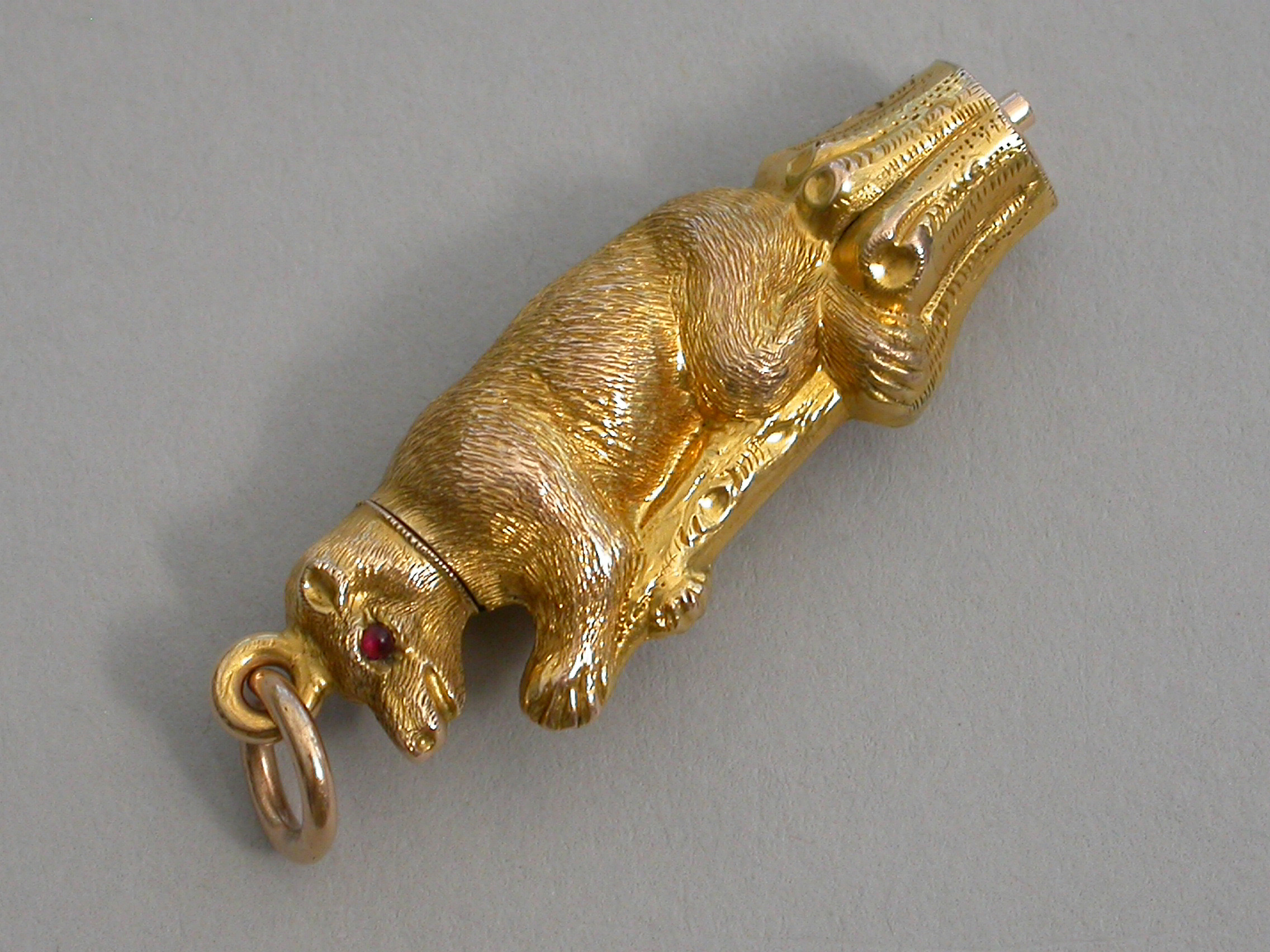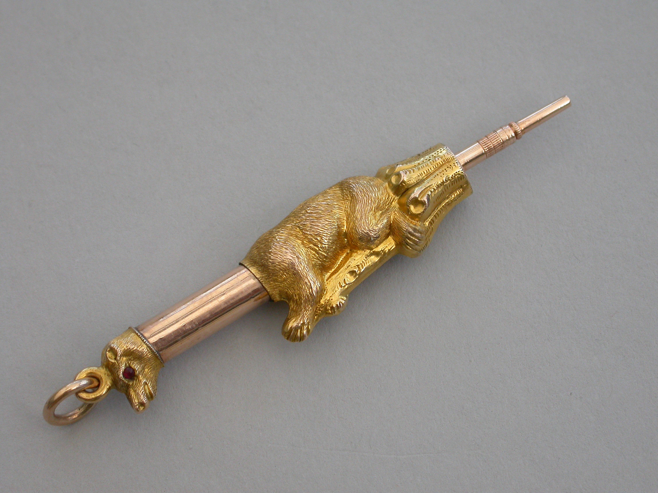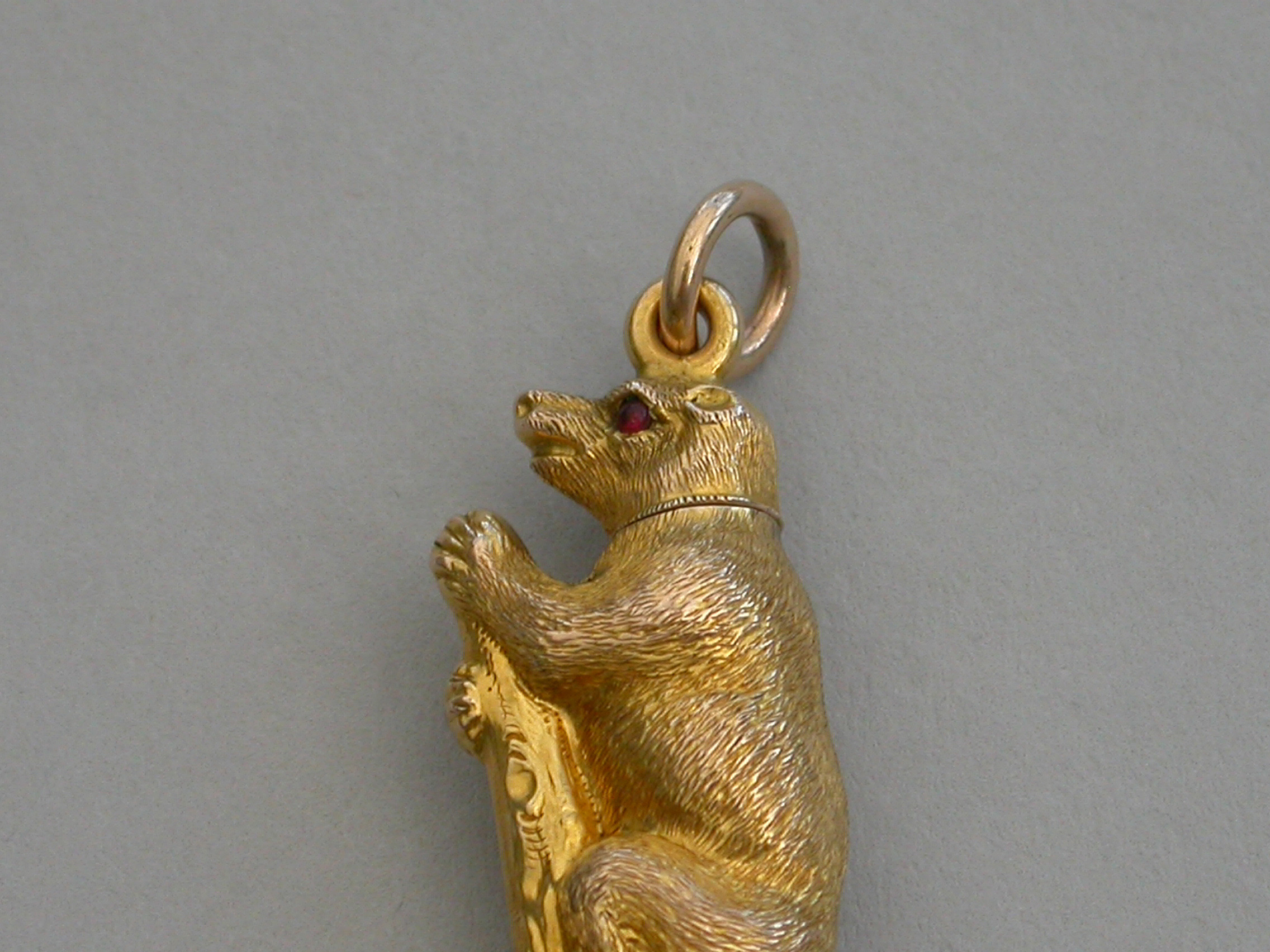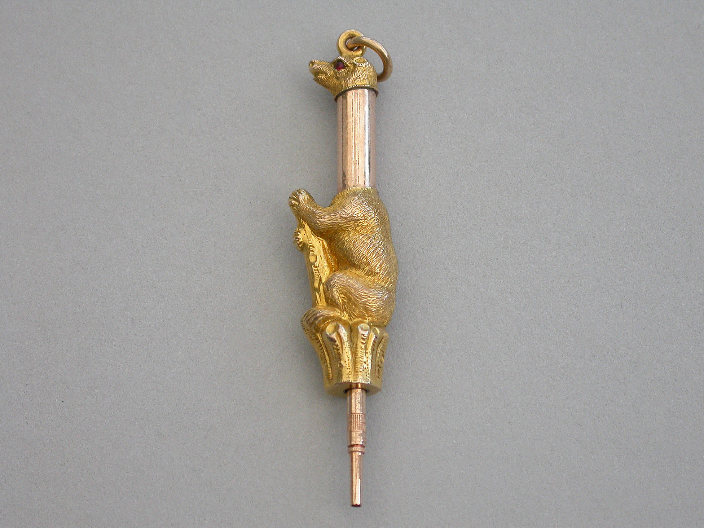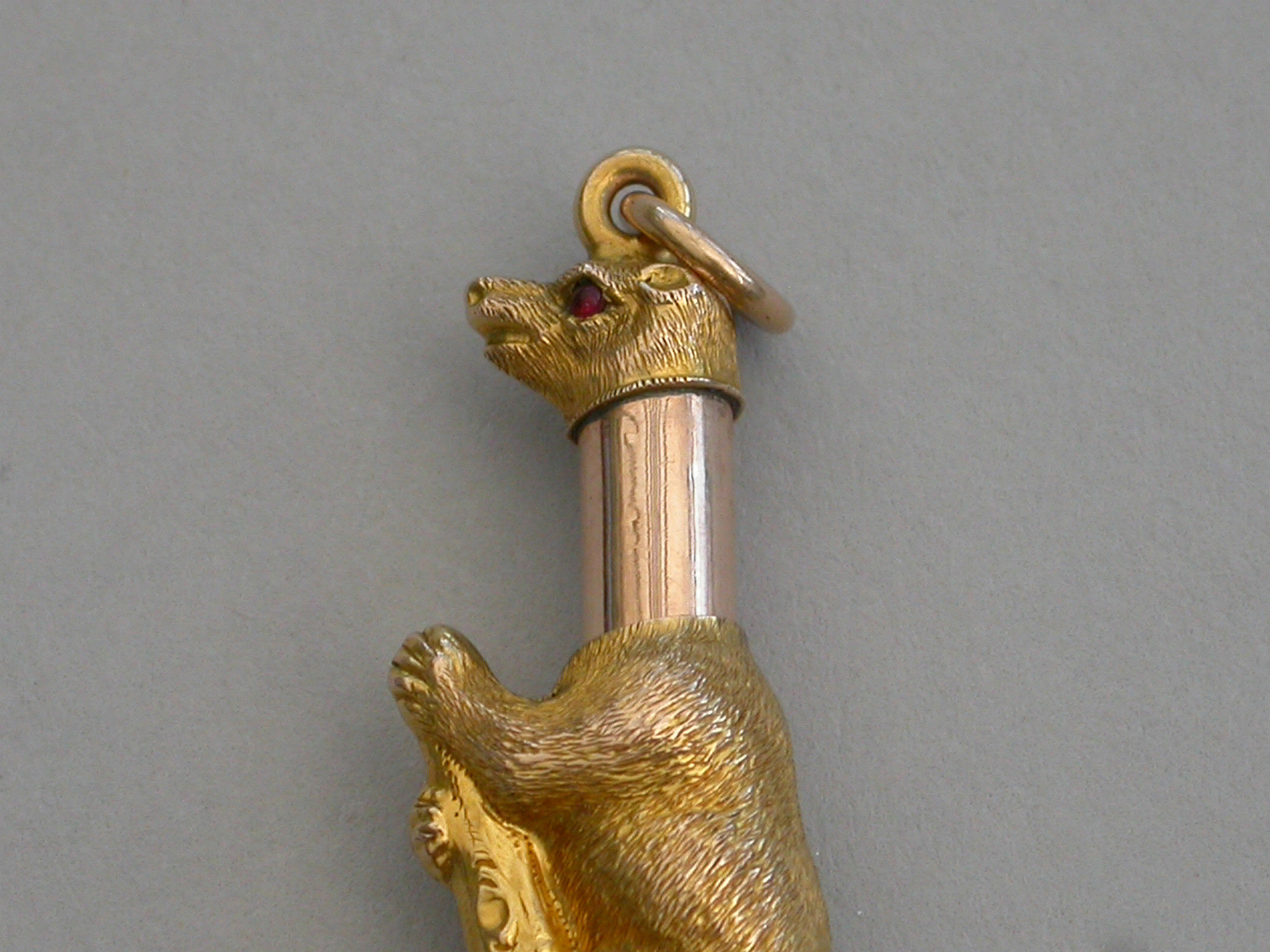 An extremely rare Victorian 12 carat gold (tested) novelty Propelling Pencil made in the form of a Bear holding a Ragged Staff (the crest of the Earls of Warwick and Warwickshire), with ruby eyes and attached suspension ring.