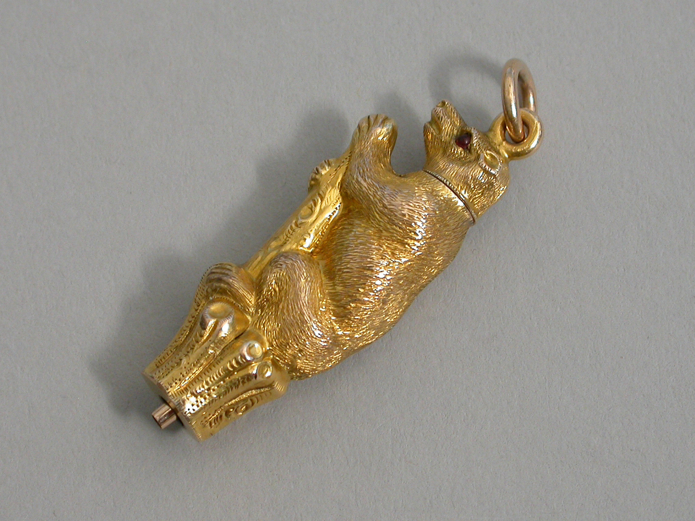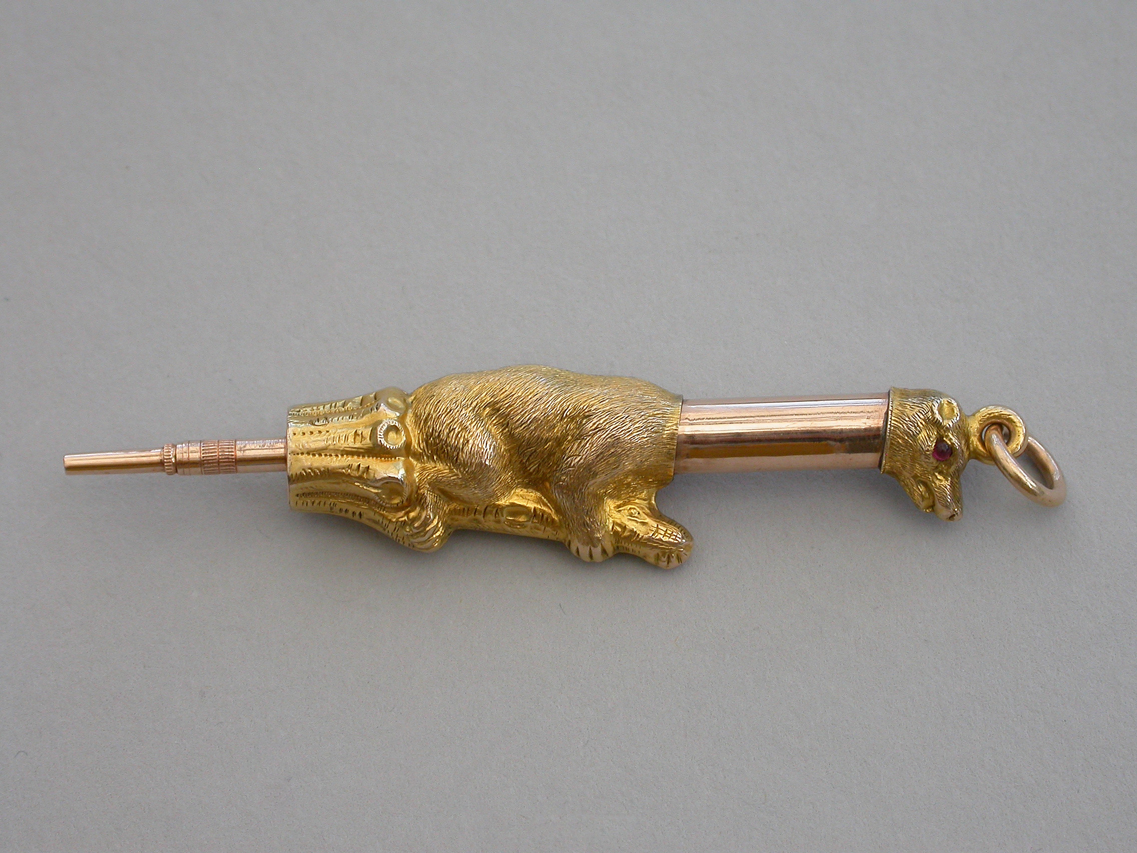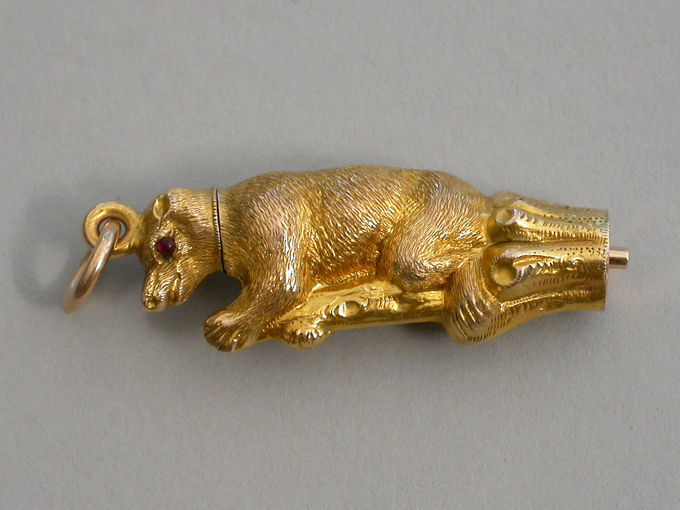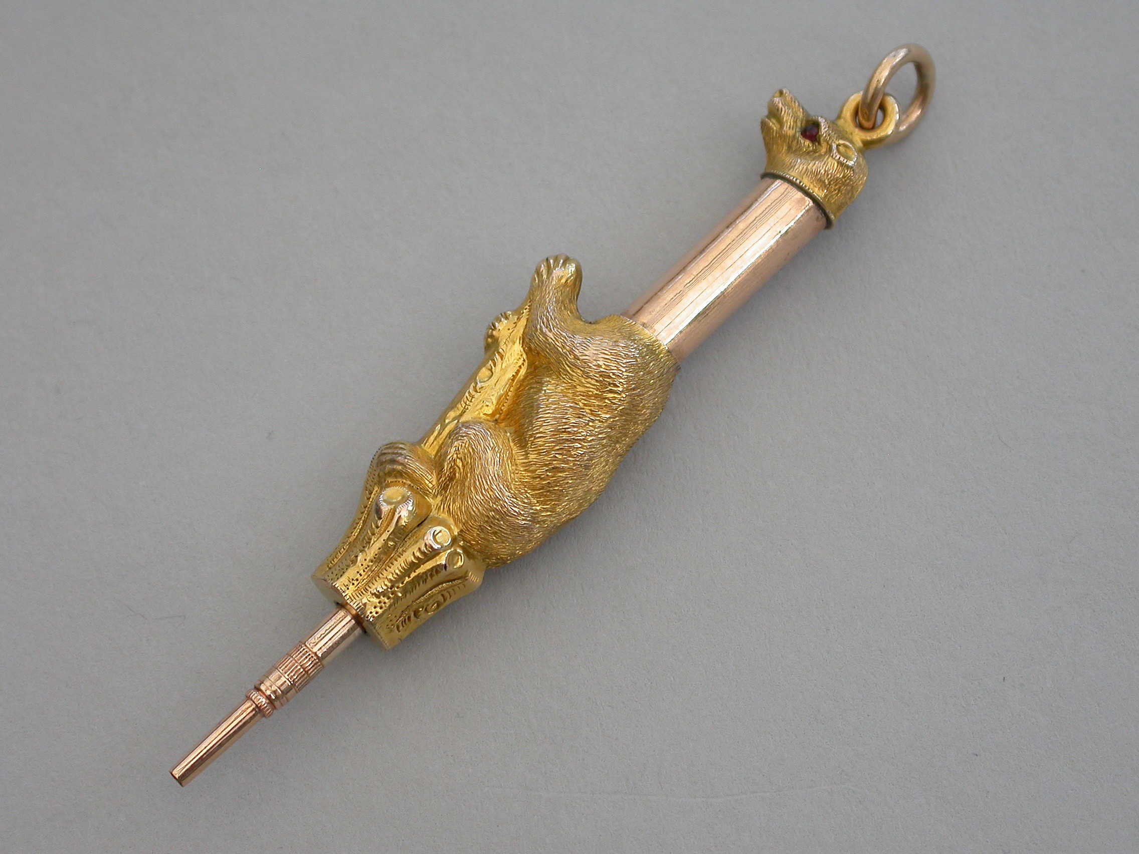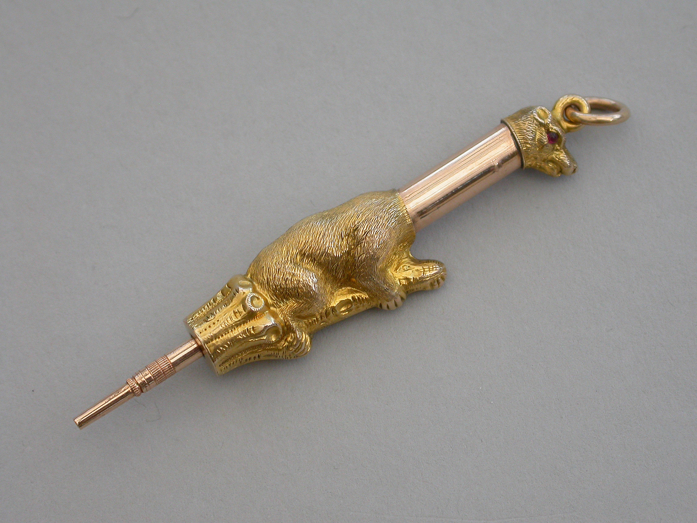 An extremely rare Victorian 12 carat gold (tested) novelty Propelling Pencil made in the form of a Bear holding a Ragged Staff (the crest of the Earls of Warwick and Warwickshire), with ruby eyes and attached suspension ring.