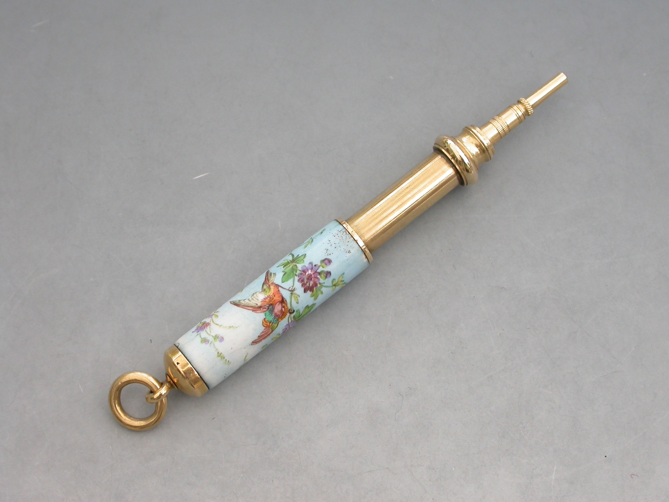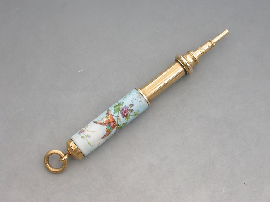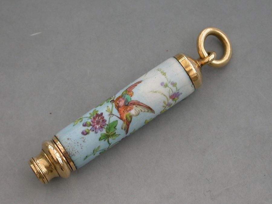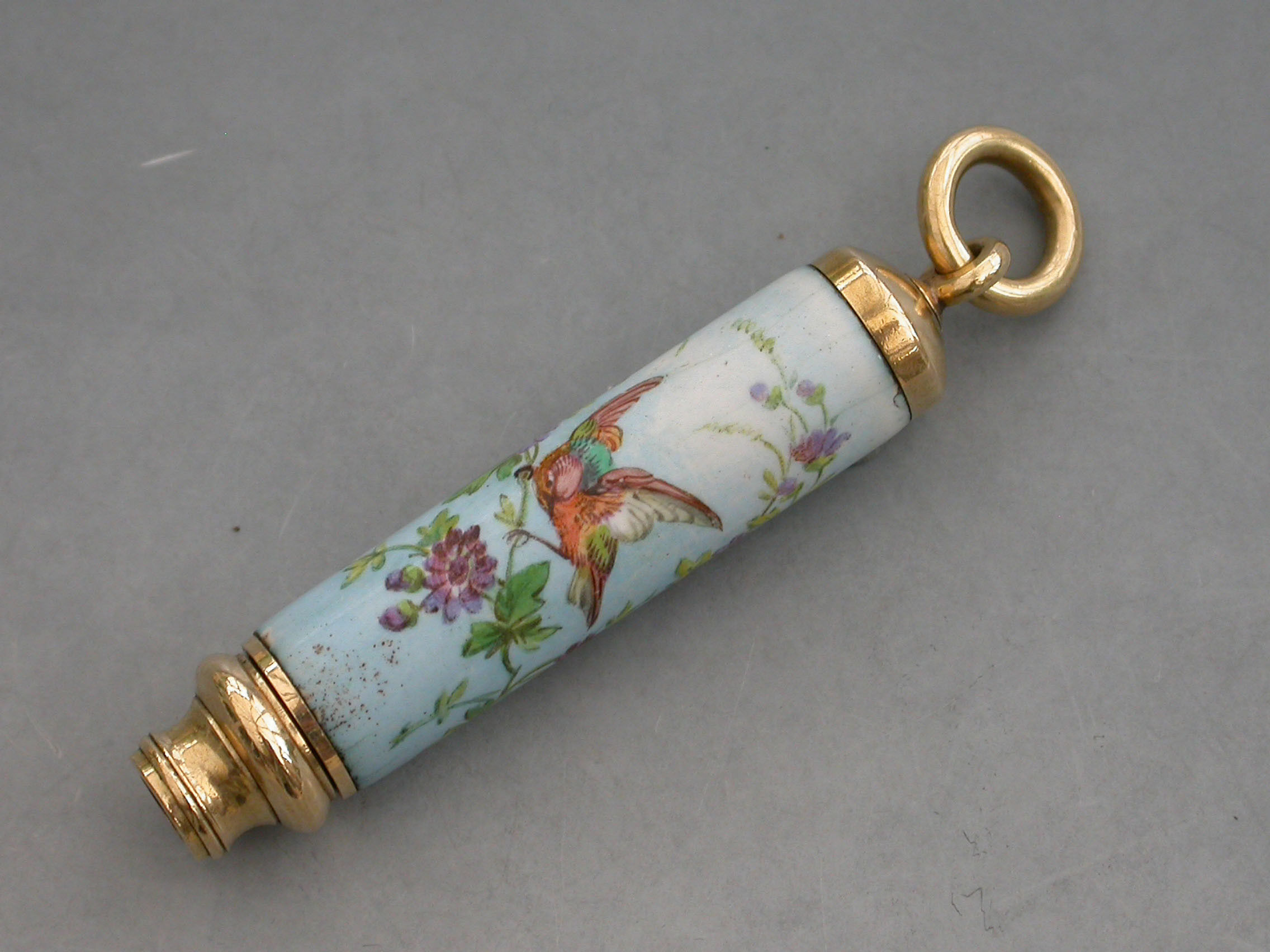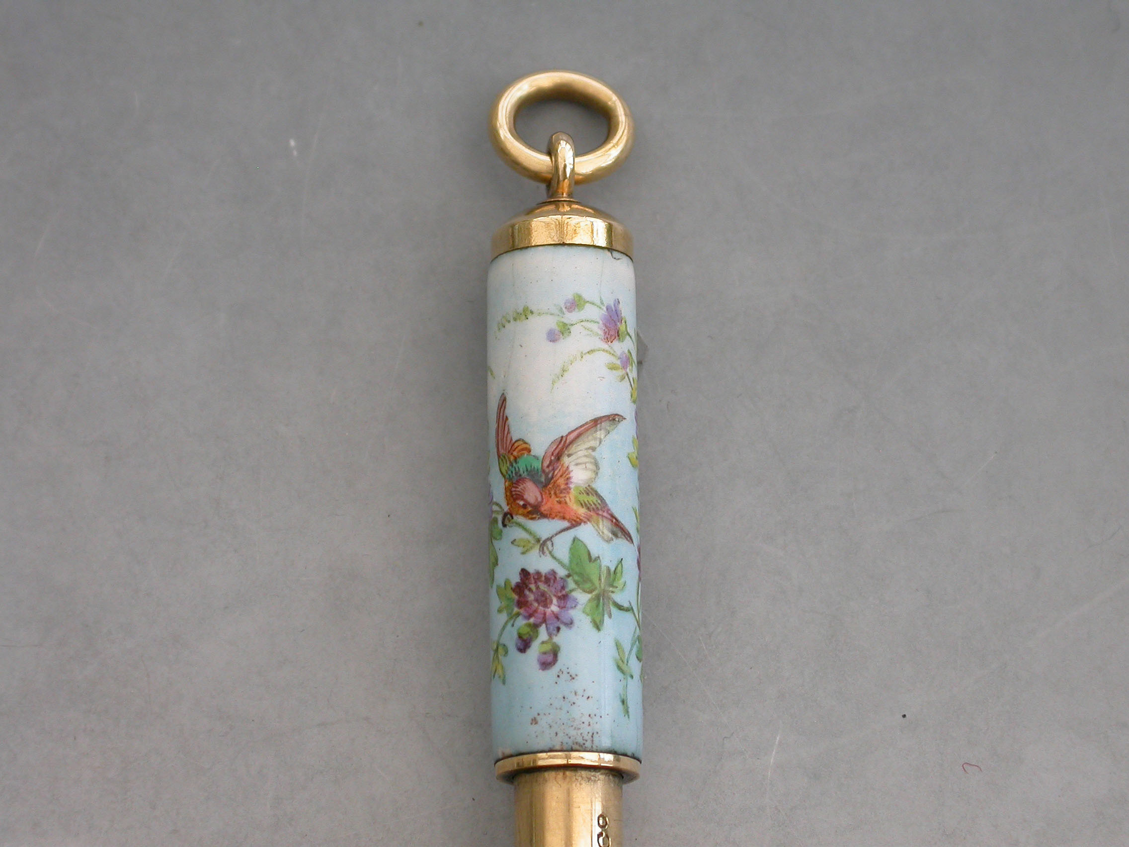 A rare Victorian 16 carat gold and enamel telescopic Propelling Pencil with attached suspension ring. The body with sky blue enamelled case decorated with finches and flowers.