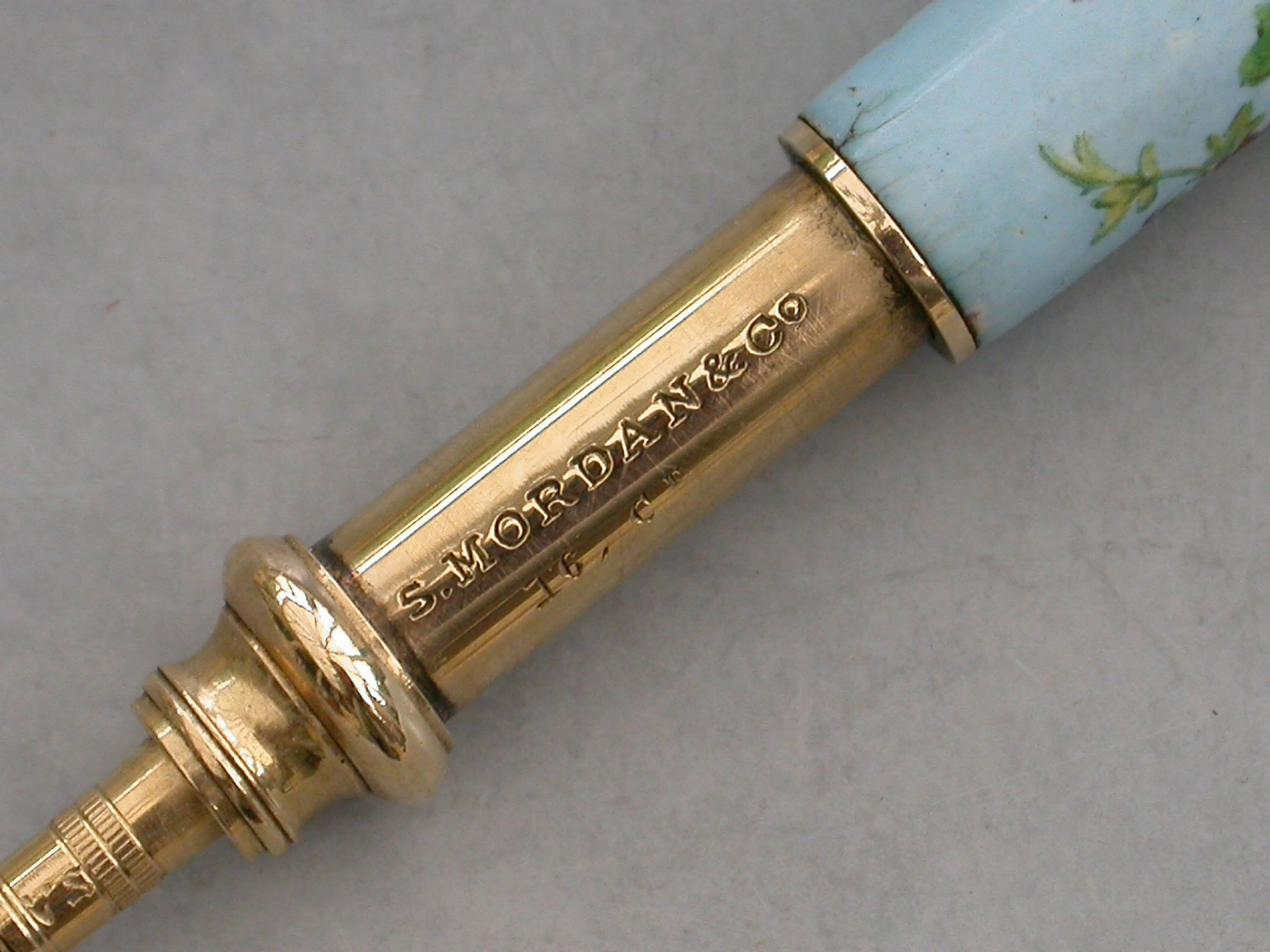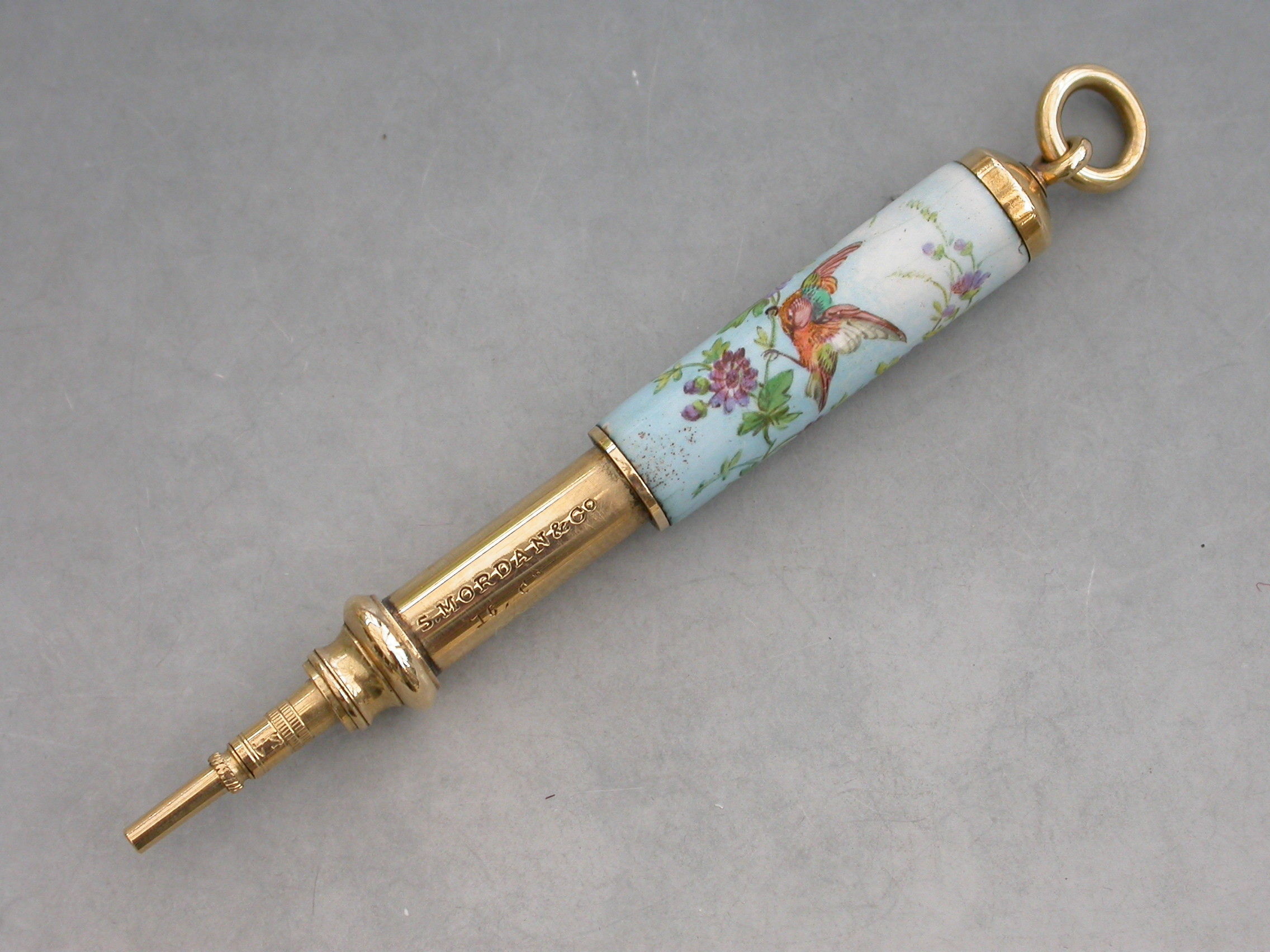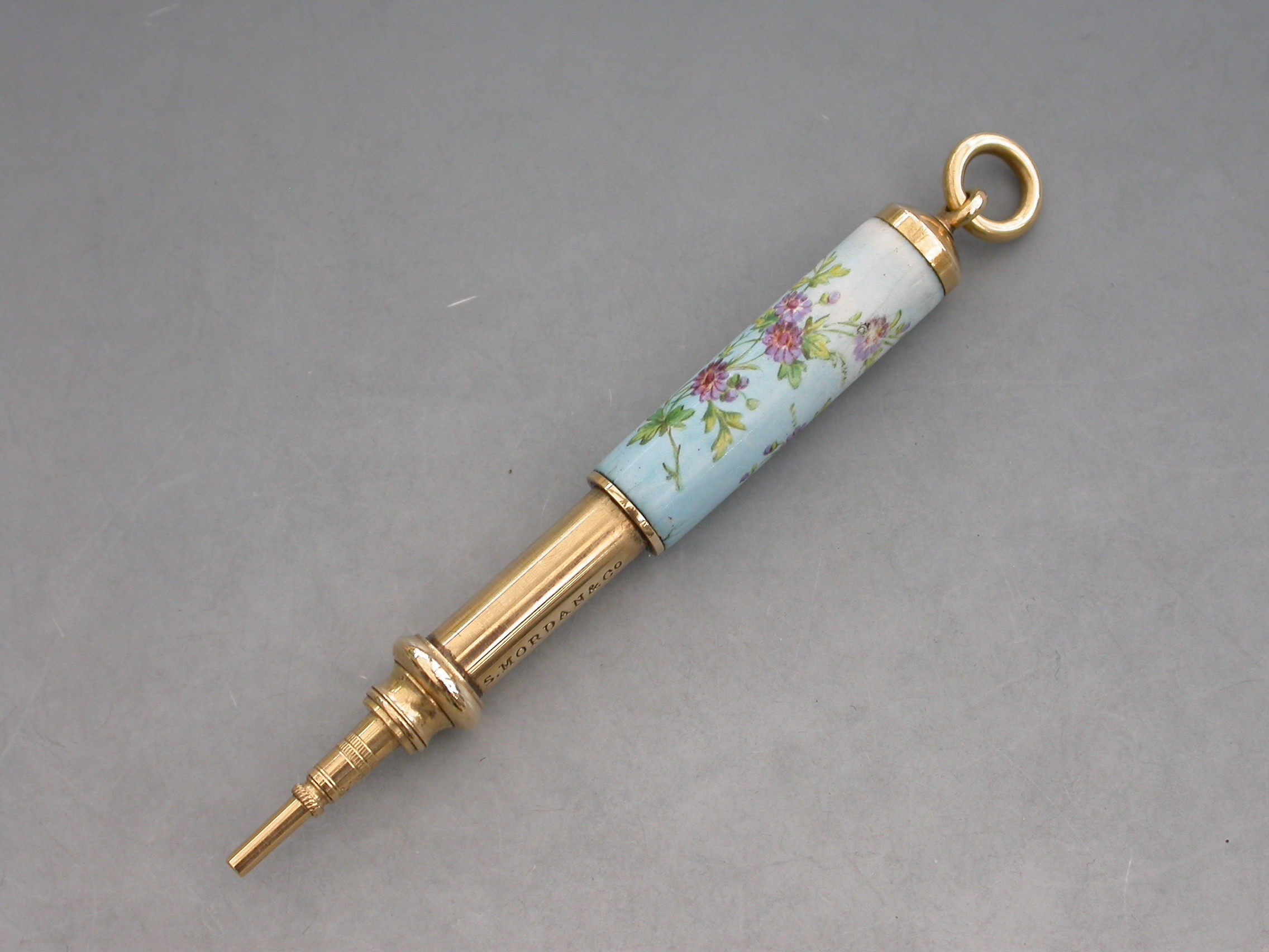 A rare Victorian 16 carat gold and enamel telescopic Propelling Pencil with attached suspension ring. The body with sky blue enamelled case decorated with finches and flowers.